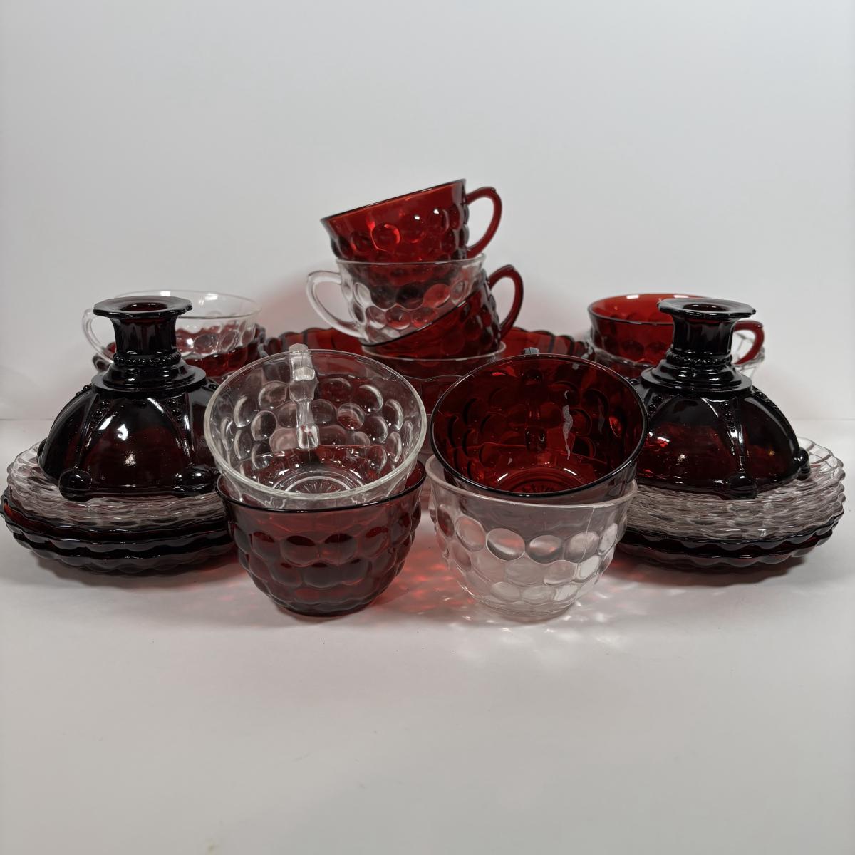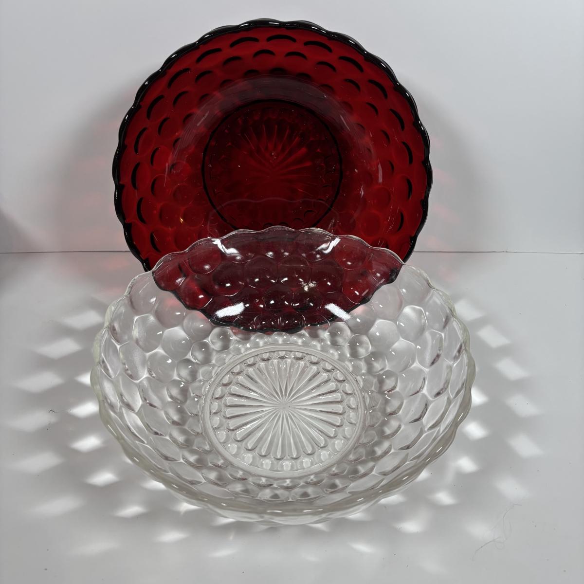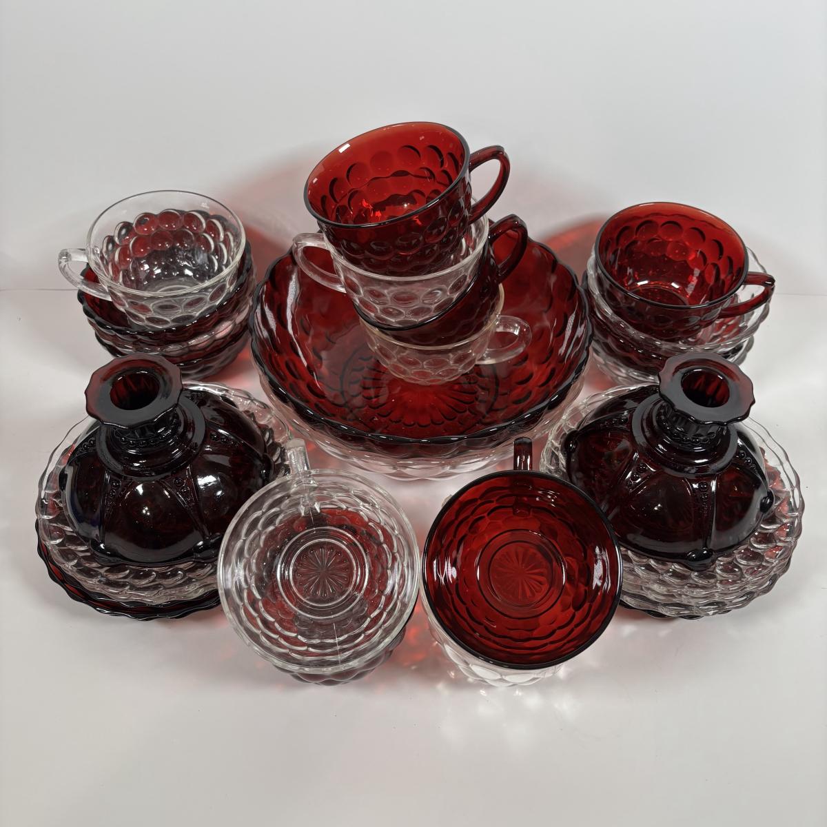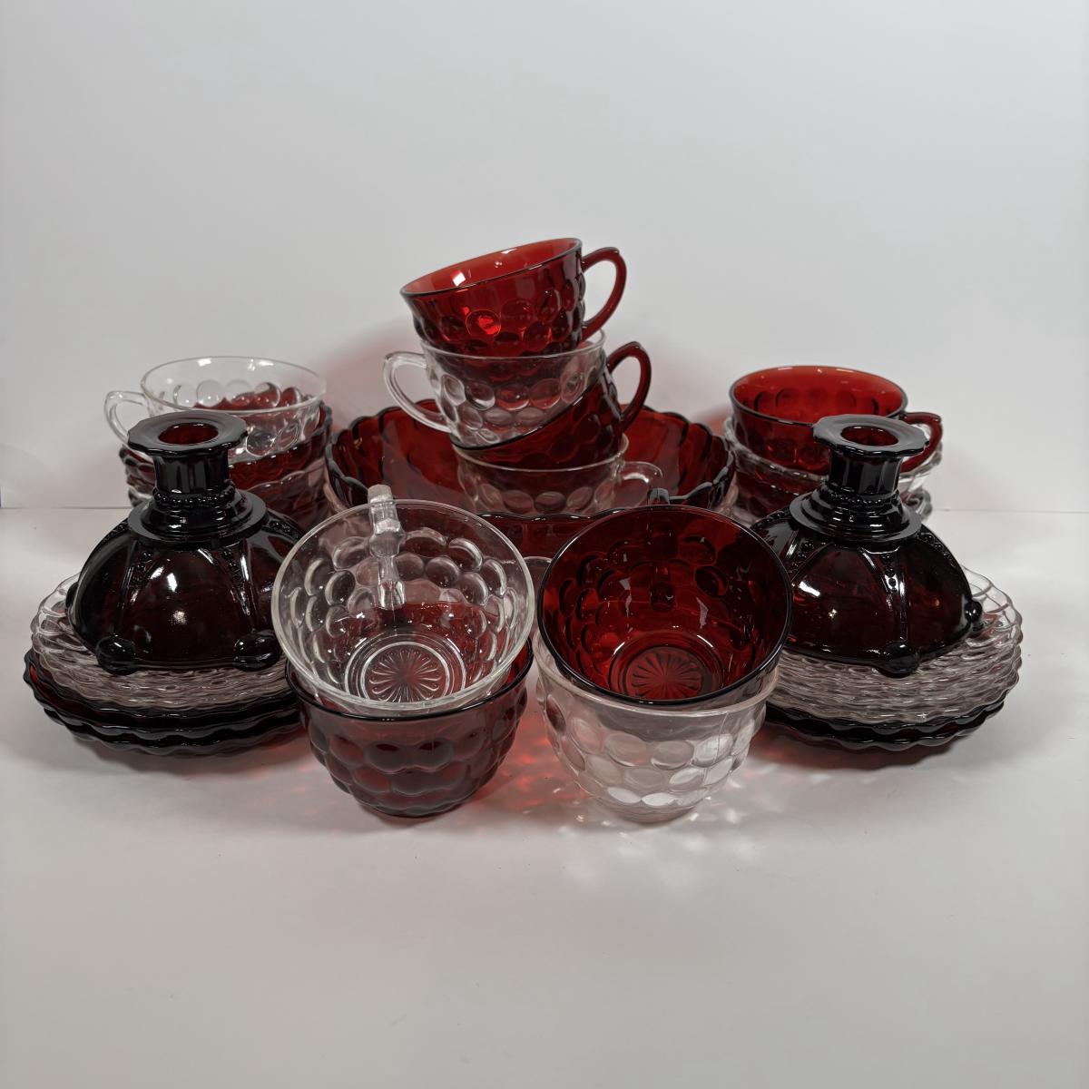 LOT 396: Ruby Red & Clear Bubble Glass Collection & "Oyster and Pearl" Style Depression Glass Candlestick Holders
