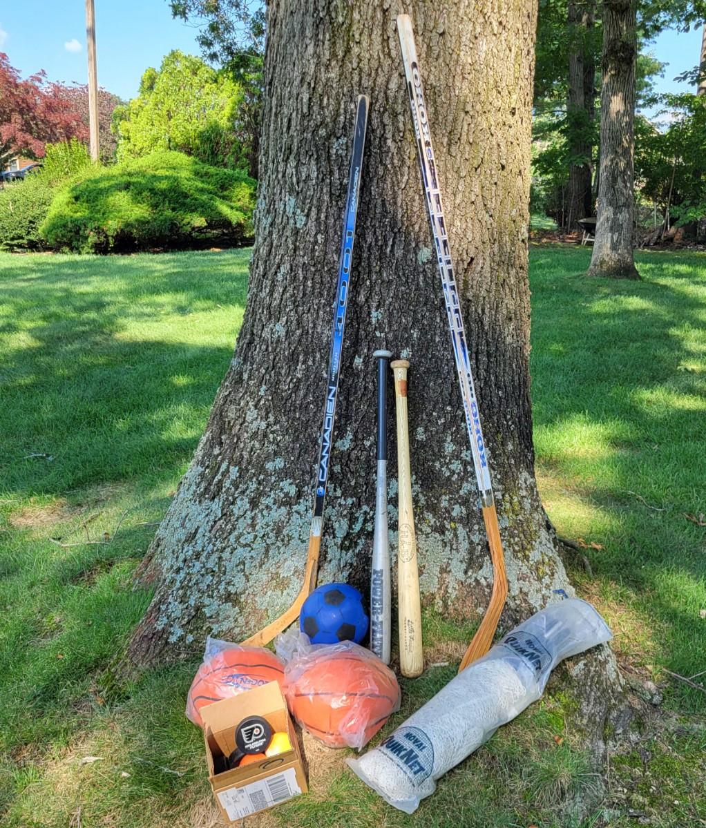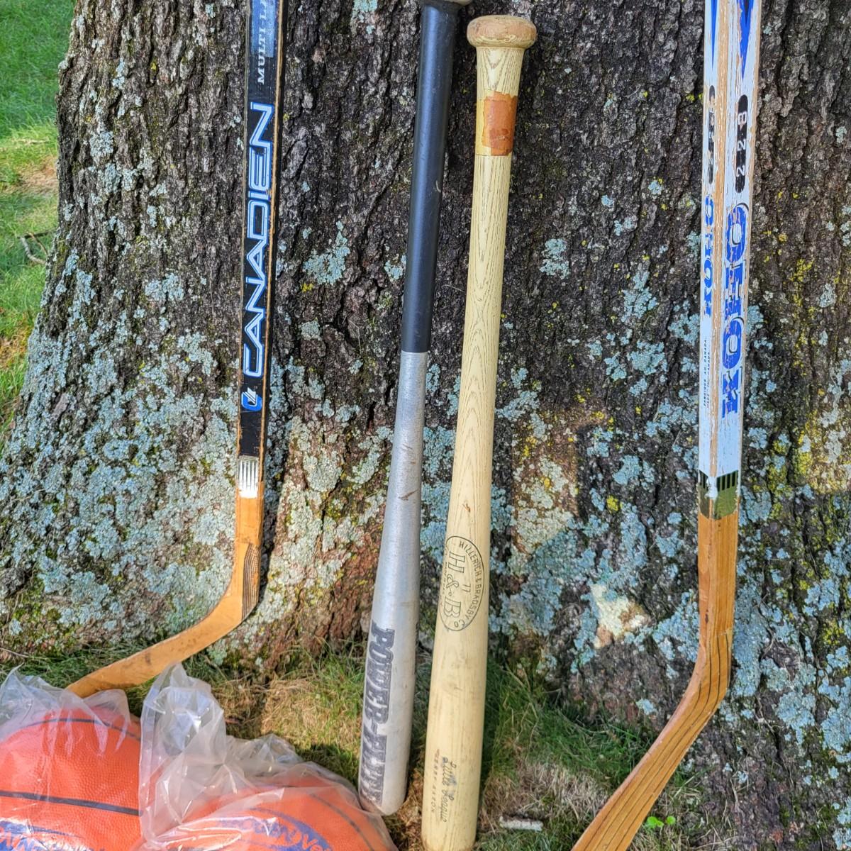 LOT 20G: Lot of Sporting Equipment Including Hockey Sticks, Baseball Bats and More