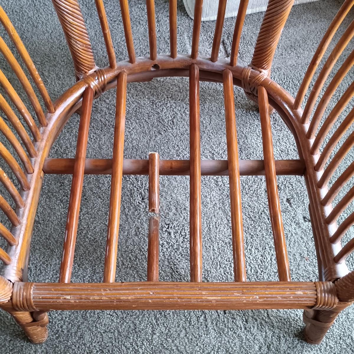One of the chairs has a broken slat in the seat.