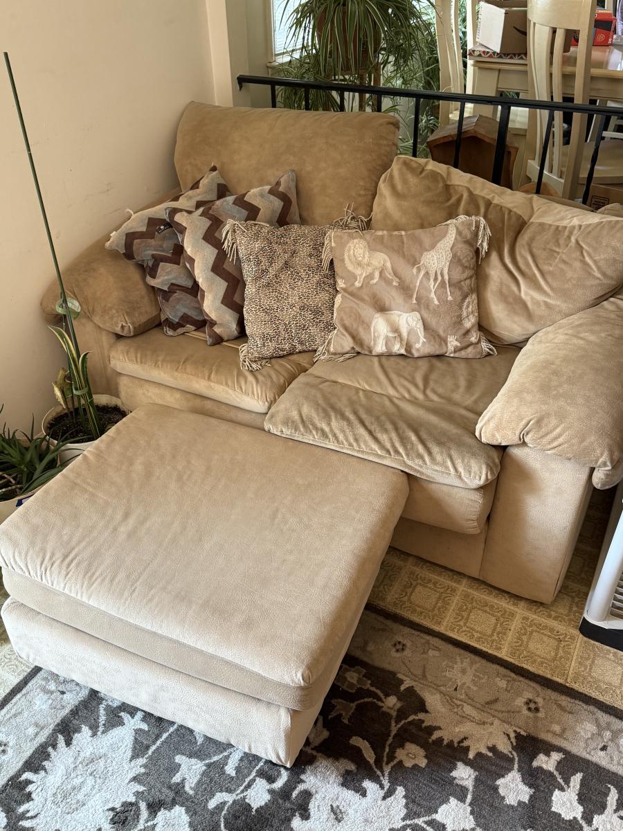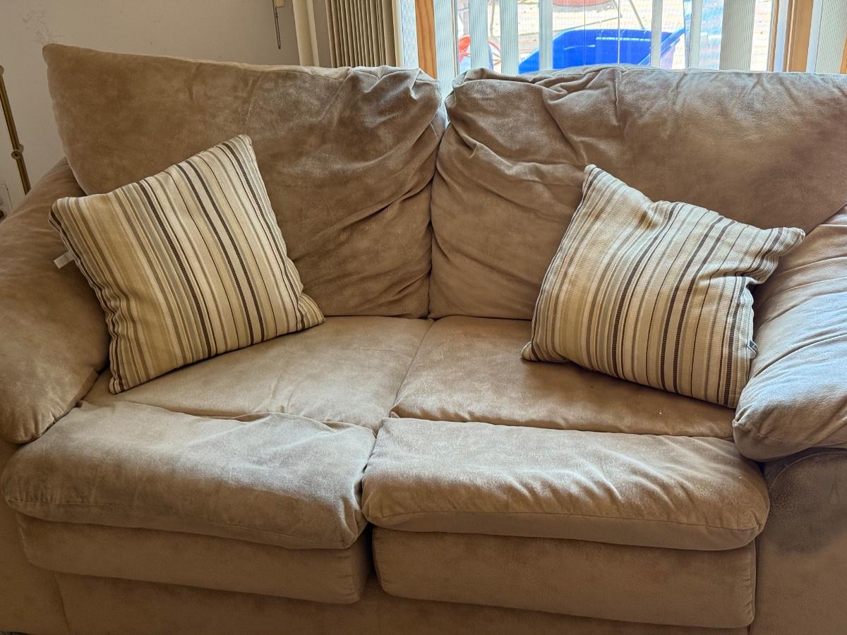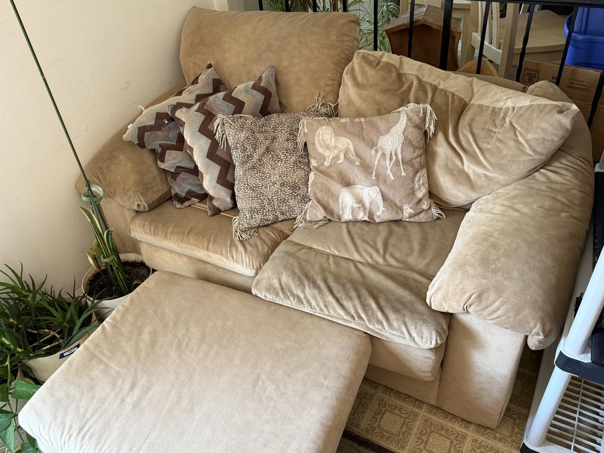 LOT 48F: Pair of Loveseats w/ Decorative Pillows & Rolling Ottoman