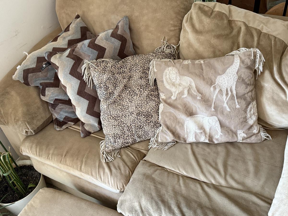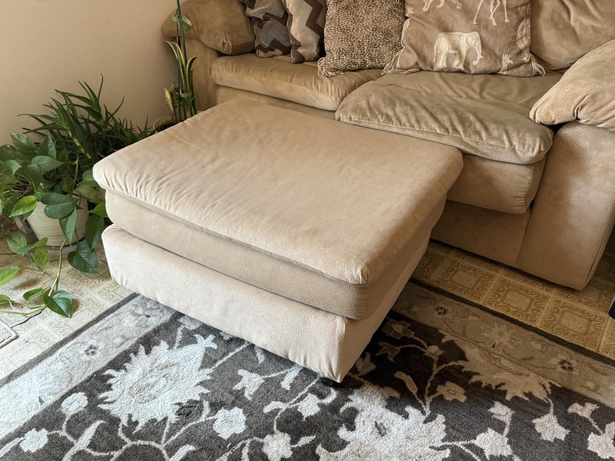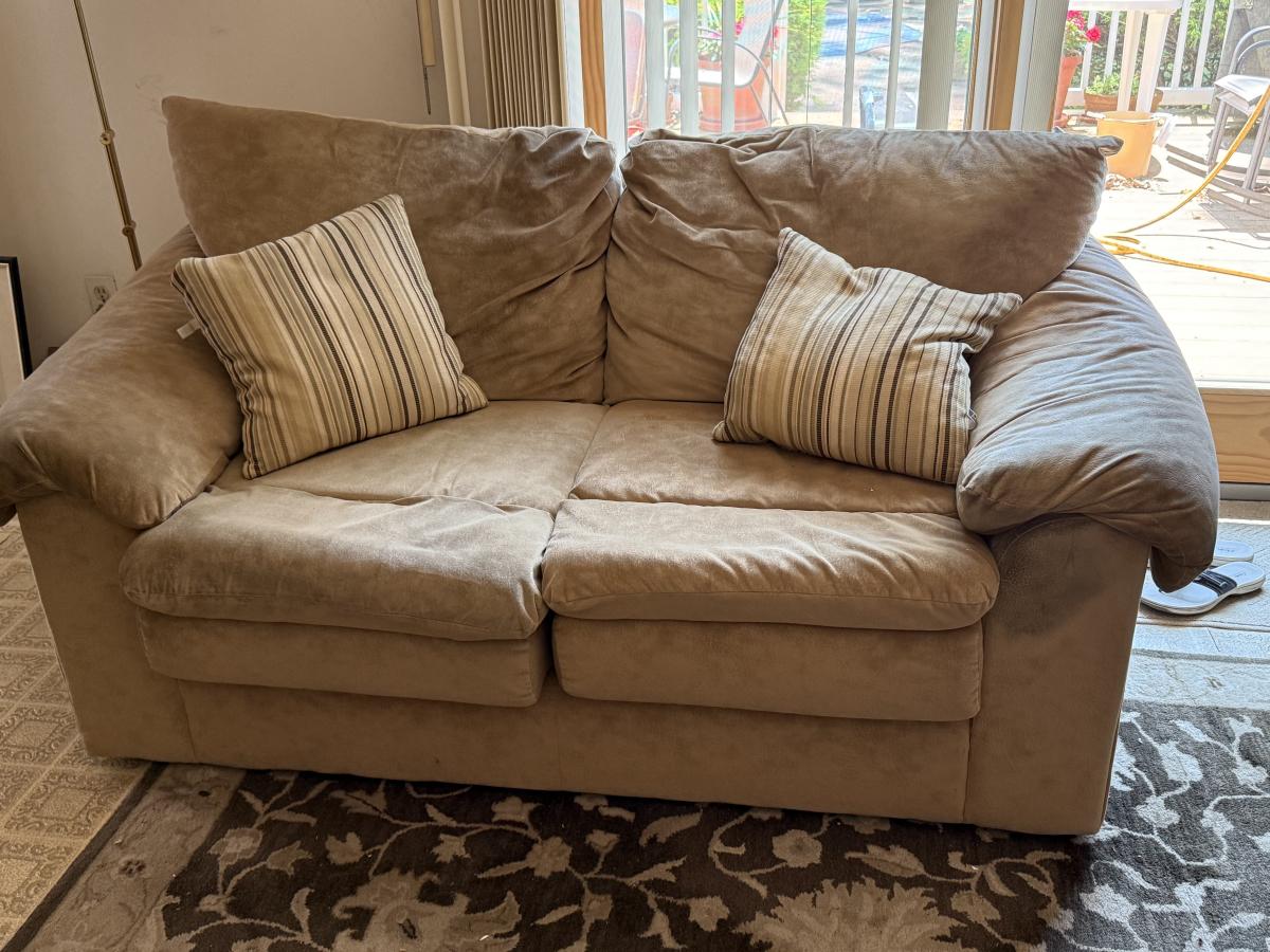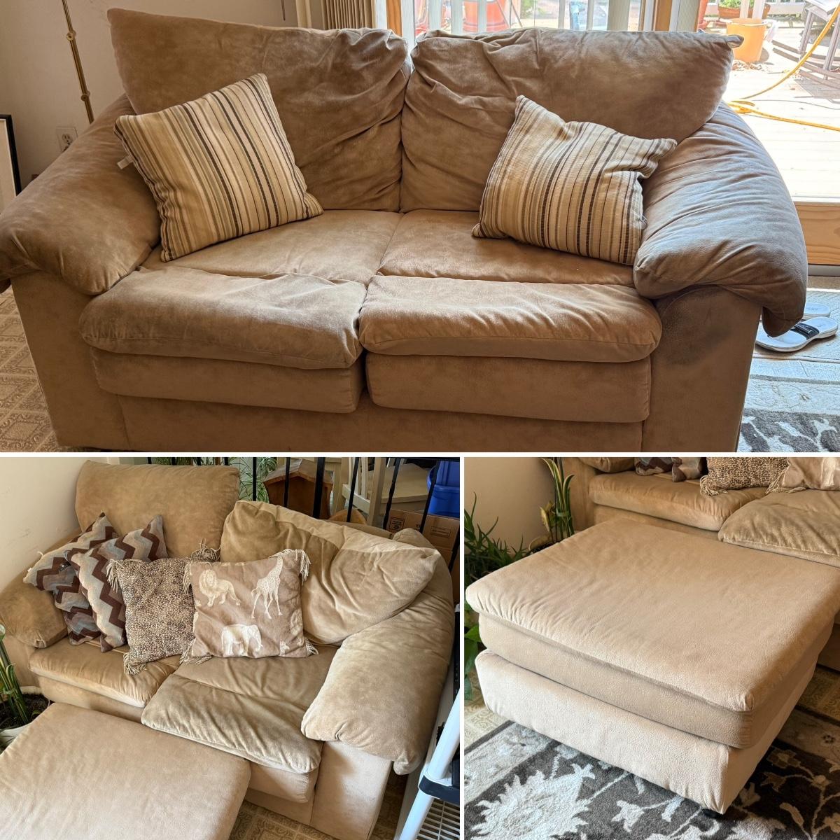 LOT 48F: Pair of Loveseats w/ Decorative Pillows & Rolling Ottoman