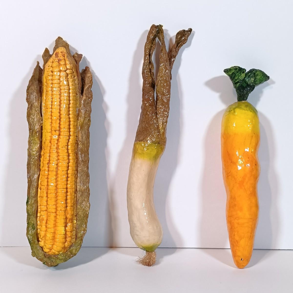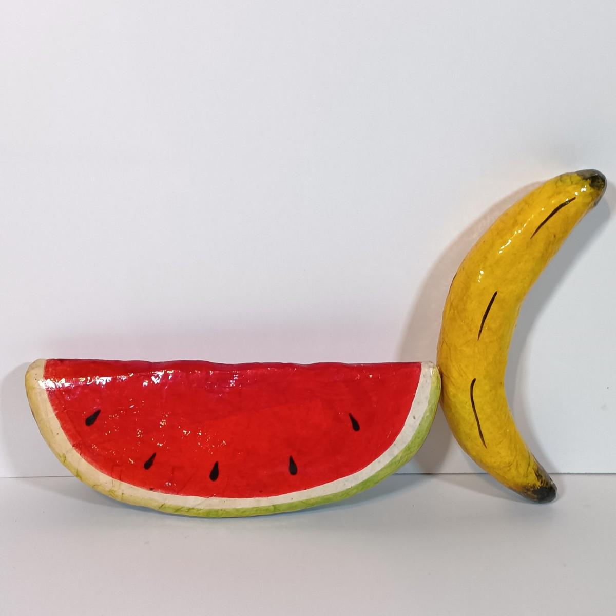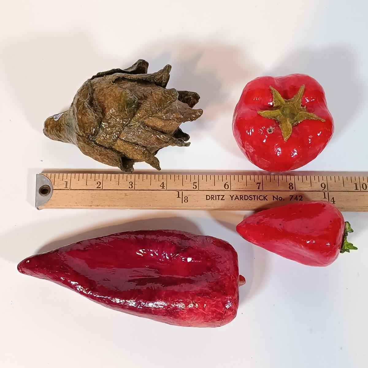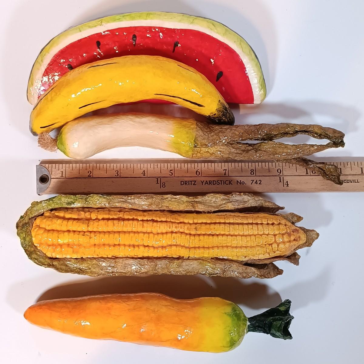 LOT 93B: Vintage California Pottery Serving Dish, Papermaché Fruit and Veggies, Cookbook Stand & Basket