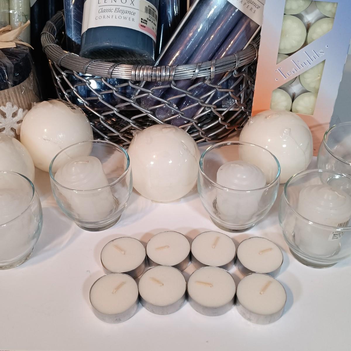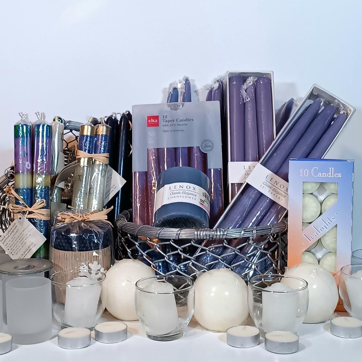 LOT 96B: Large Collection of Candles, Wire Metal Baskets & Glass Candle Holders