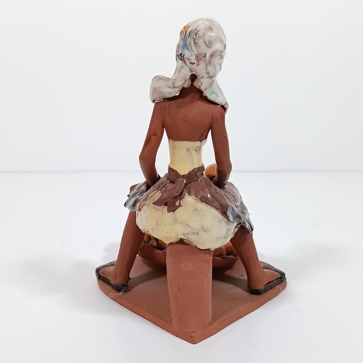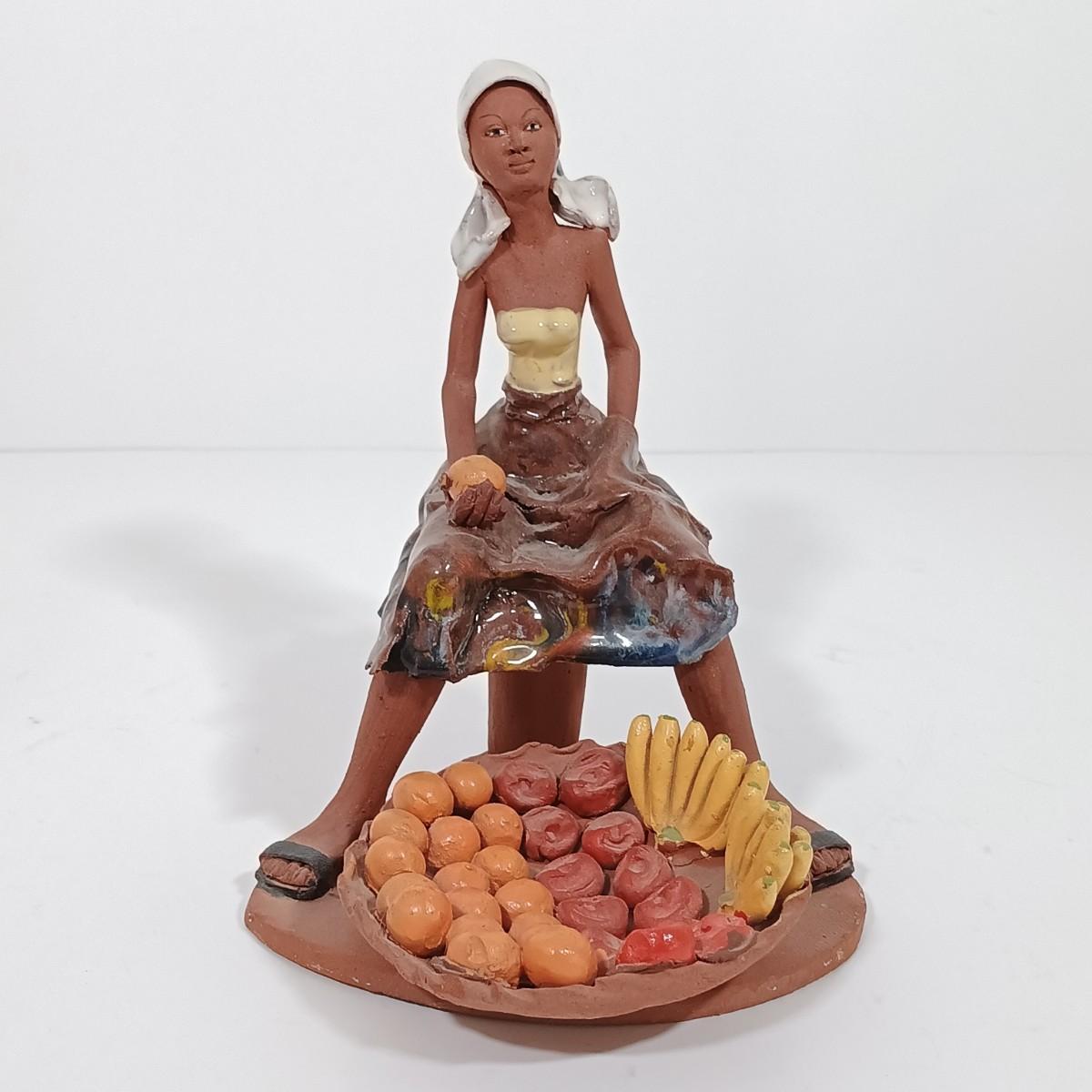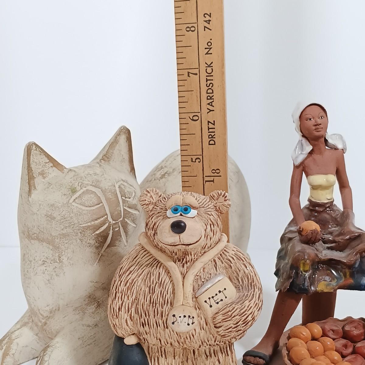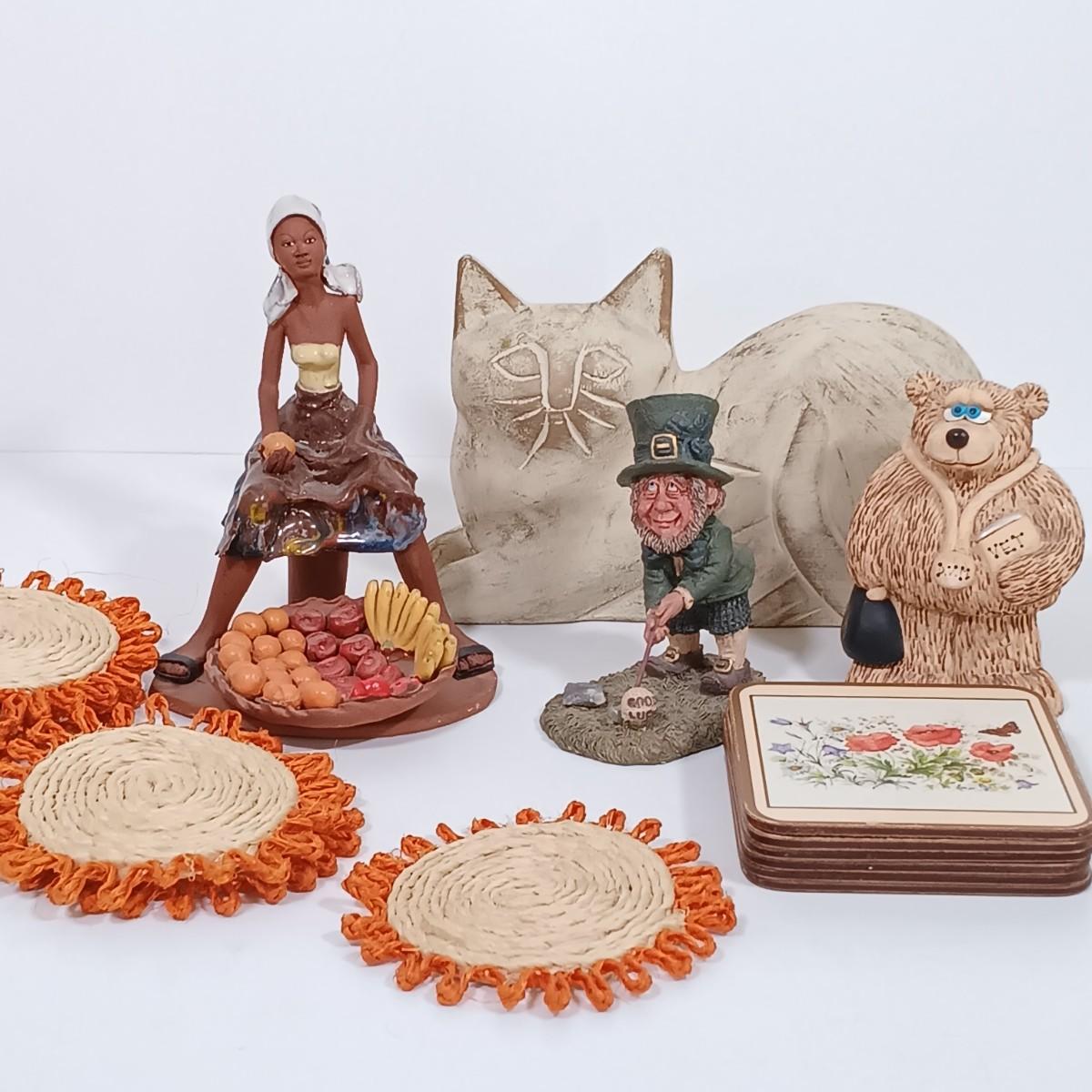 LOT 98L: Vintage Clay Art Woman Selling Fruit, Wood Folk Art Cat, Cantala Fiber Coasters & More