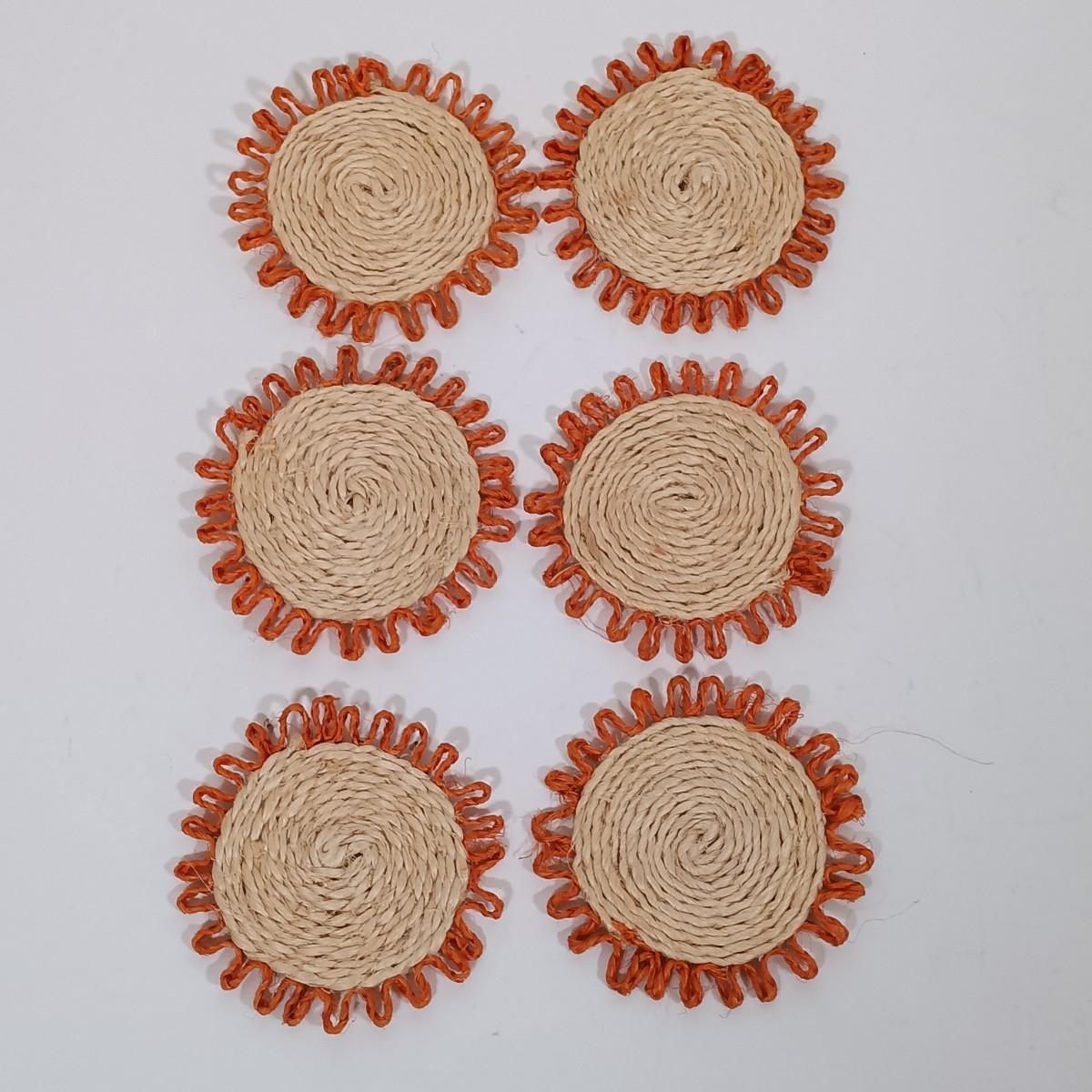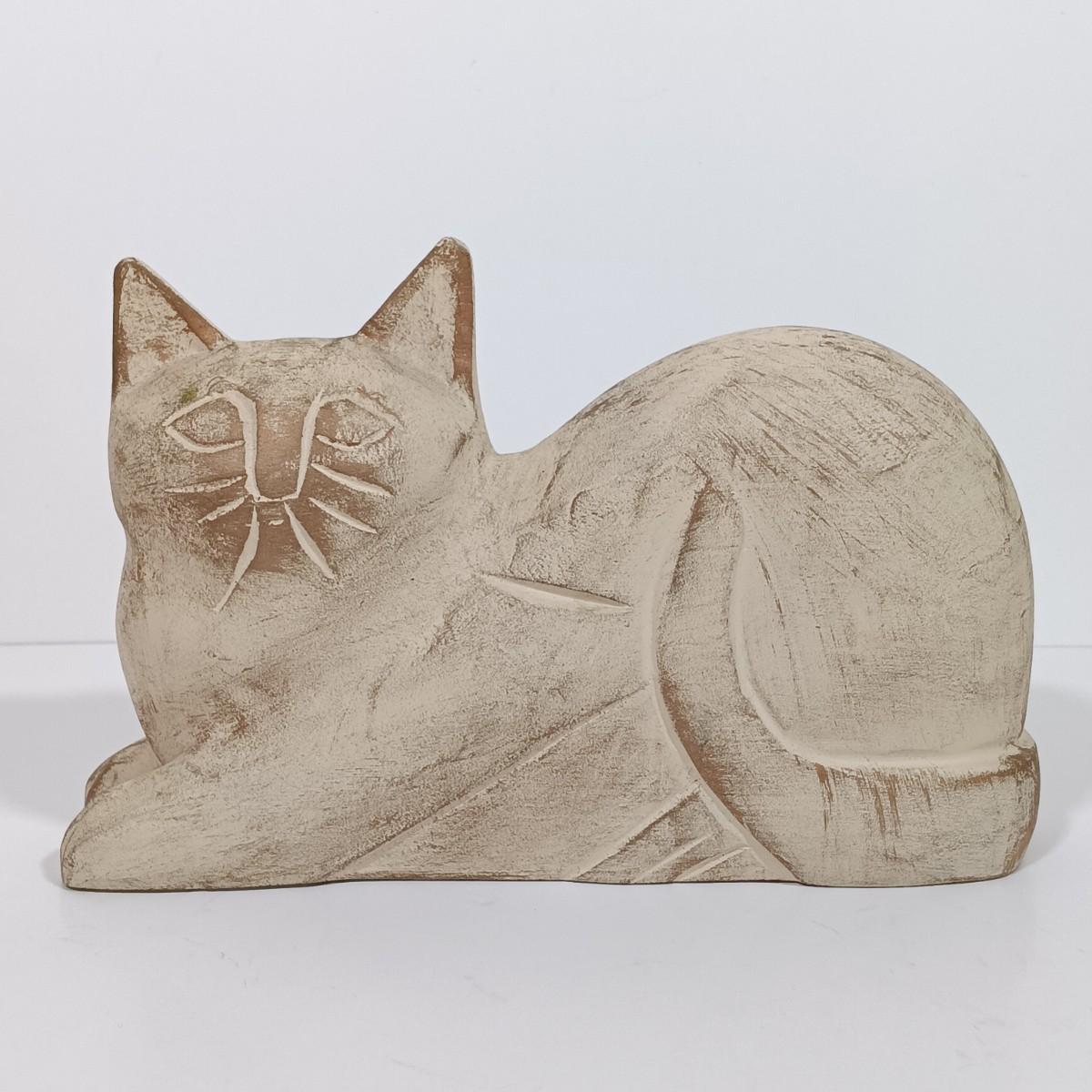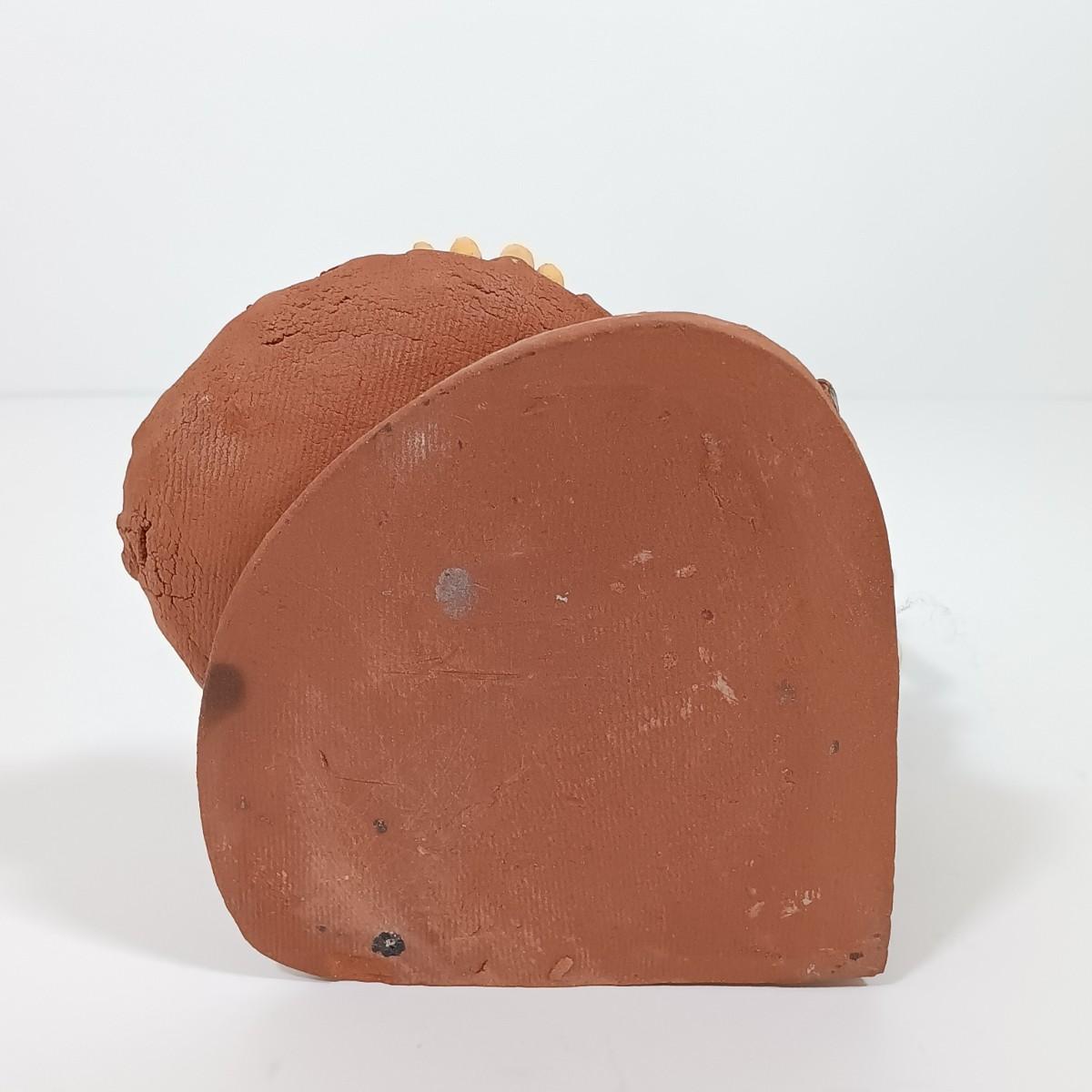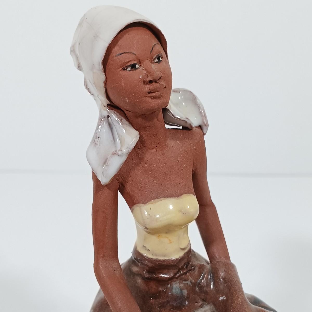LOT 98L: Vintage Clay Art Woman Selling Fruit, Wood Folk Art Cat, Cantala Fiber Coasters & More