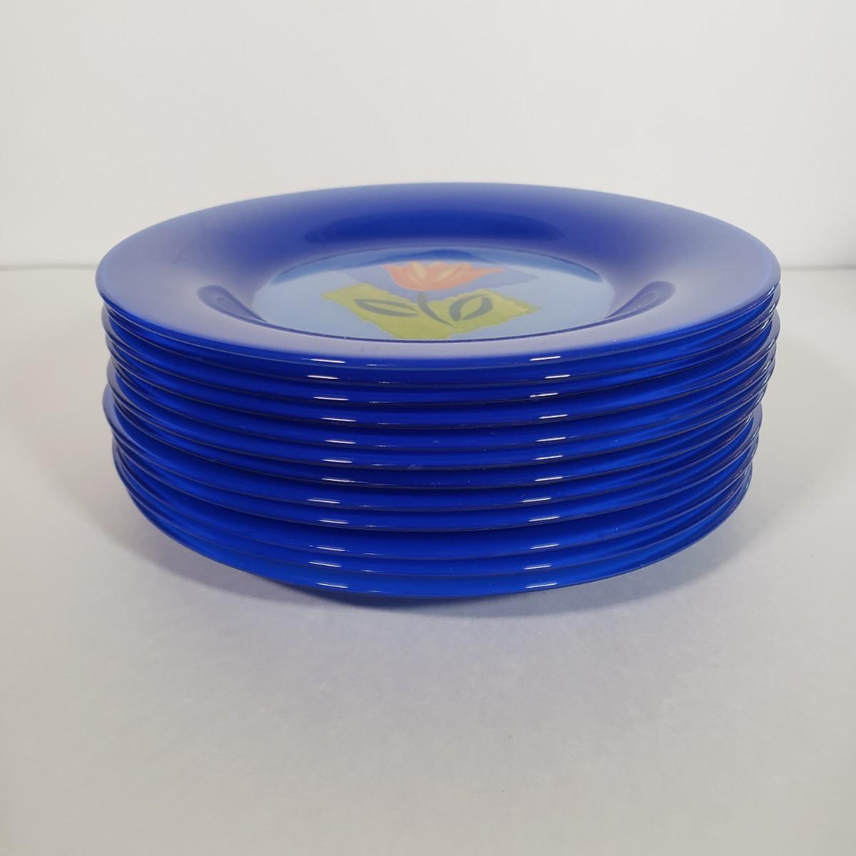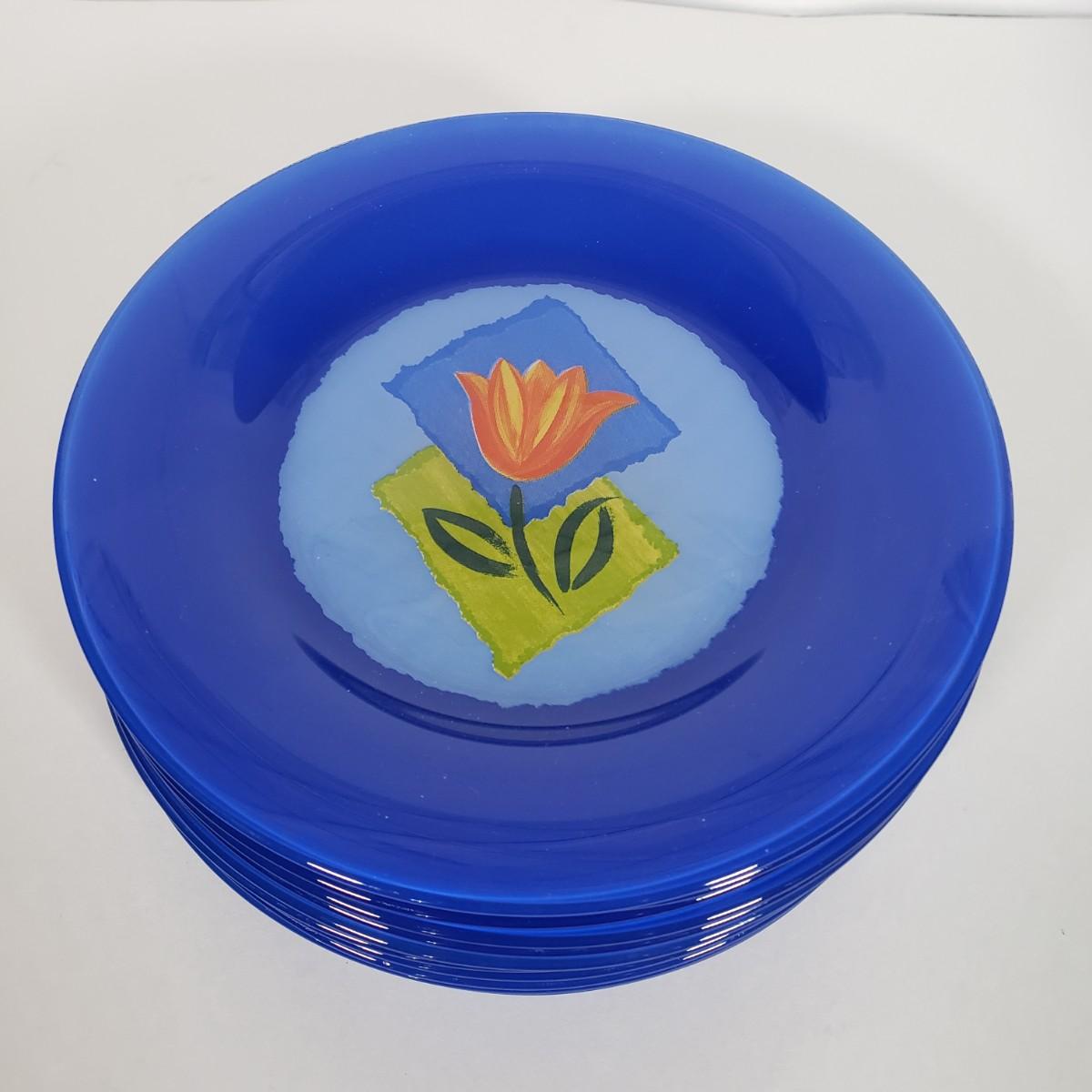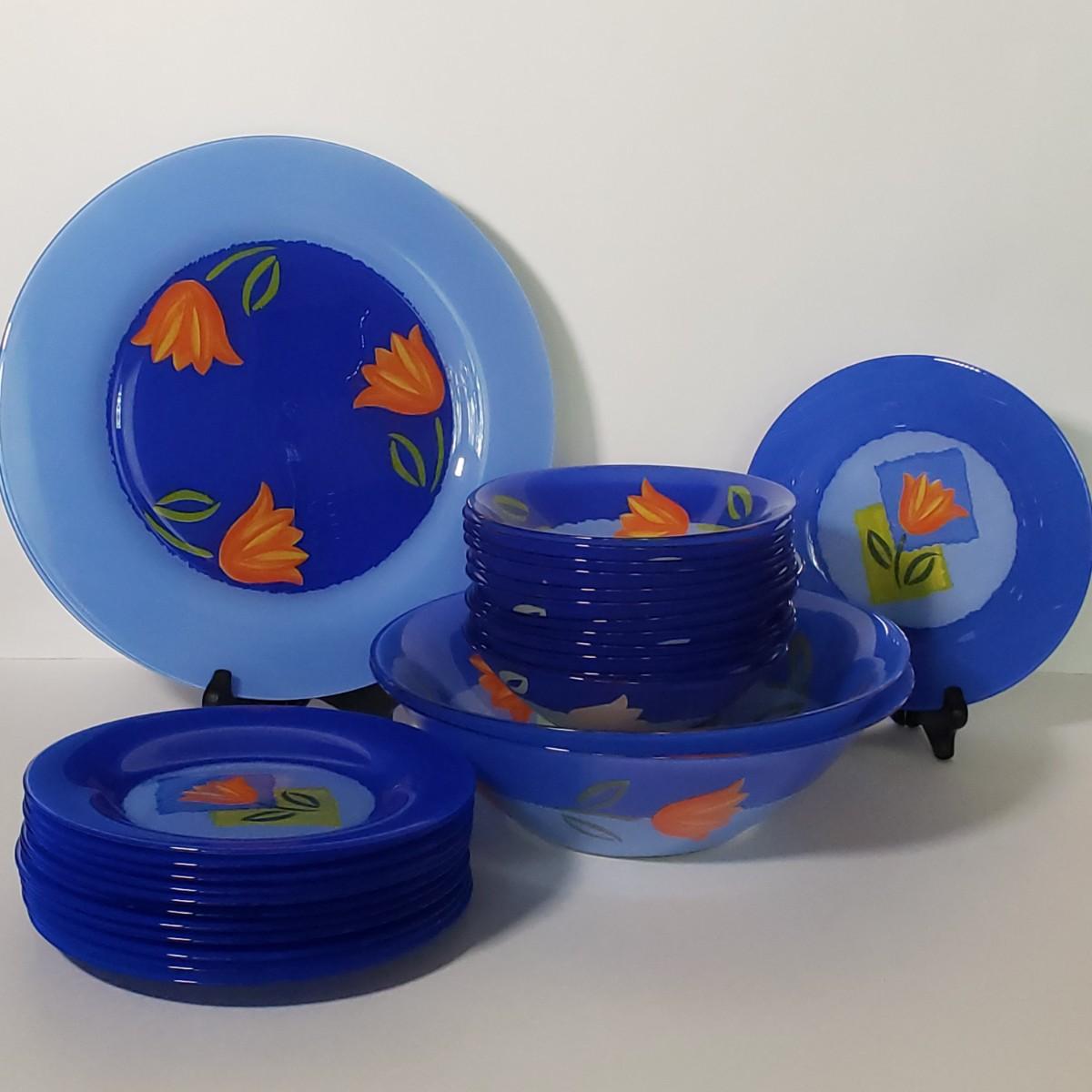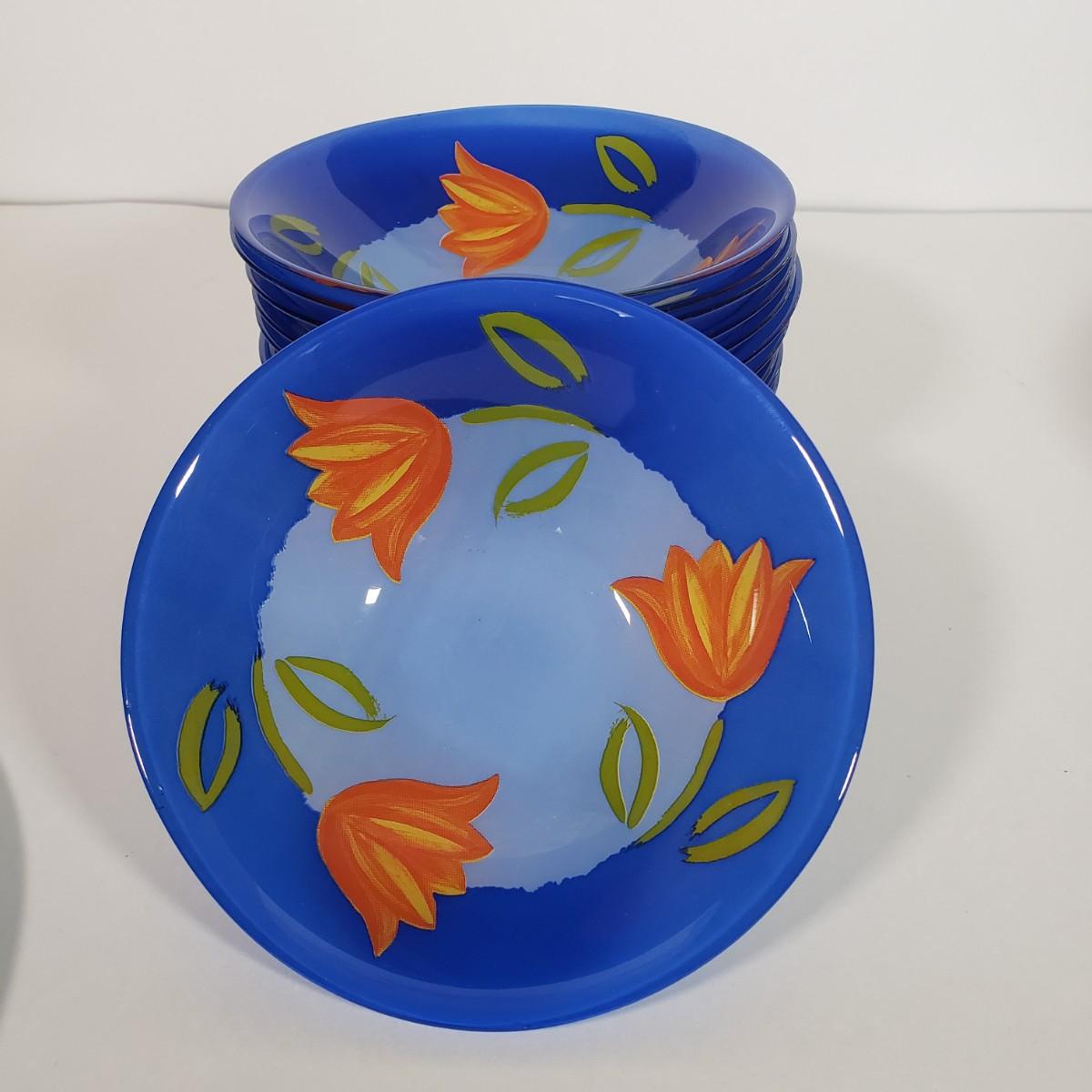 LOT 130L: Arcoroc France Blue Matys Glass Tableware with Orange Tulips