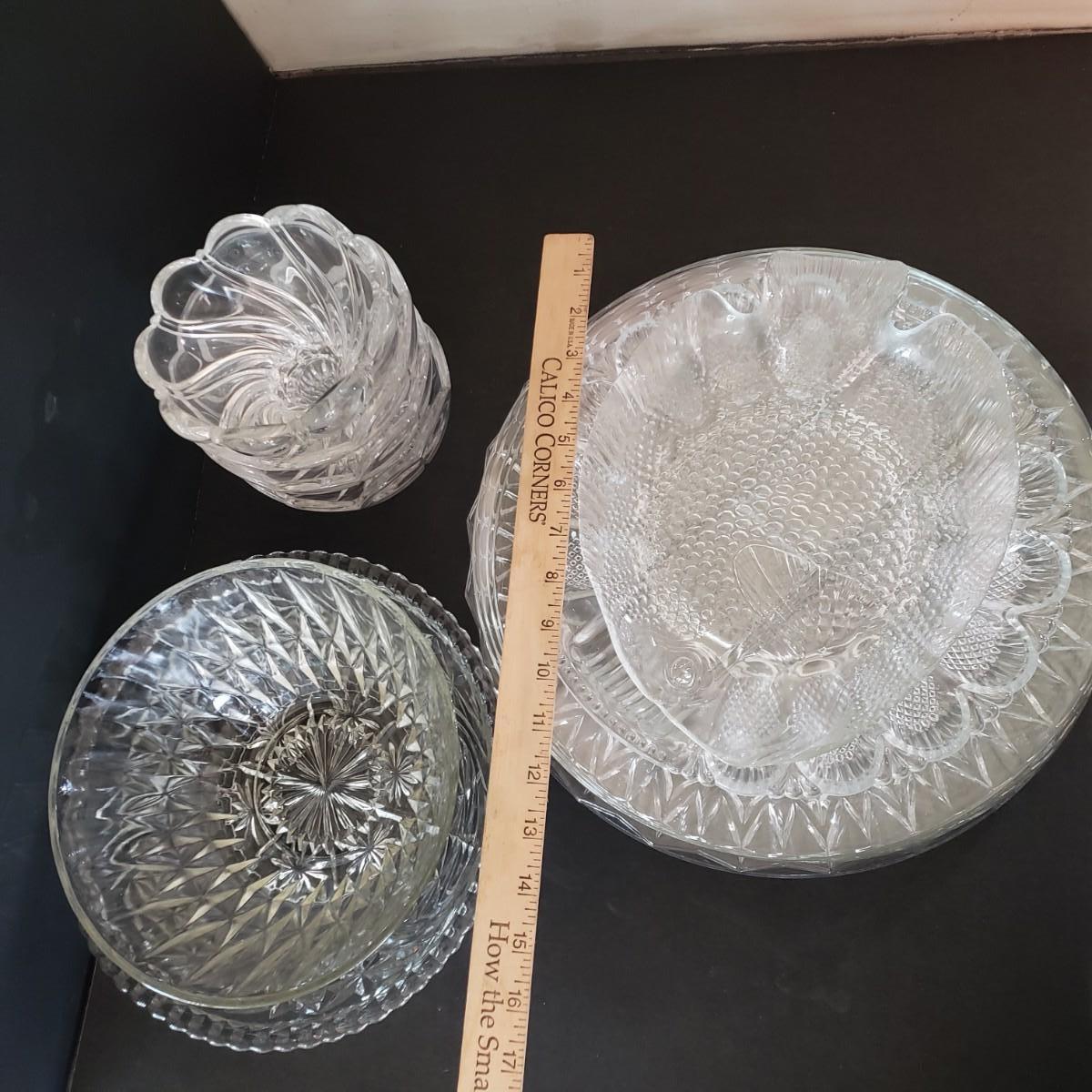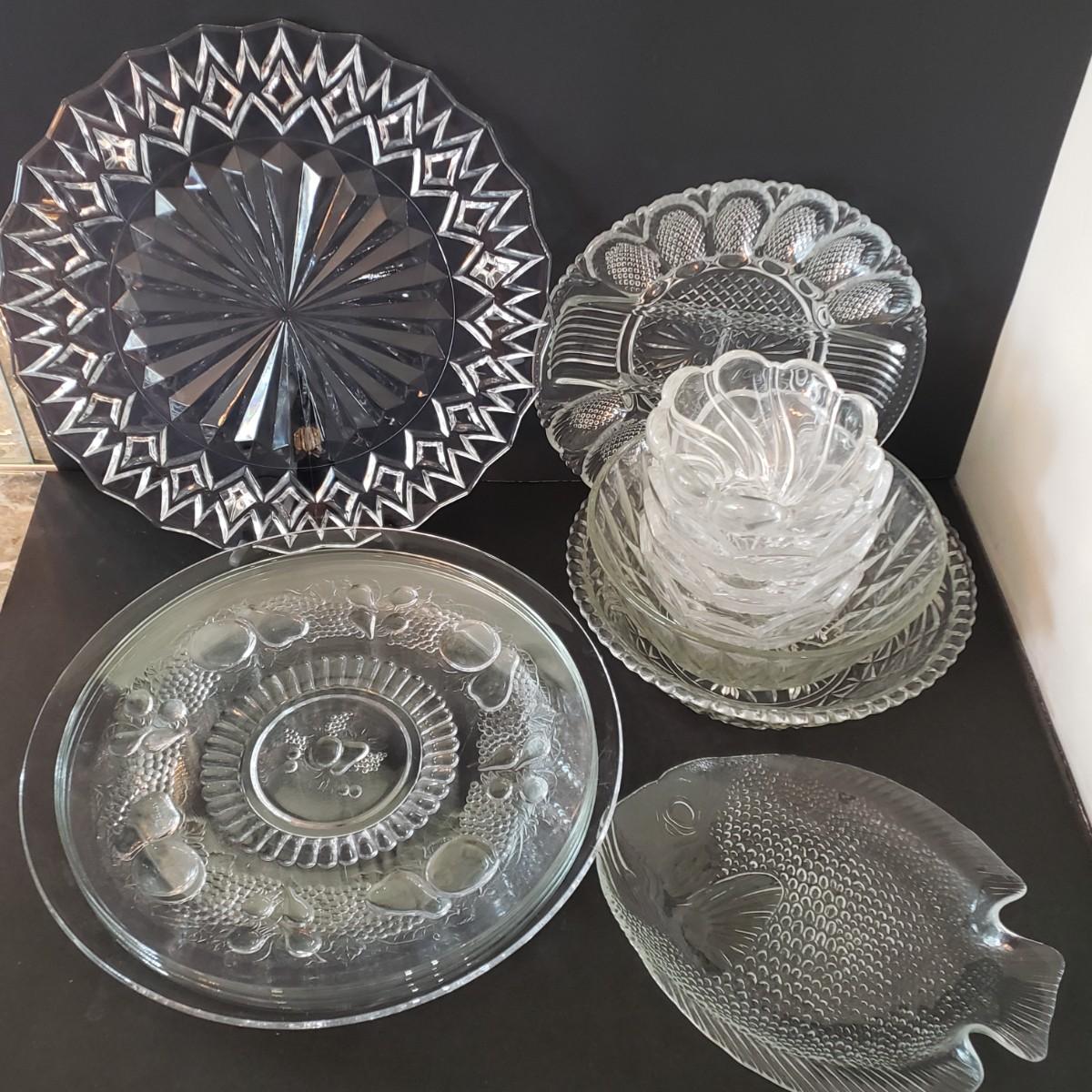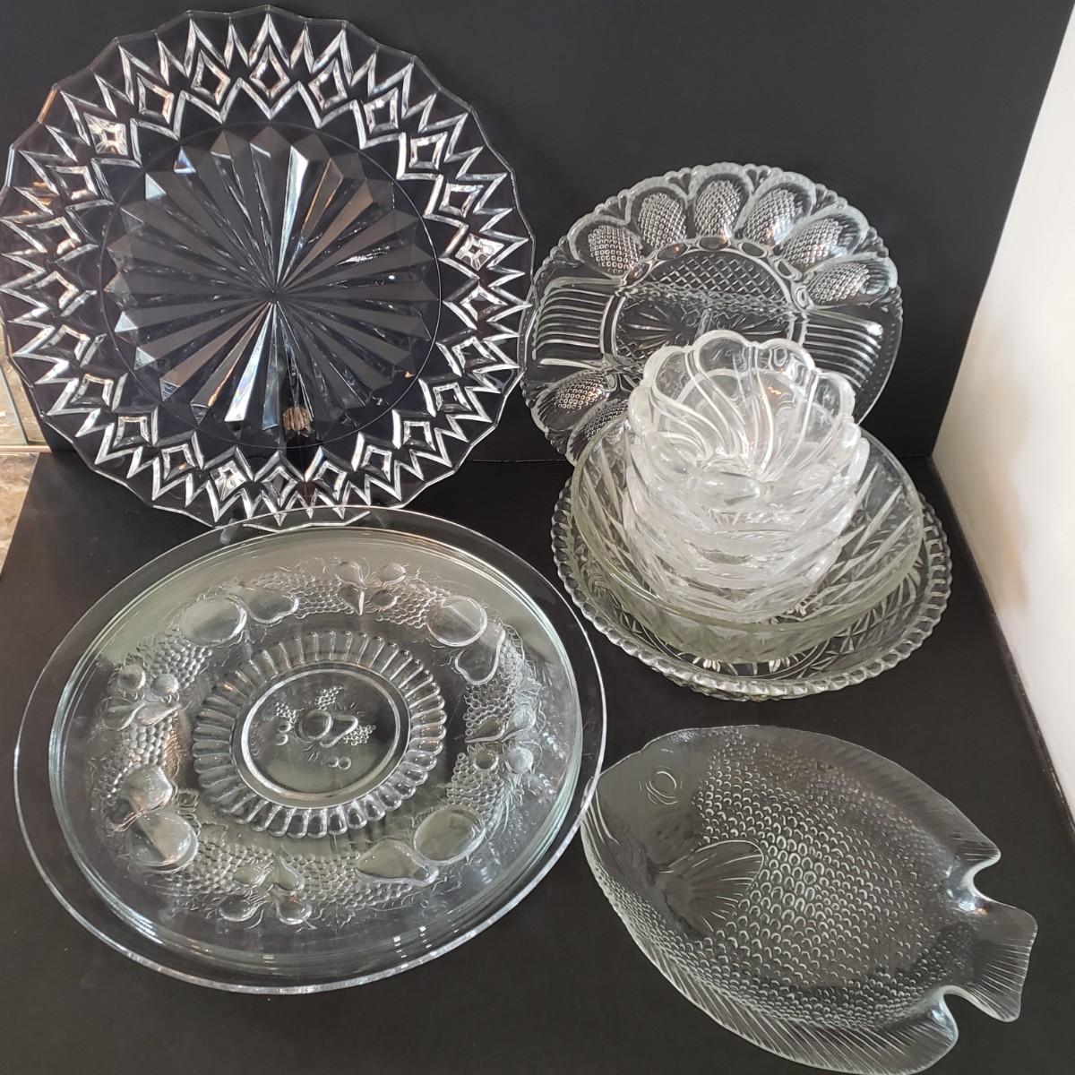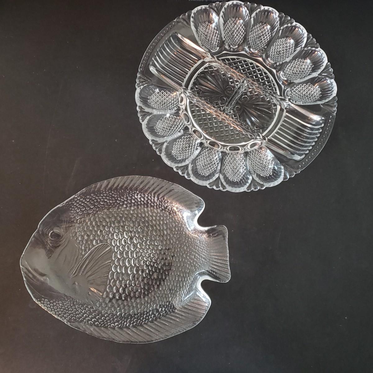 LOT 136L: 14" Lead Crystal Cathedral Cake Plate, Glass Egg Plate, Fish Dish, and More
