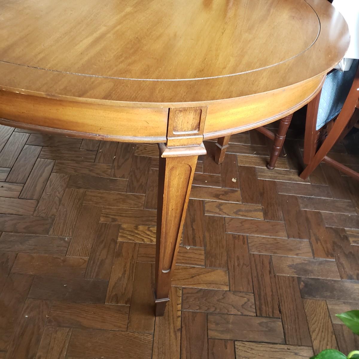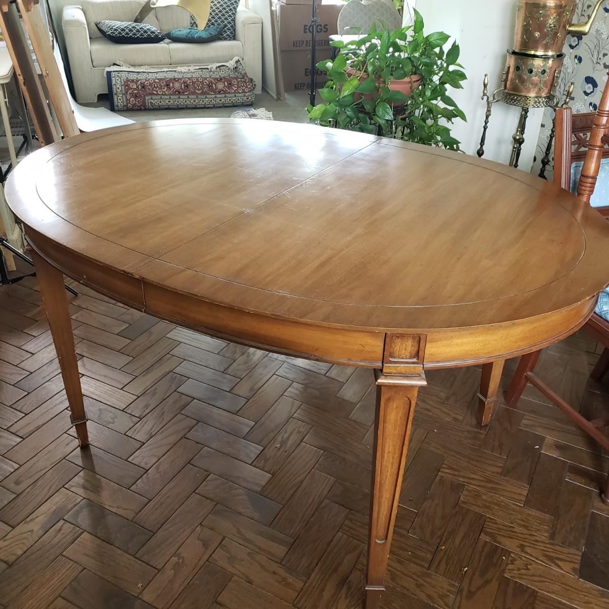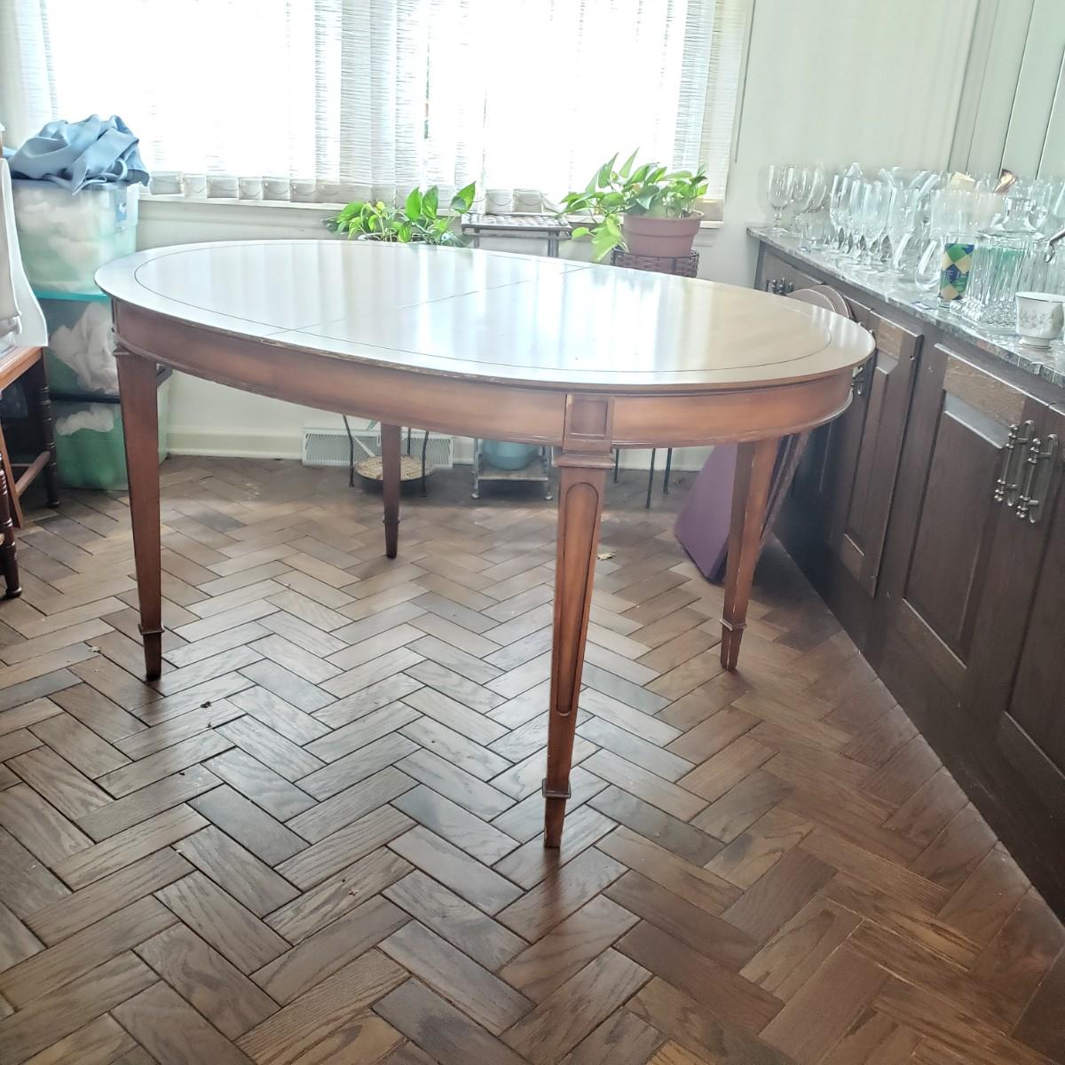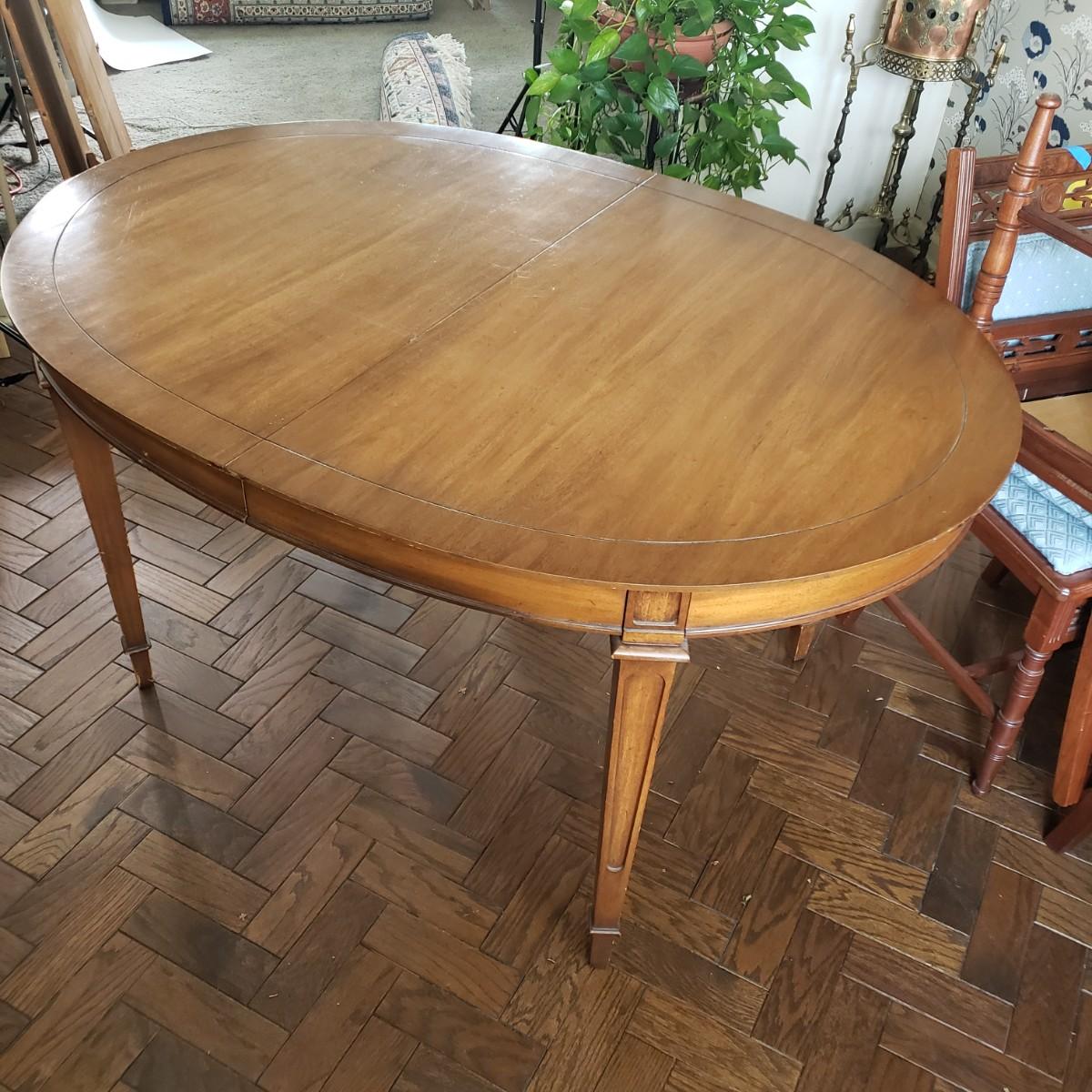 Table 56" L 40" W 30"H, leaf each 40"x 18". Please see all pictures as they are the best representation of the items. The pictures show condition, measurements if taken, and what is included in the lot. Due to the large amount that we photograph and the time frame, we are not always able to take measurements. All items unless noted, are pre-owned and have been used. If you purchased furniture, you must bring help. We do not allow one person to carry large furniture out on their own. Bring help, tools and a truck for the safety of our client’s homes, and your personal safety. Any damages that result to the property including walls, and floors due to moving of the furniture will be charged to the buyer. Company policy. Thank you.