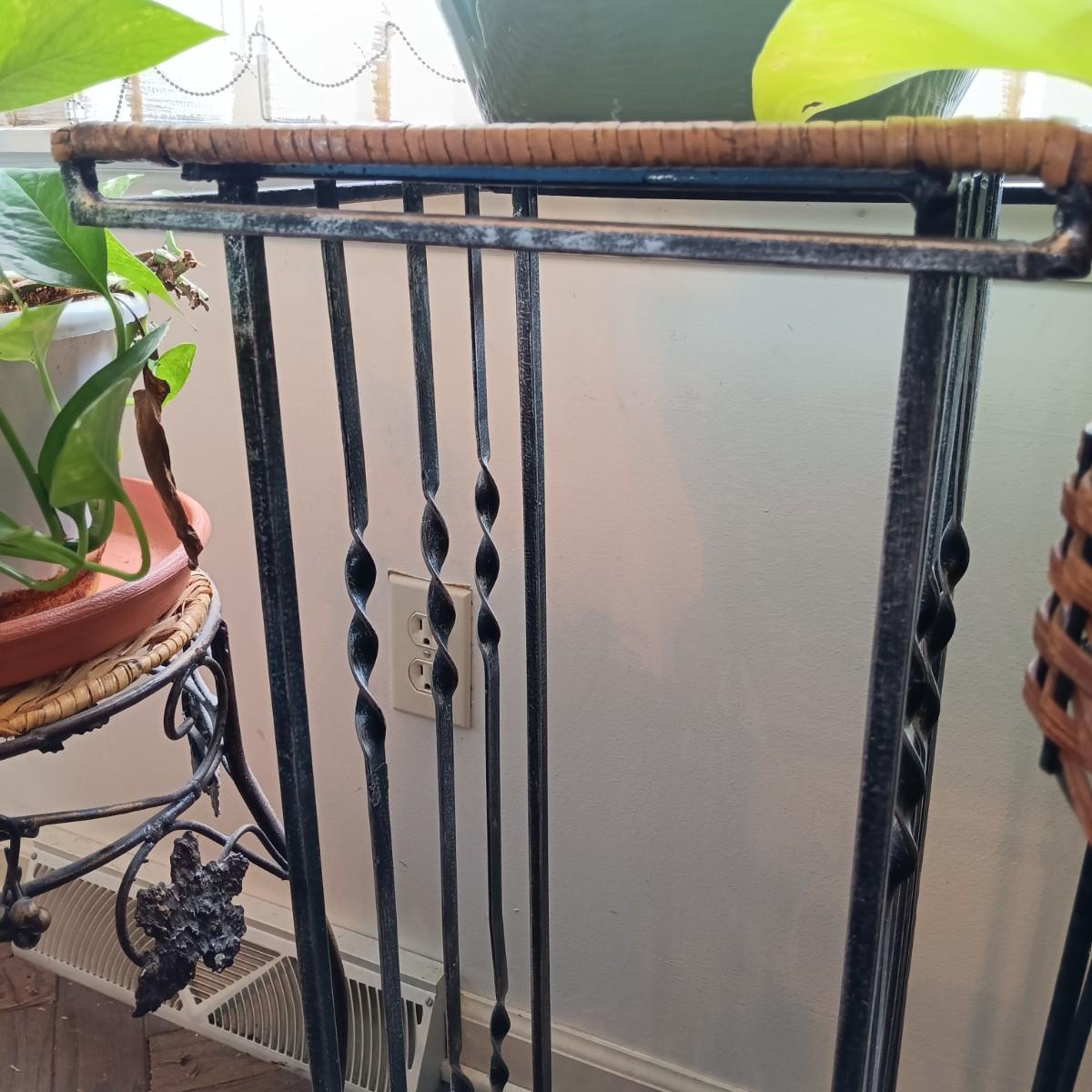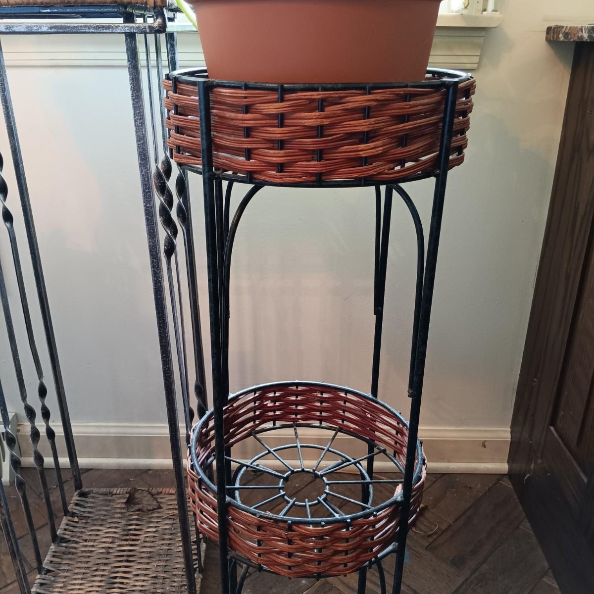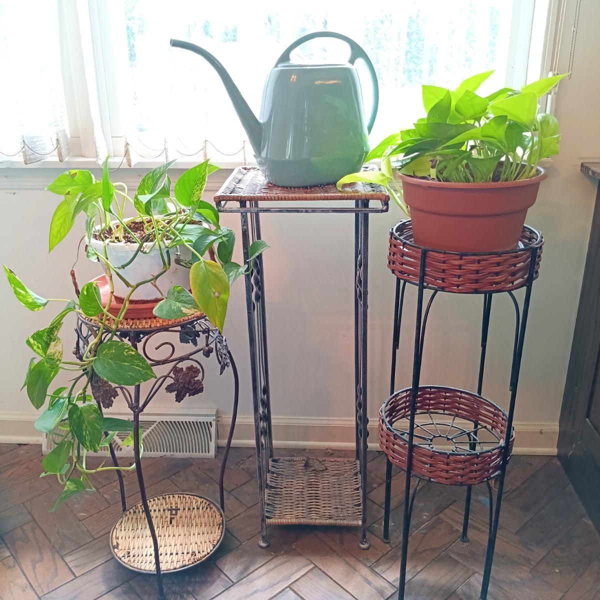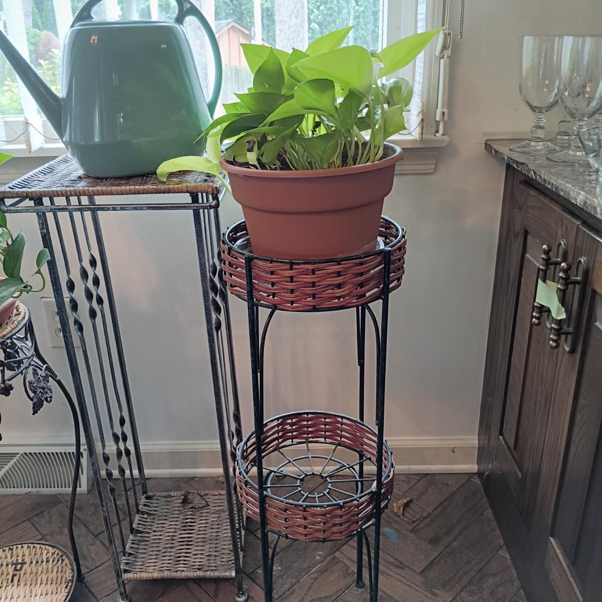 LOT 202K: Pothos Plants with Metal and Wicker Plant Stands & Watering Can