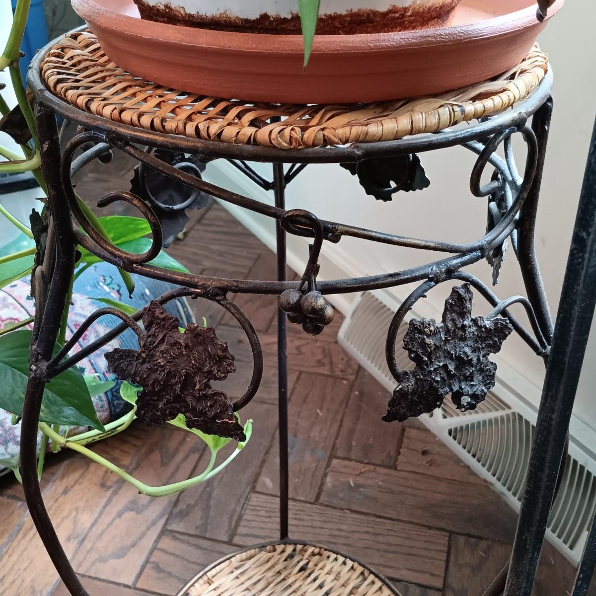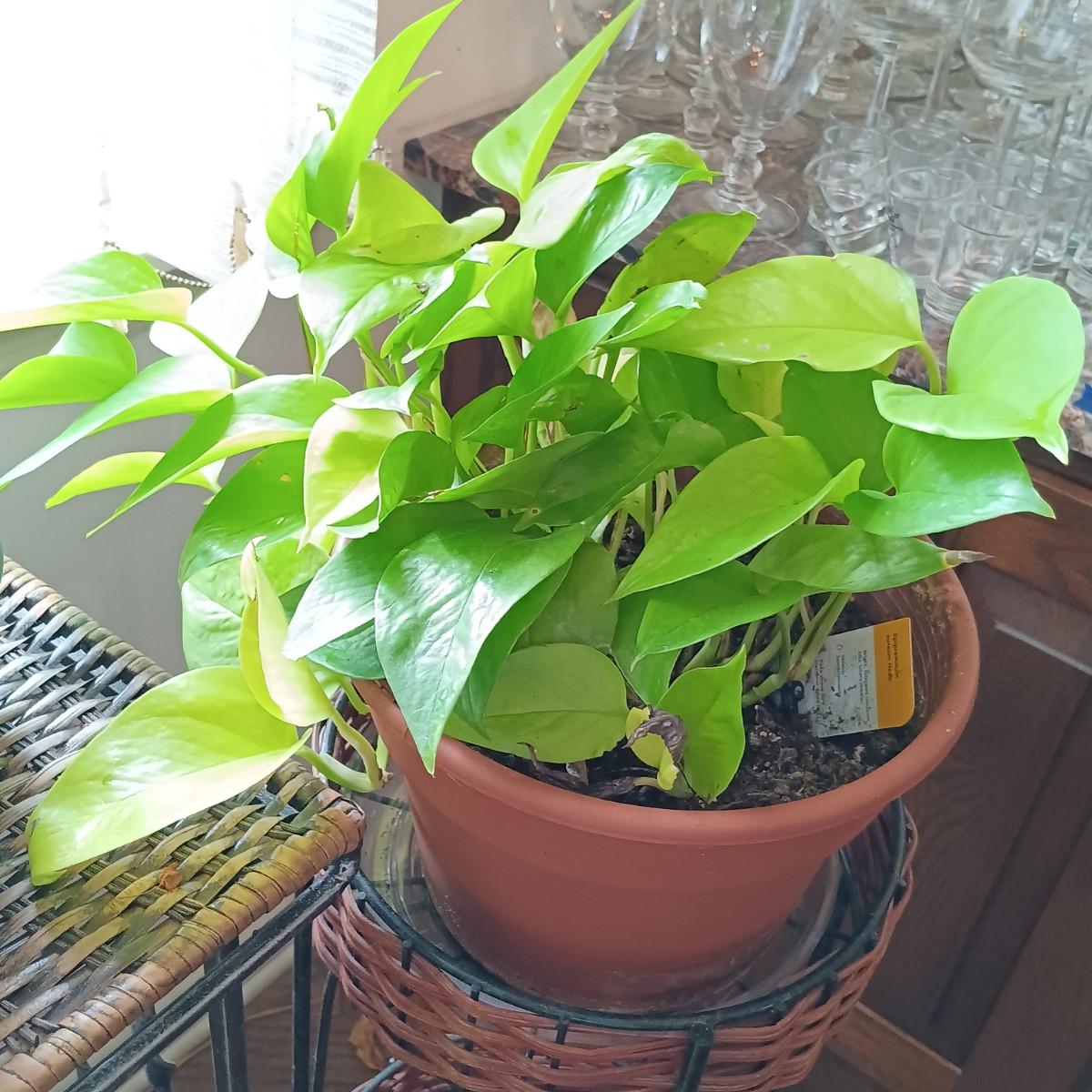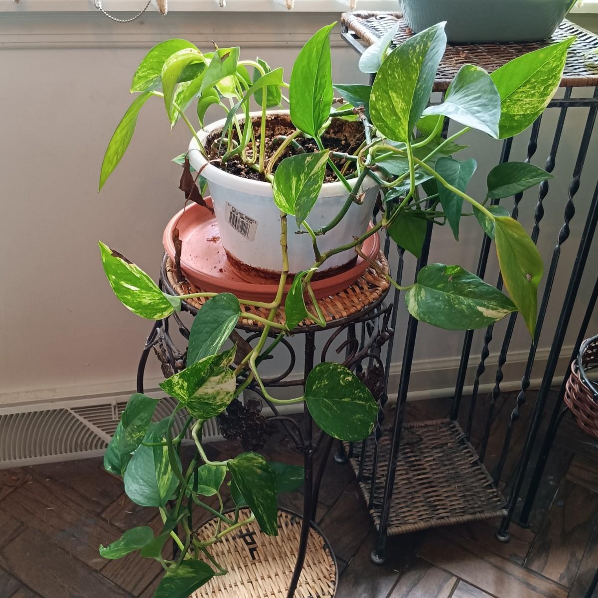 LOT 202K: Pothos Plants with Metal and Wicker Plant Stands & Watering Can