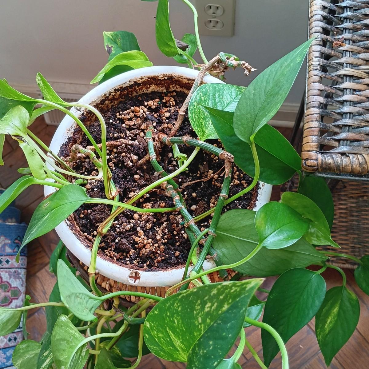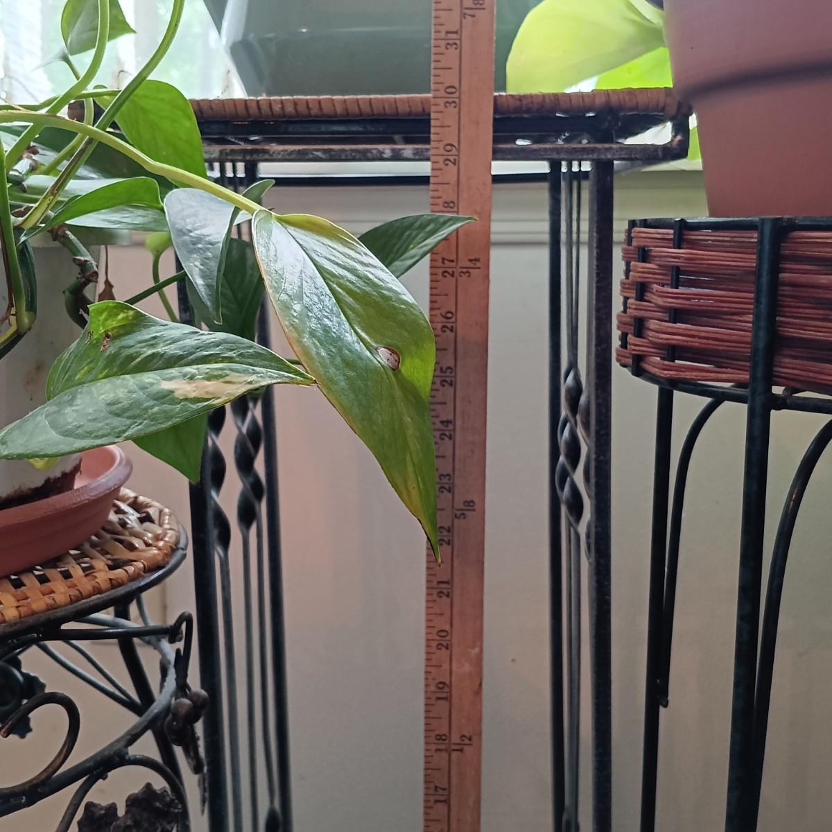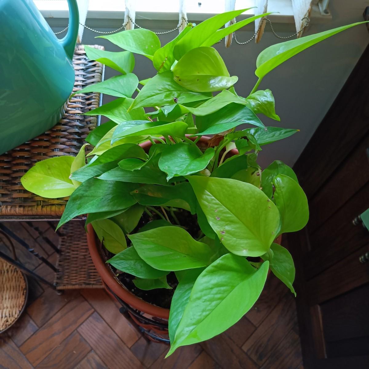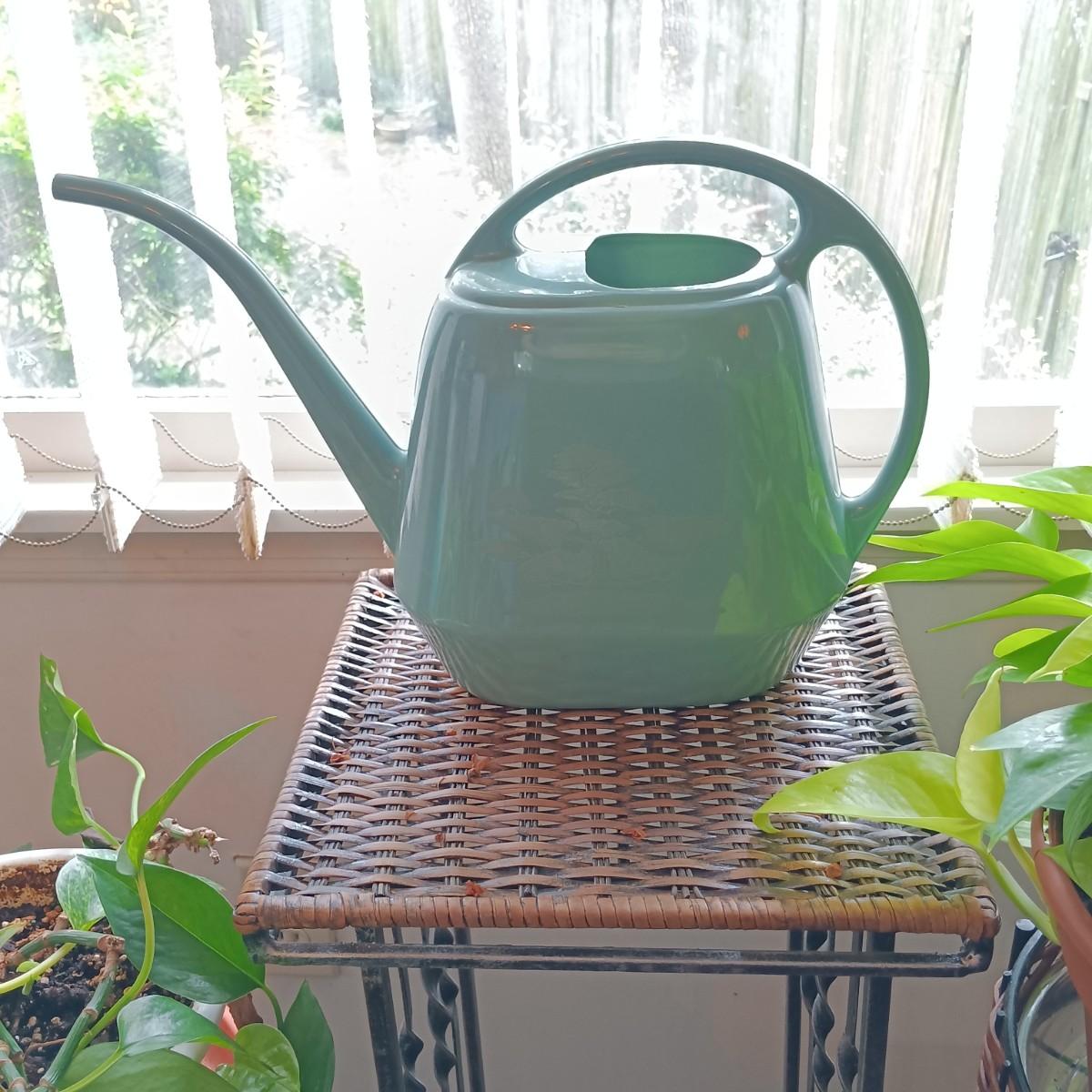LOT 202K: Pothos Plants with Metal and Wicker Plant Stands & Watering Can