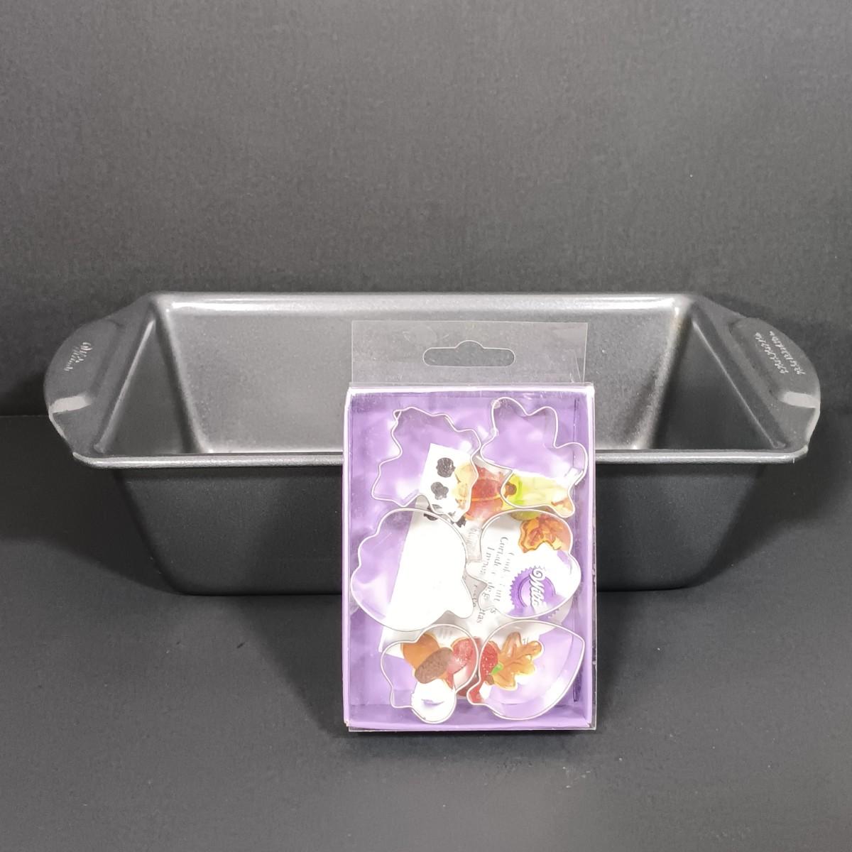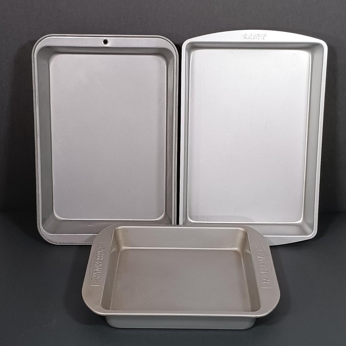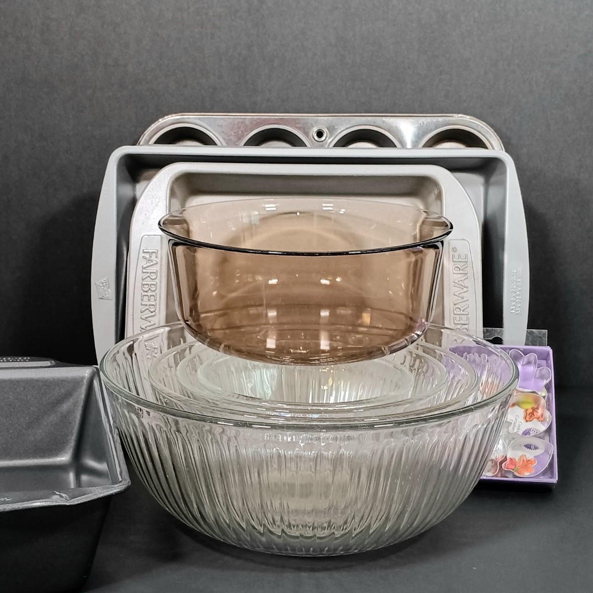 LOT 210K: Pyrex Stacking Mixing Bowls, Farberware Sheet Pan, Wilton Loaf Pan & More