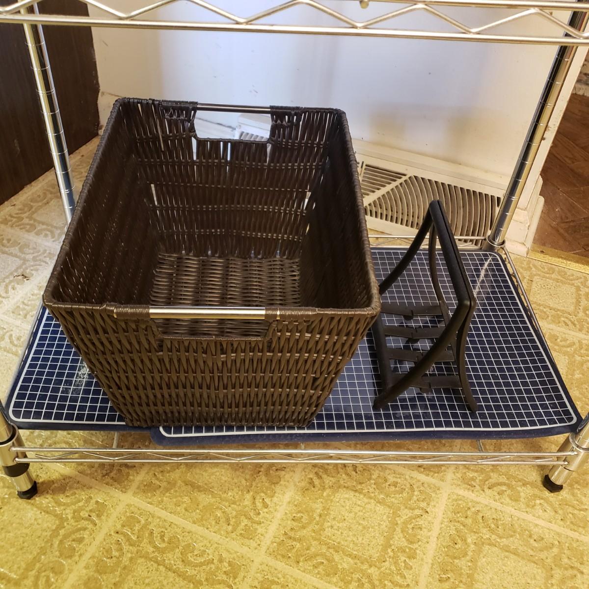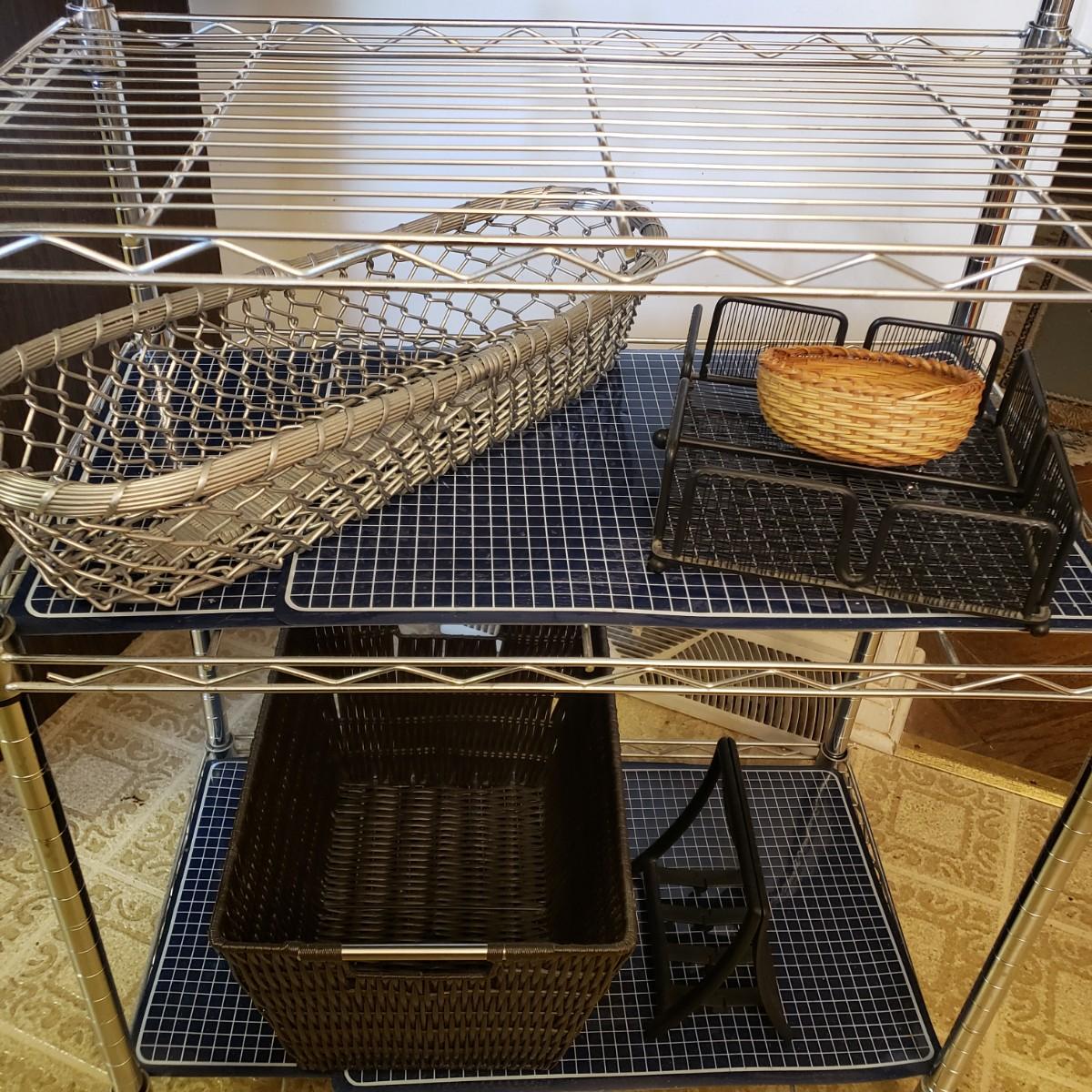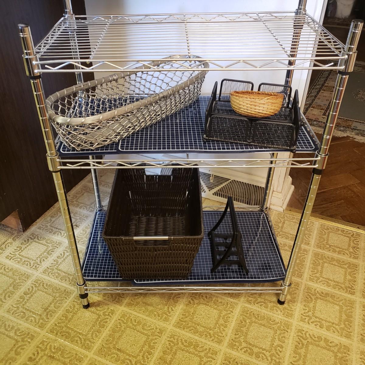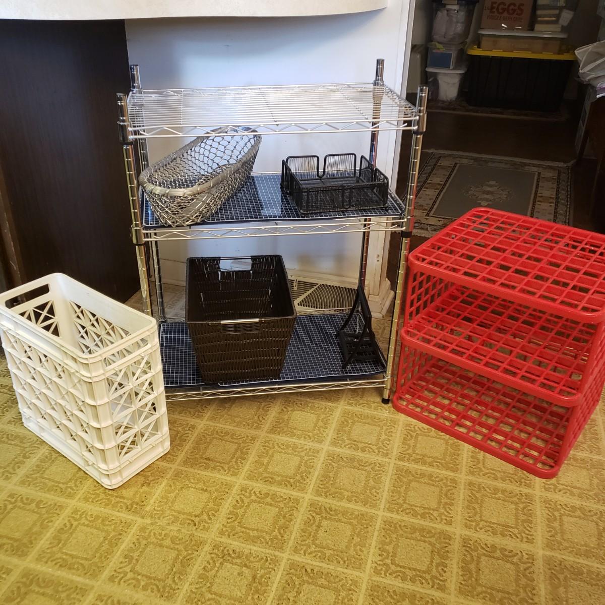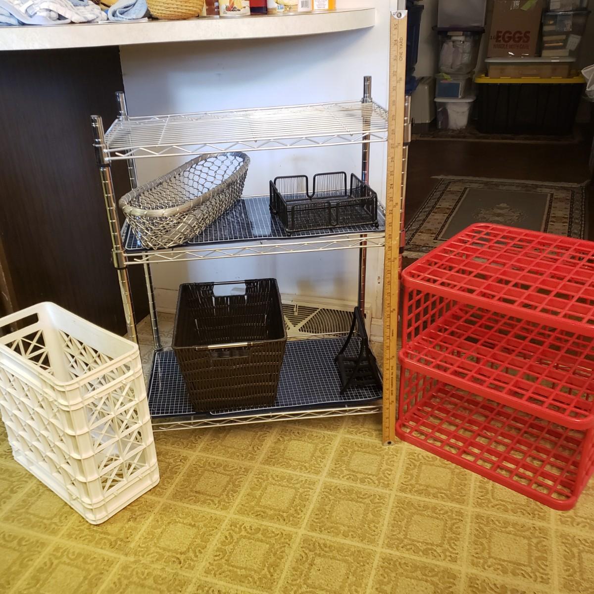 LOT 227K: 3-Tier Metal Shelf, Plastic Organization Shelves, and More
