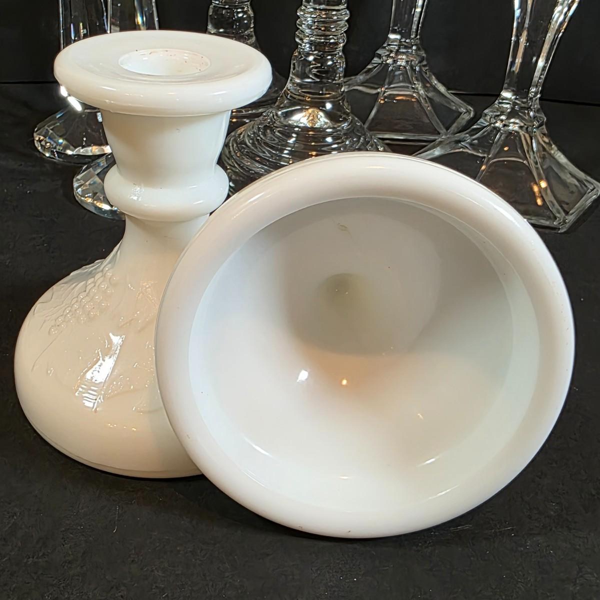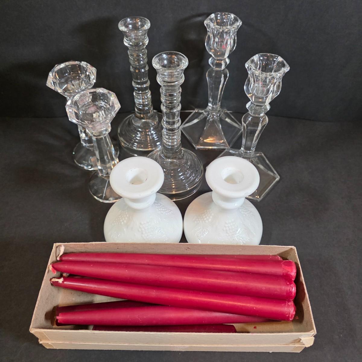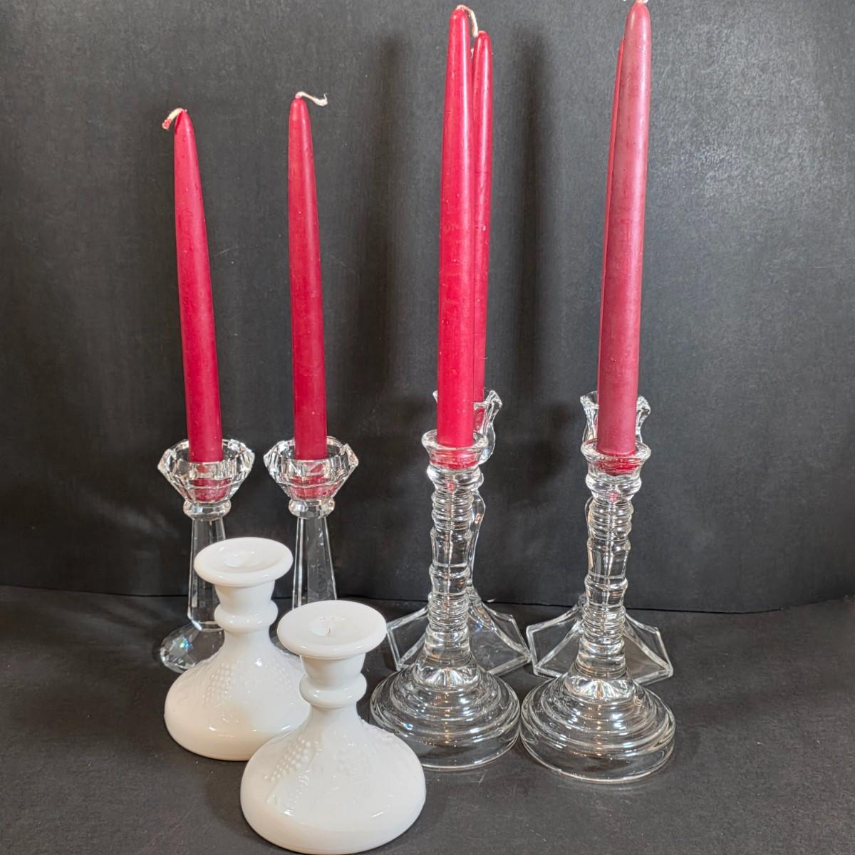 LOT 57D: Vintage Candle Holder Collection W/Red Taper Candles, Includes A Pair Of Westmoreland Milk Glass Paneled Grape Pattern Candle Holders, A Crystal Pair & 2 Clear Glass Pairs