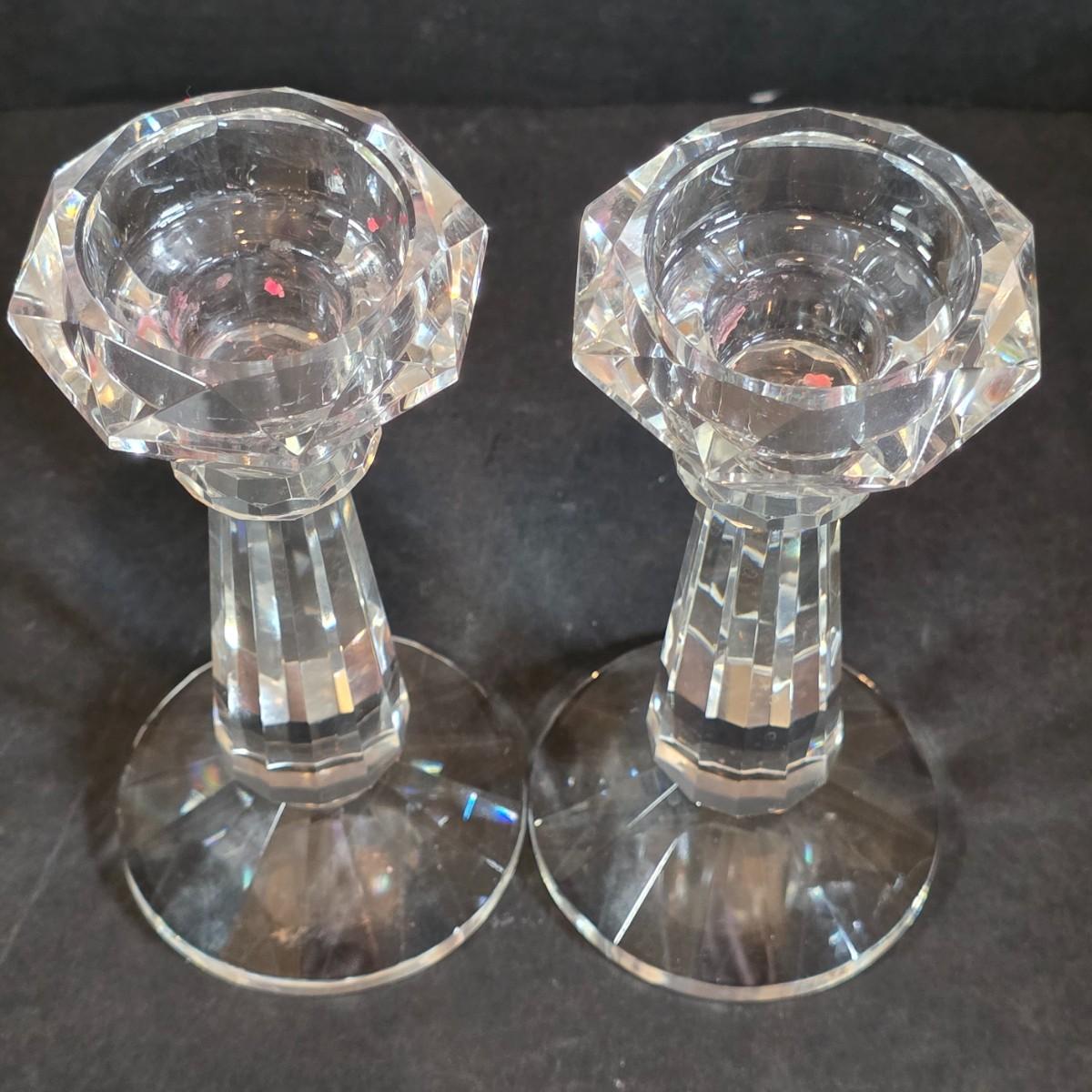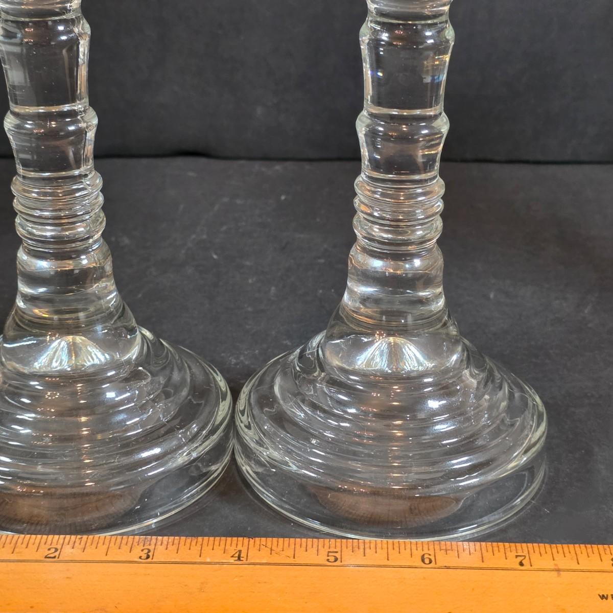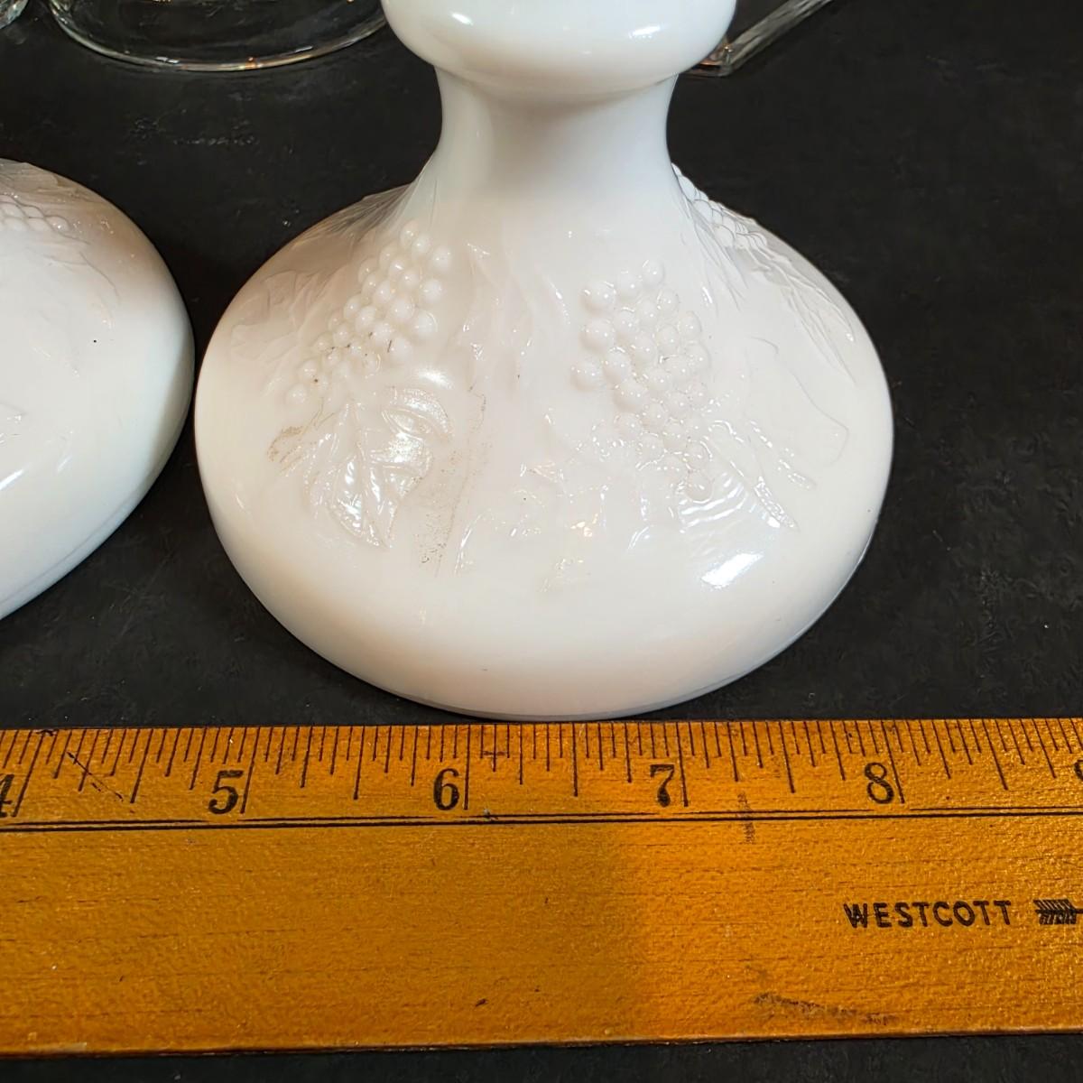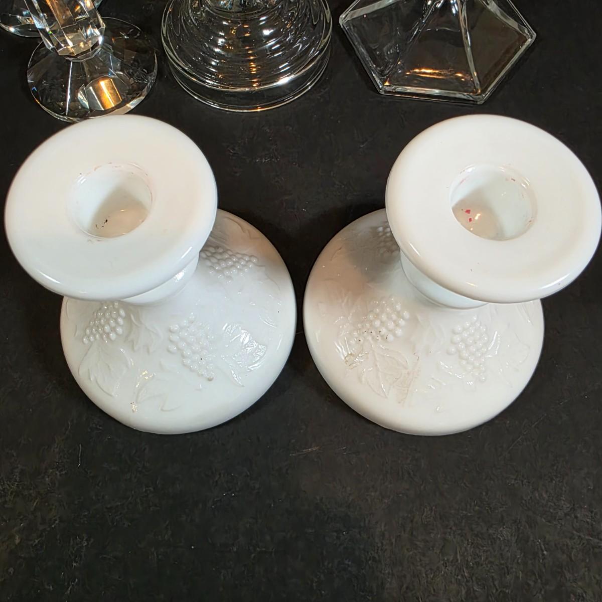 LOT 57D: Vintage Candle Holder Collection W/Red Taper Candles, Includes A Pair Of Westmoreland Milk Glass Paneled Grape Pattern Candle Holders, A Crystal Pair & 2 Clear Glass Pairs