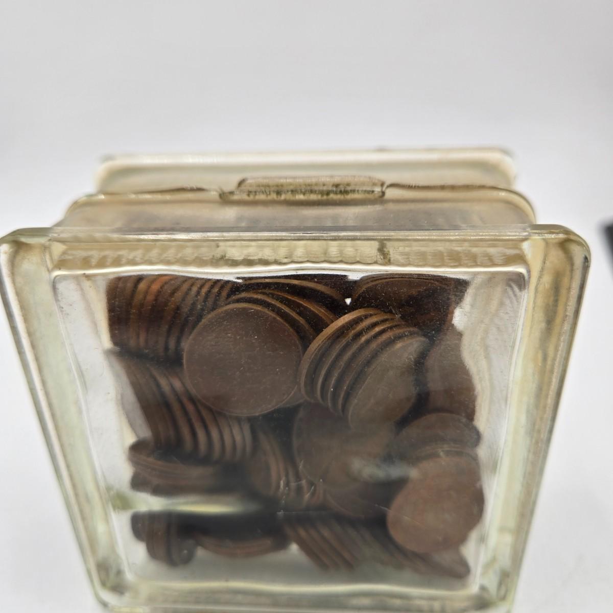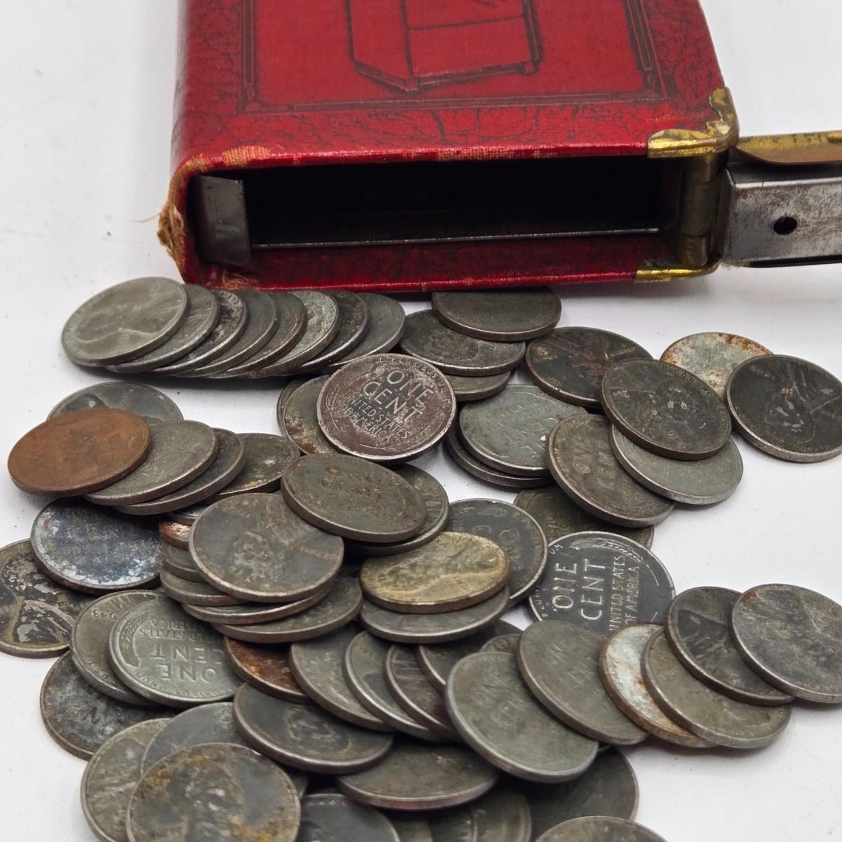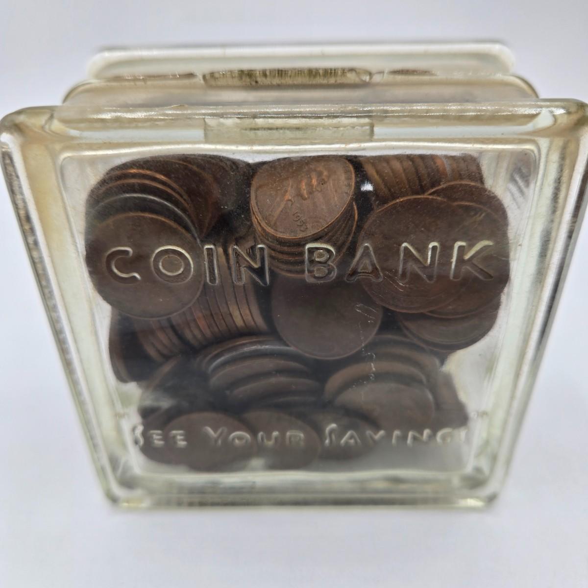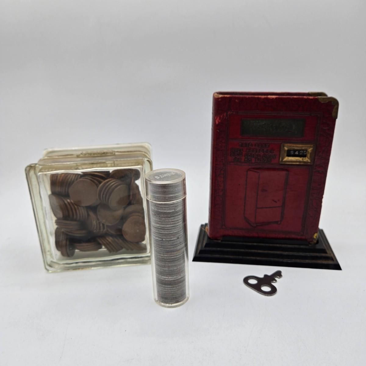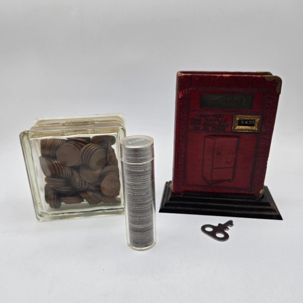 LOT 32: Glass Bank Filled with Wheat Pennies, Cylinder Filled with Steel Pennies and Zell Products Corp. Book Bank with Key Filled with Steel Pennies