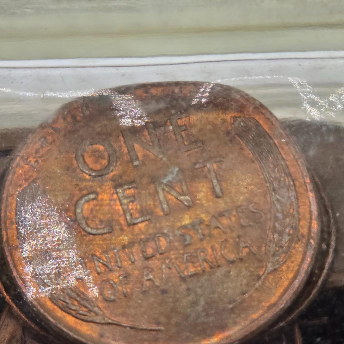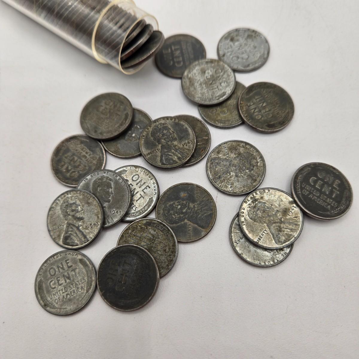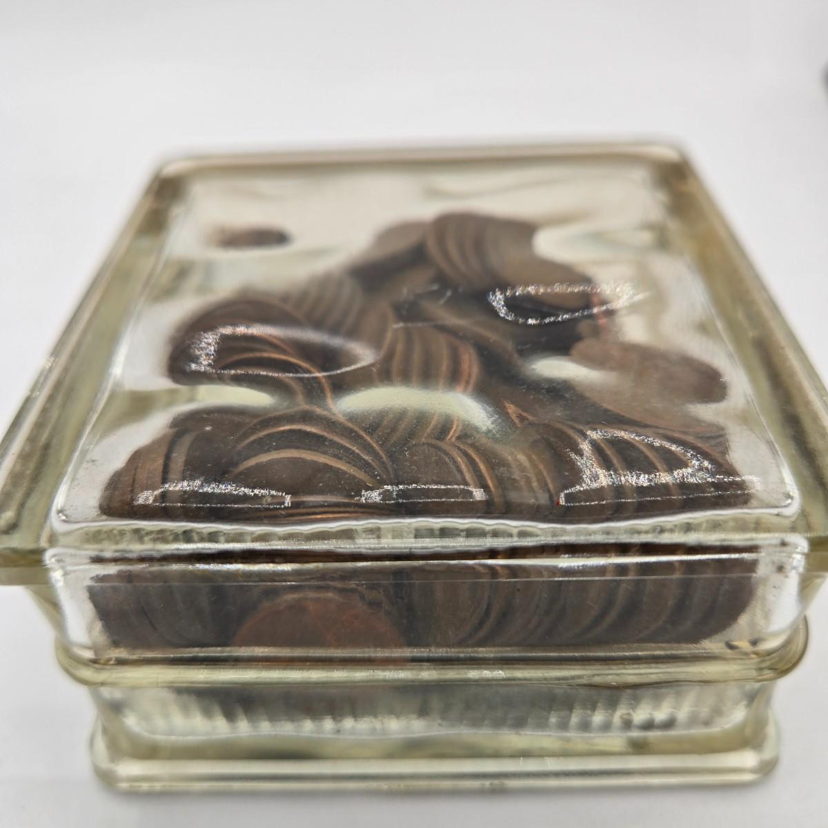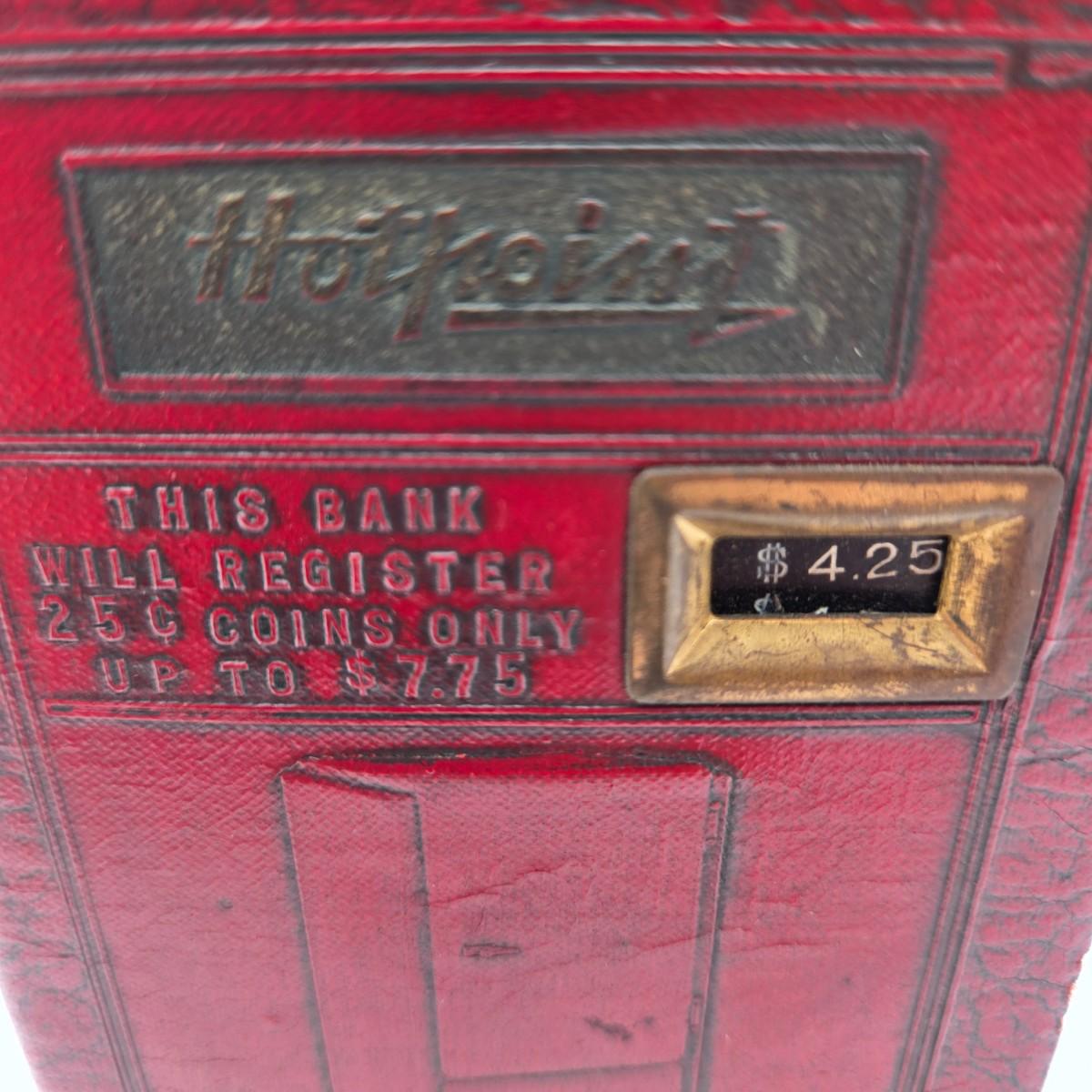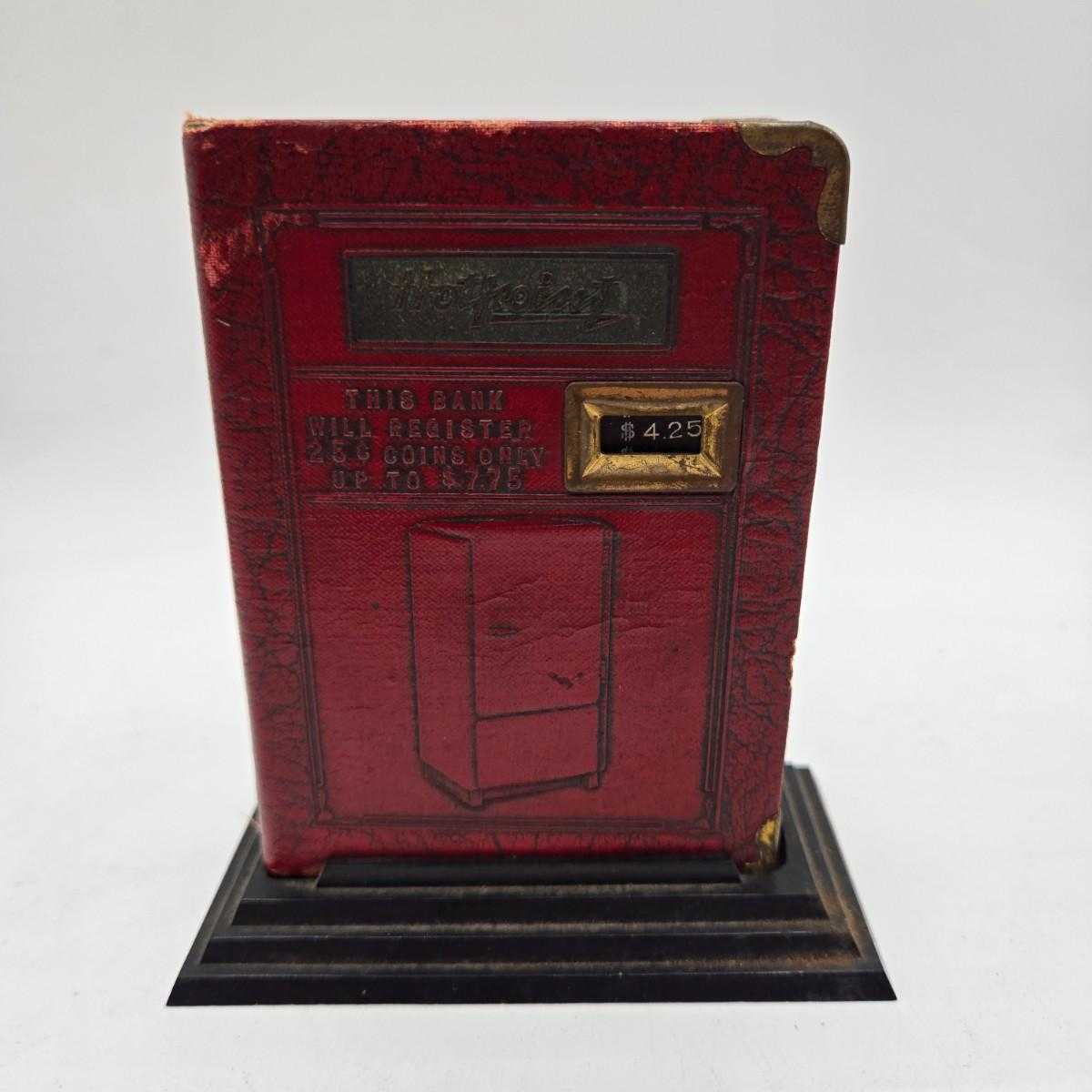LOT 32: Glass Bank Filled with Wheat Pennies, Cylinder Filled with Steel Pennies and Zell Products Corp. Book Bank with Key Filled with Steel Pennies