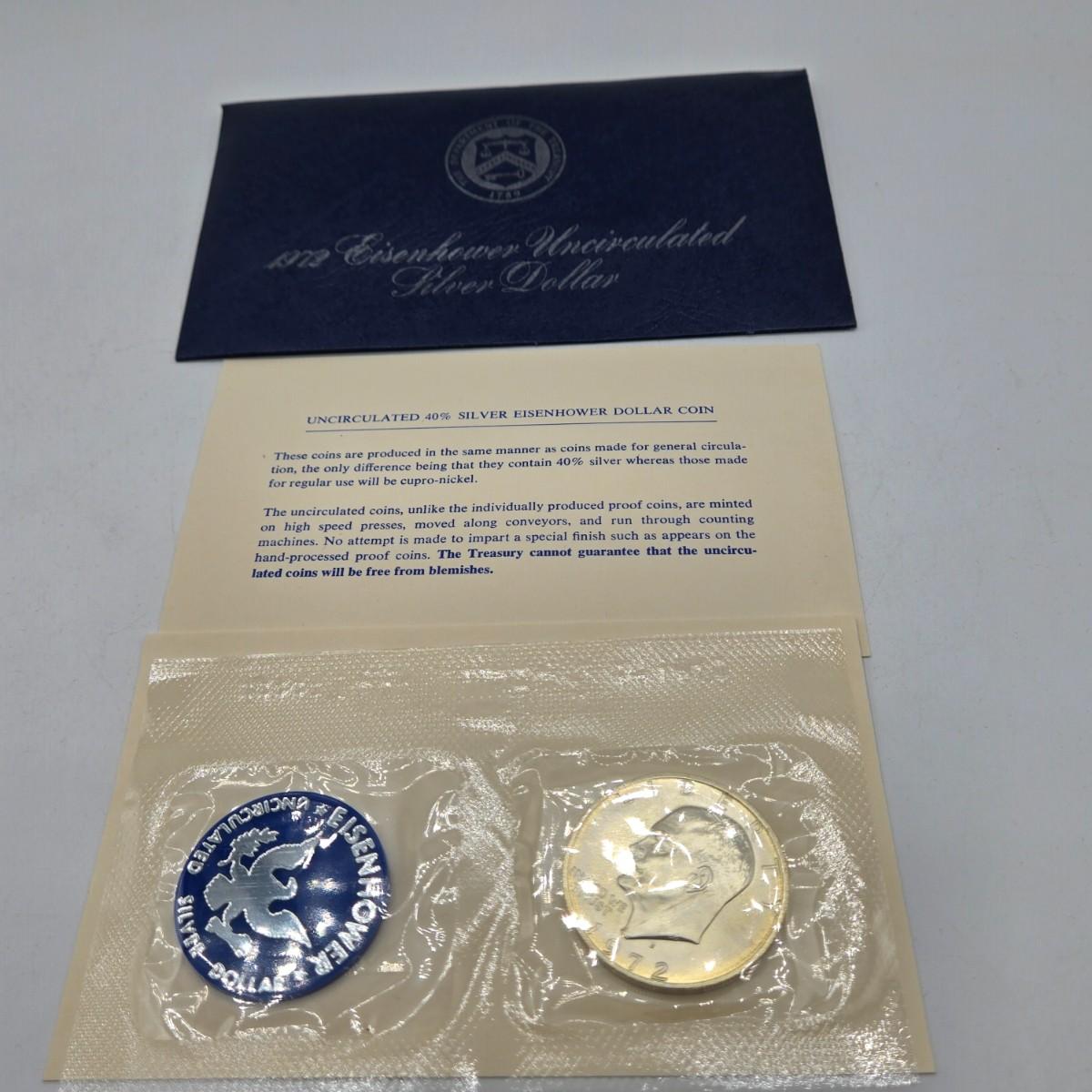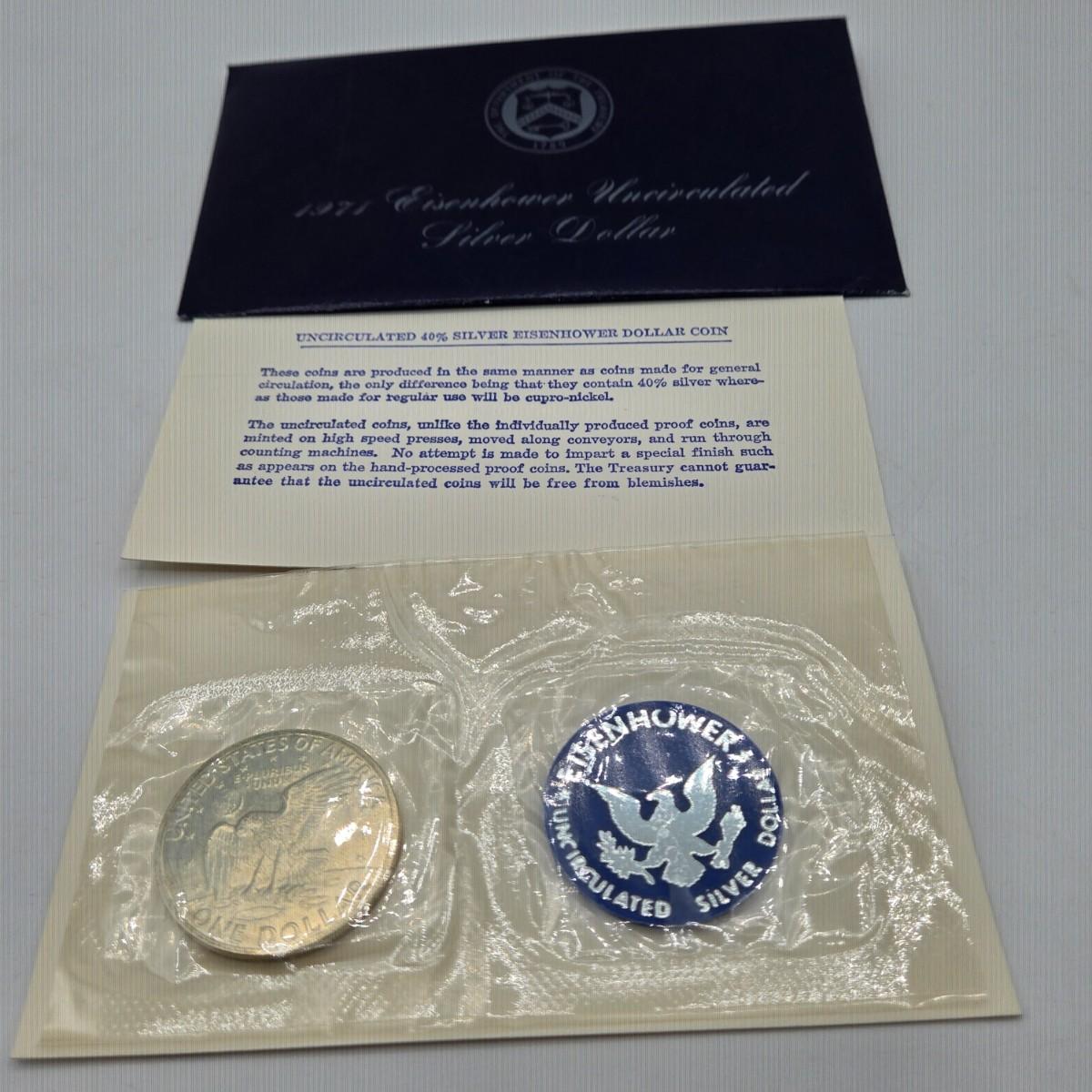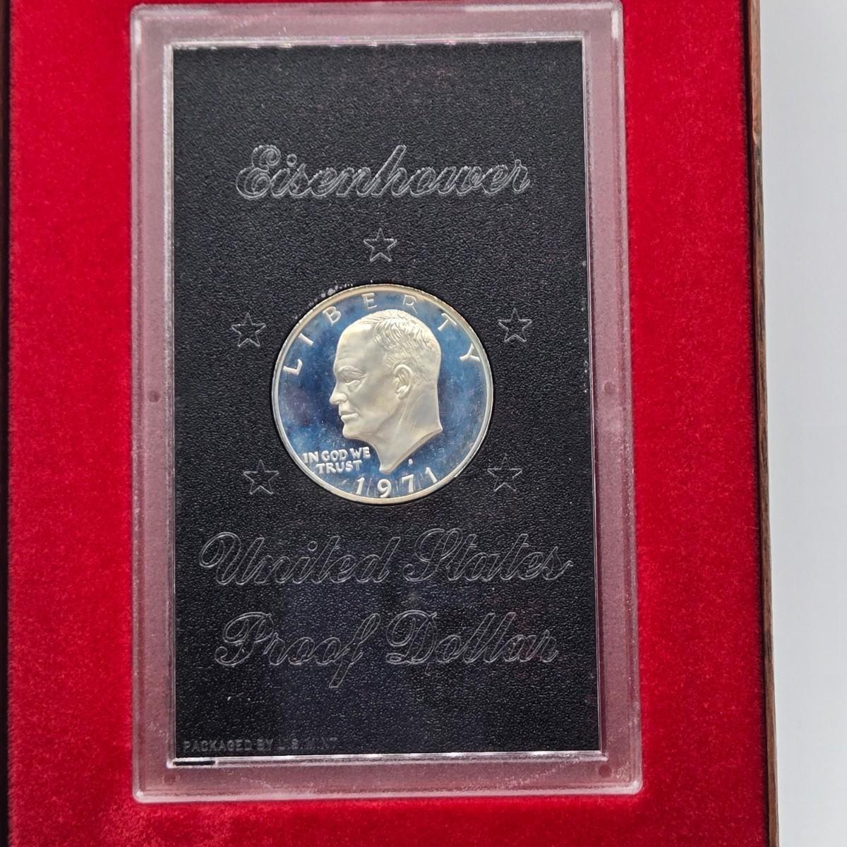 LOT 128: 1971 Eisenhower Silver Proof Dollar, 1972 & 1974 Eisenhower Proof Dollars, 1976 Bicentennial Silver Proof Set, and 1971 & 1972 Uncirculated 40% Silver Eisenhower Dollar Coins,