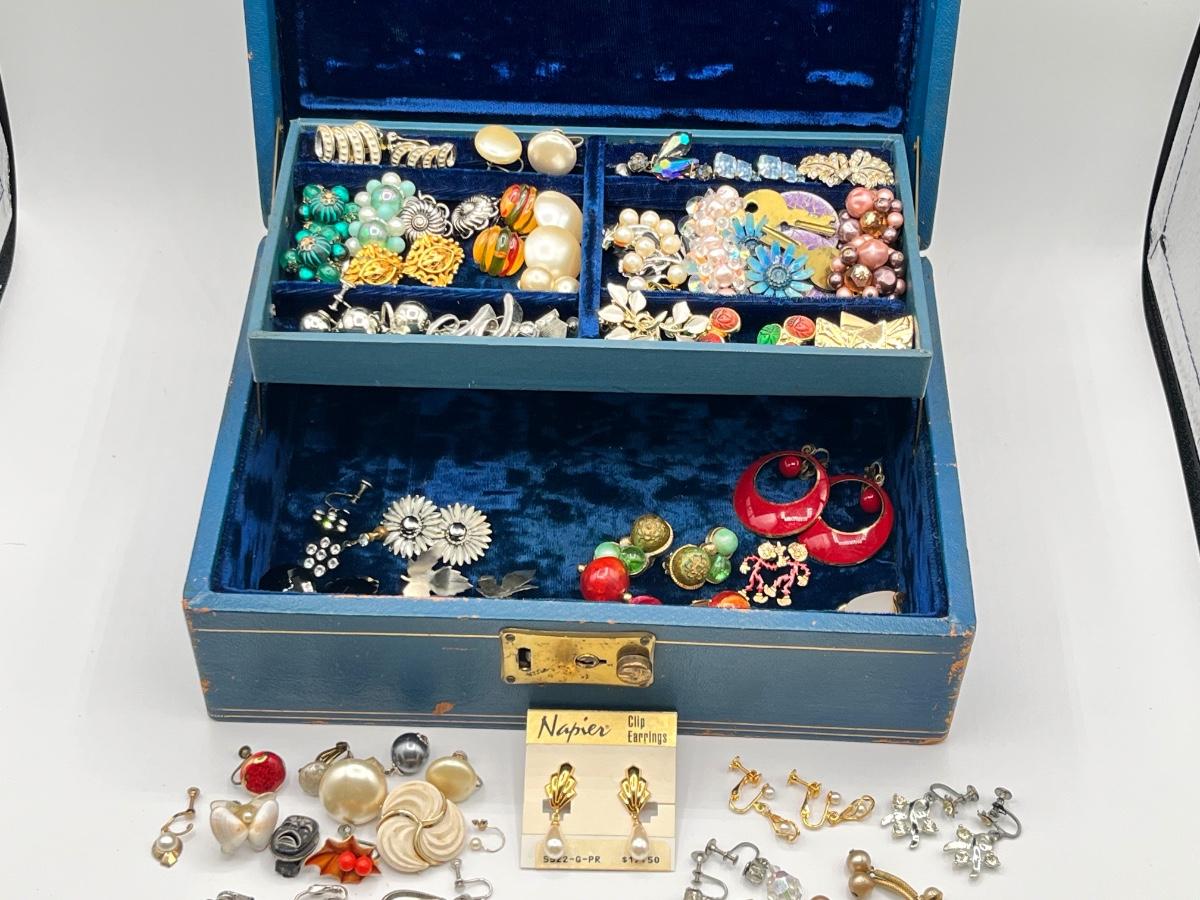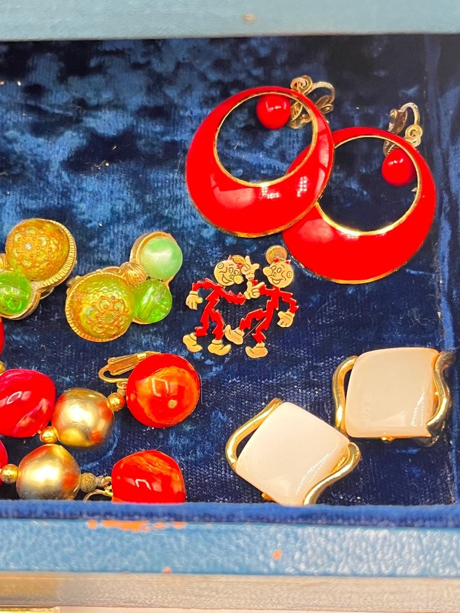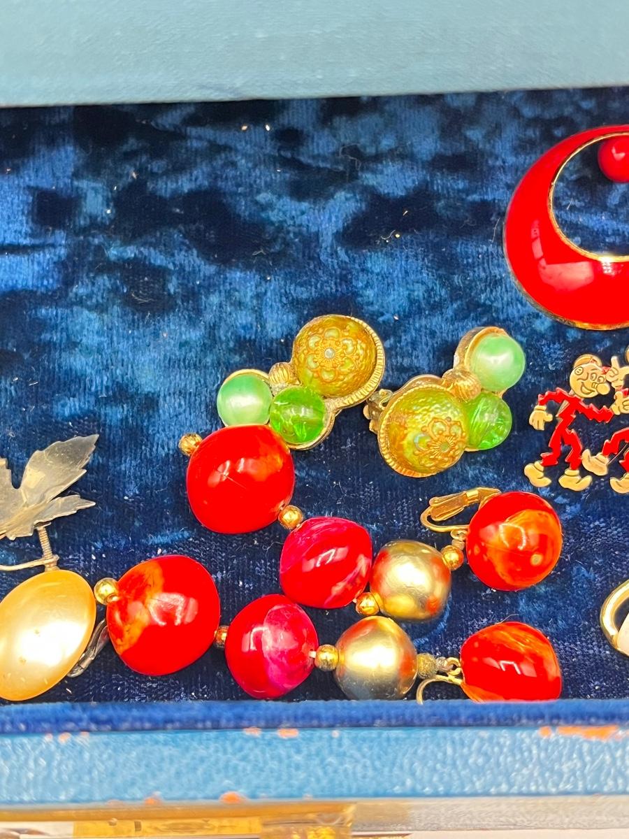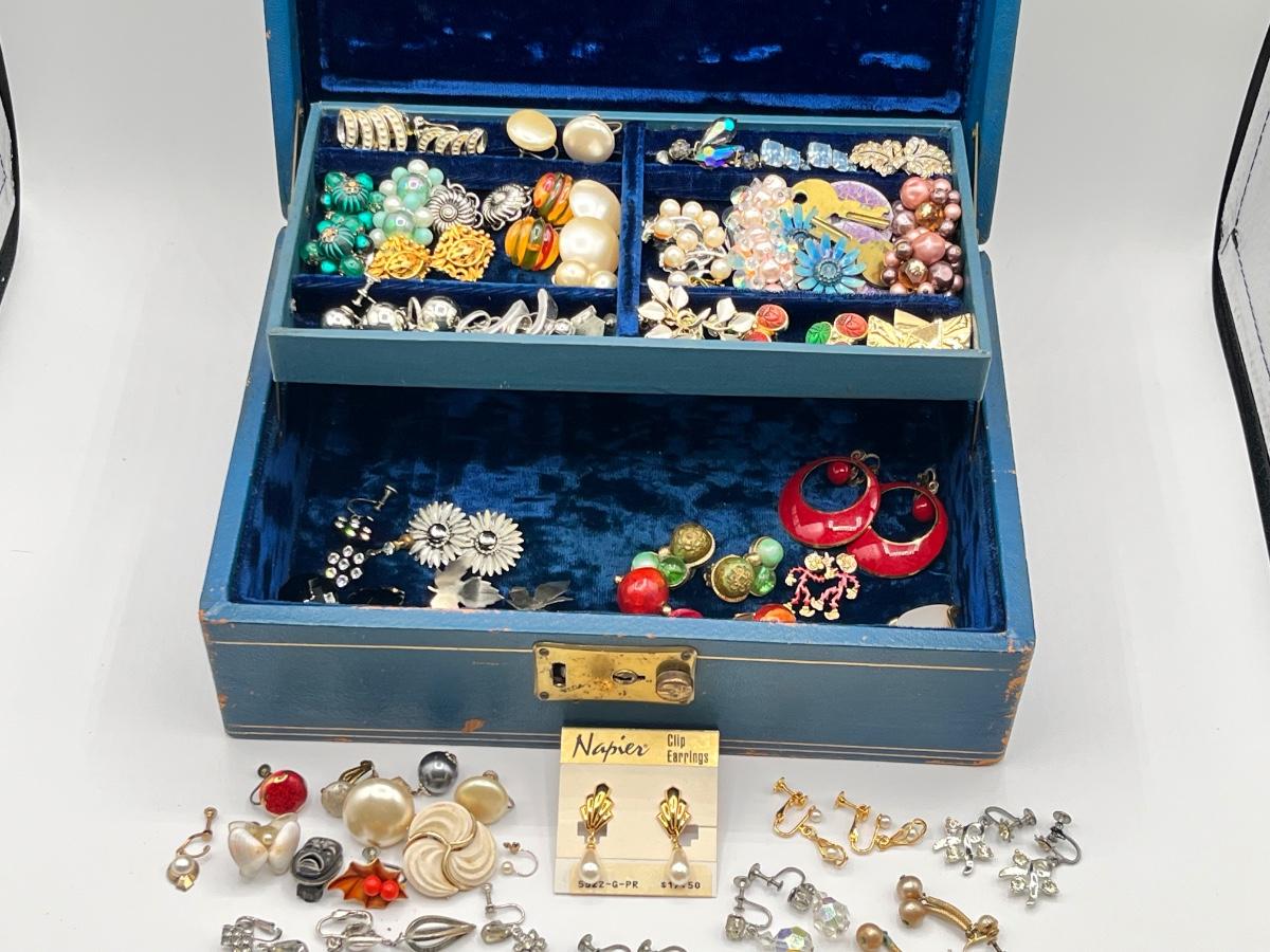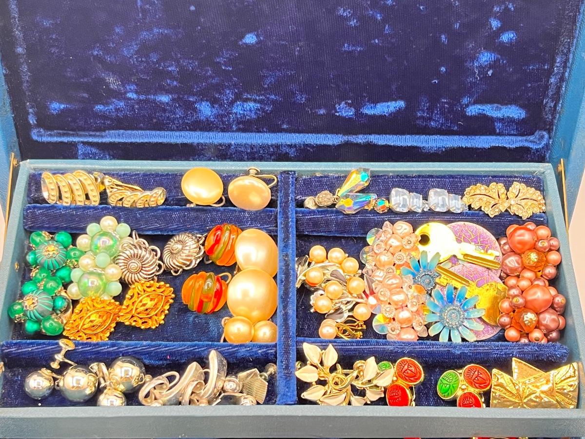 LOT 115: Bold and Colorful Earring Collection with Pretty Blue Lined Box...Mix of Screwback and Clip Ons