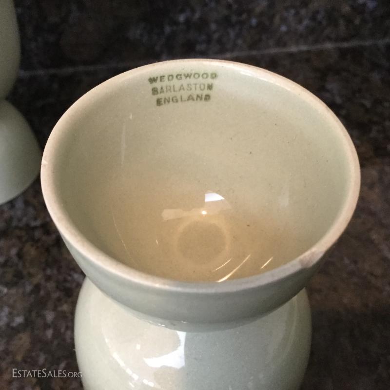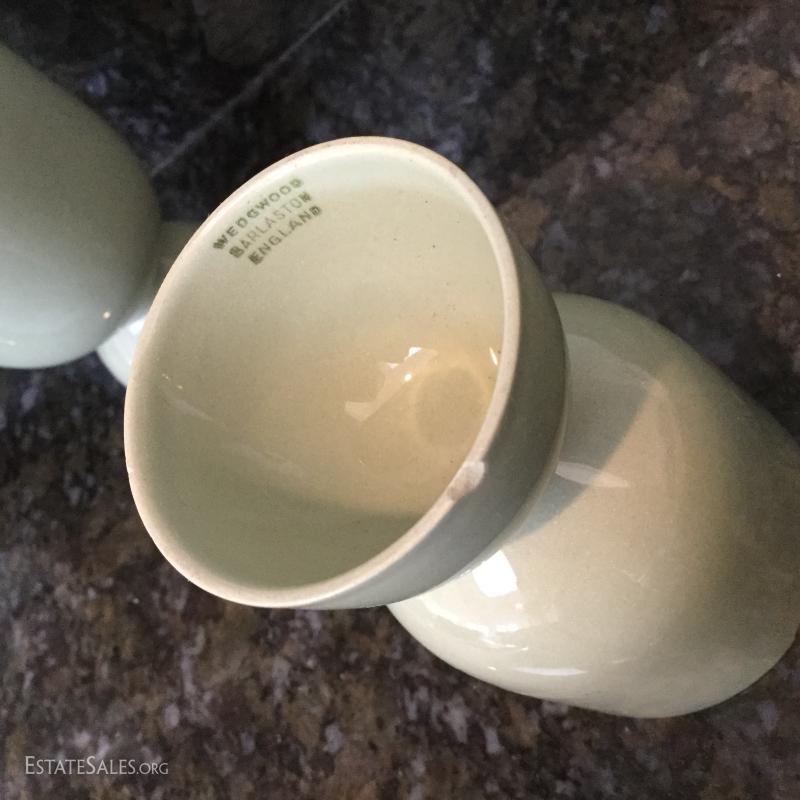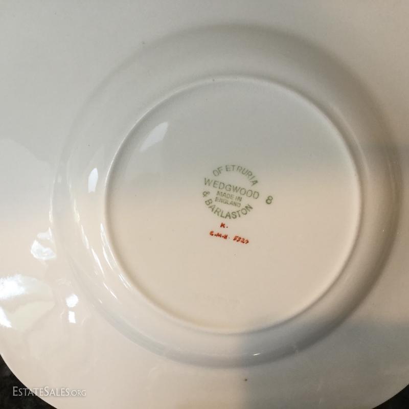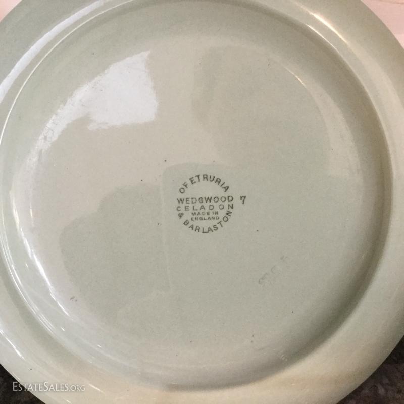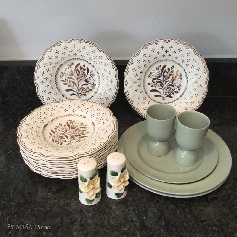 Set of twelve Wedgwood of Etruria & Barlaston plates, 8.5"diameter. Made in England. Beautiful gold and cream design. Three green Wedgwood plates and two egg holders (both have small chips on bottom). Lot also includes floral salt and pepper shaker. See photos. Shipping available or local pick up in Flat Rock, NC.