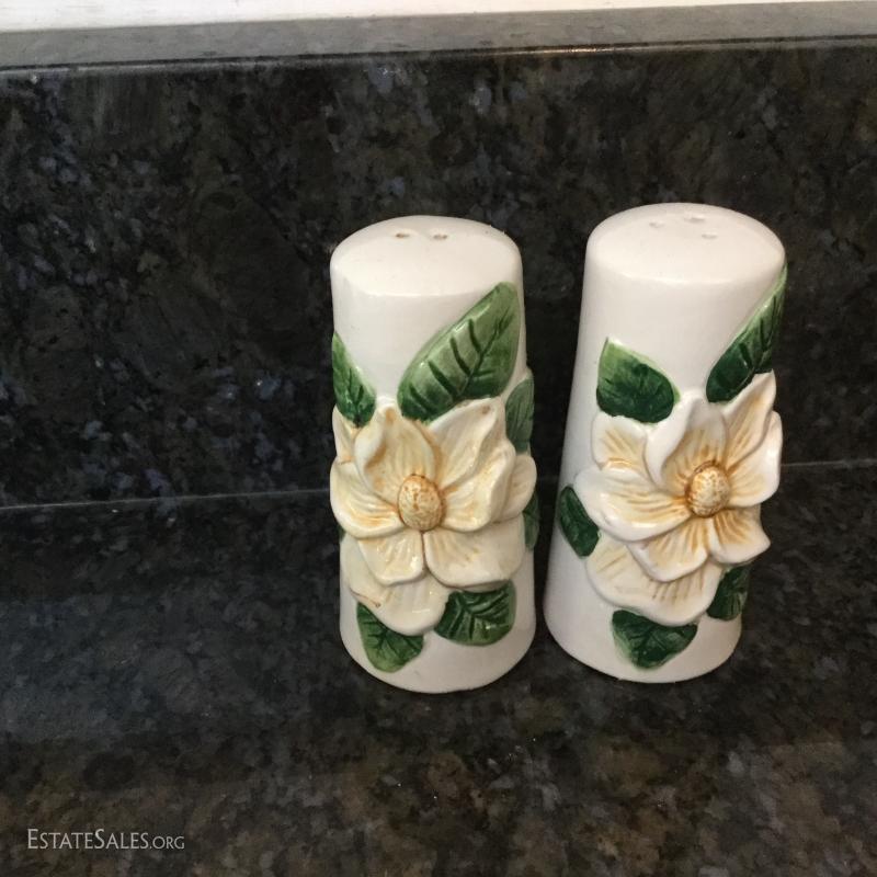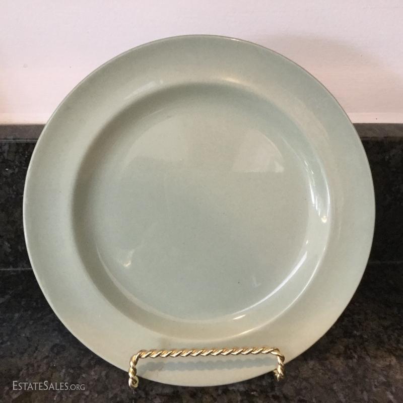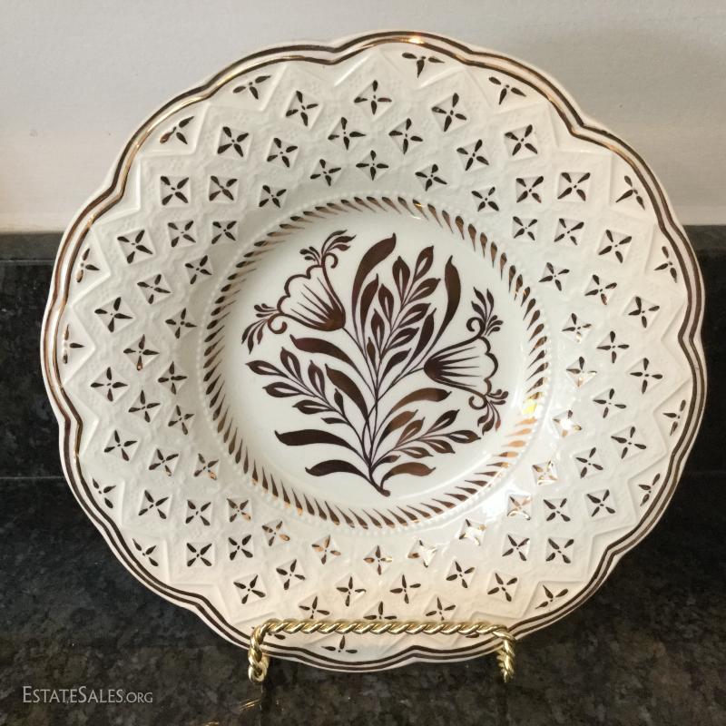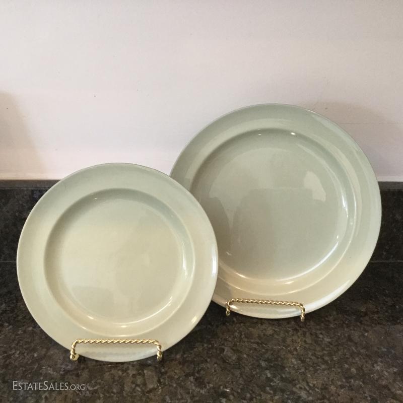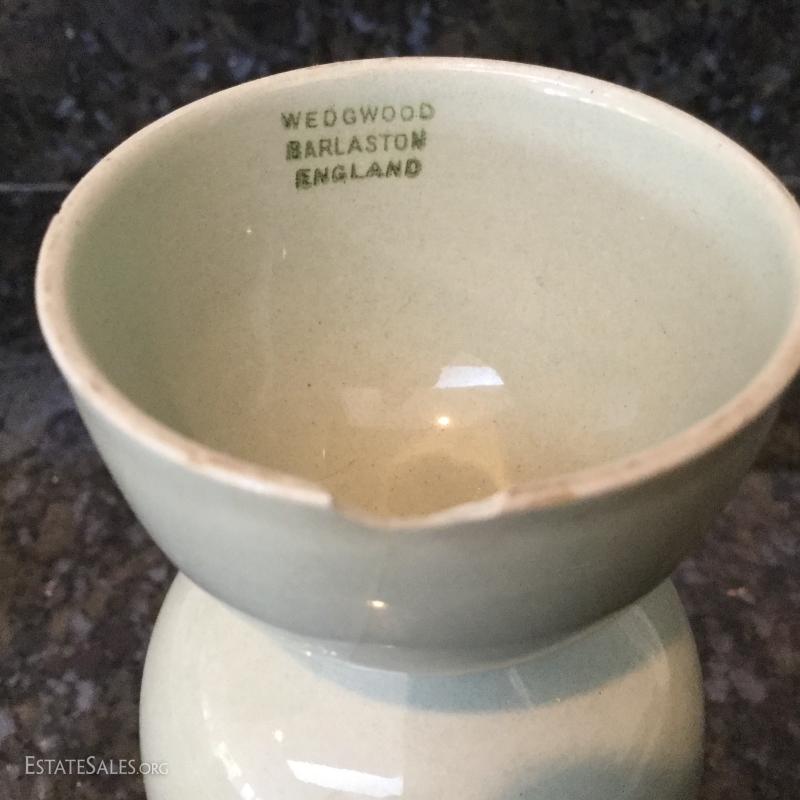 Set of twelve Wedgwood of Etruria & Barlaston plates, 8.5"diameter. Made in England. Beautiful gold and cream design. Three green Wedgwood plates and two egg holders (both have small chips on bottom). Lot also includes floral salt and pepper shaker. See photos. Shipping available or local pick up in Flat Rock, NC.