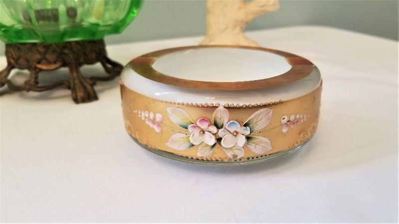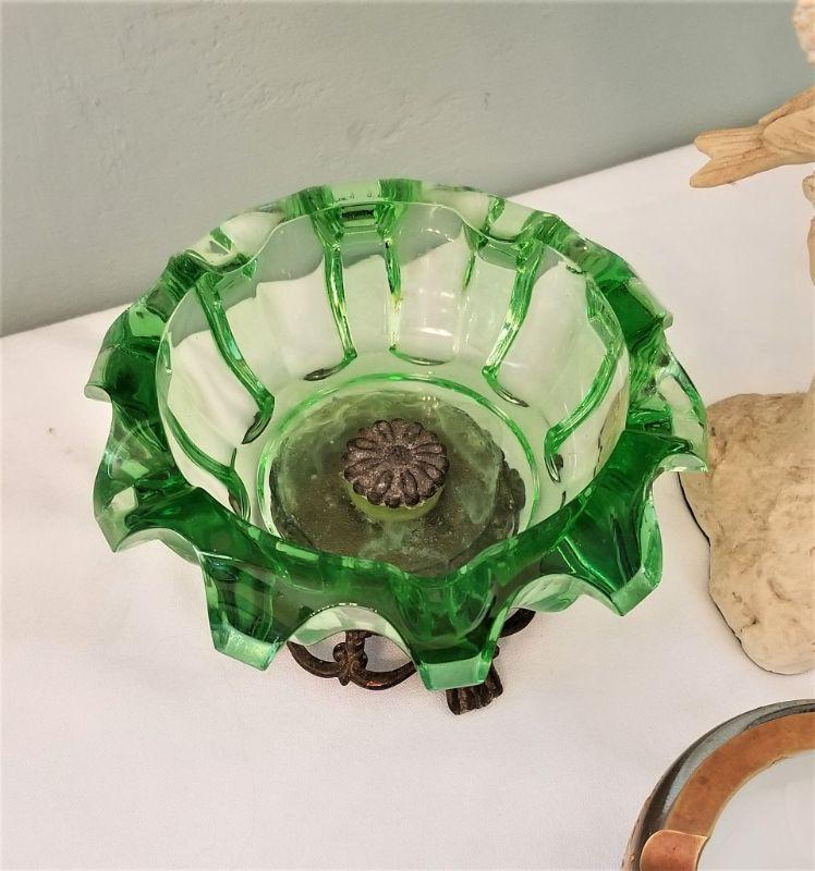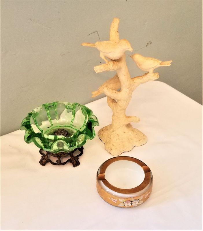 Three pieces of bric a brac - contemporary bird on branch sculpture - vintage green glass ashtray on base - opalescent glass ashtray with applied porcelain flowers. Bird is 10" tall. Green ashtray is 4" tall, 6" across. Opalescent piece is 1.5" tall, 4" across.
