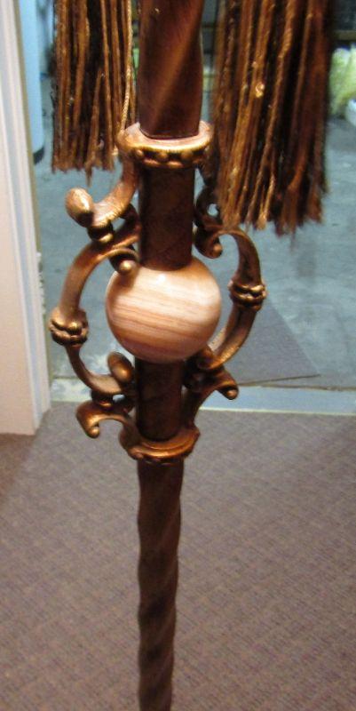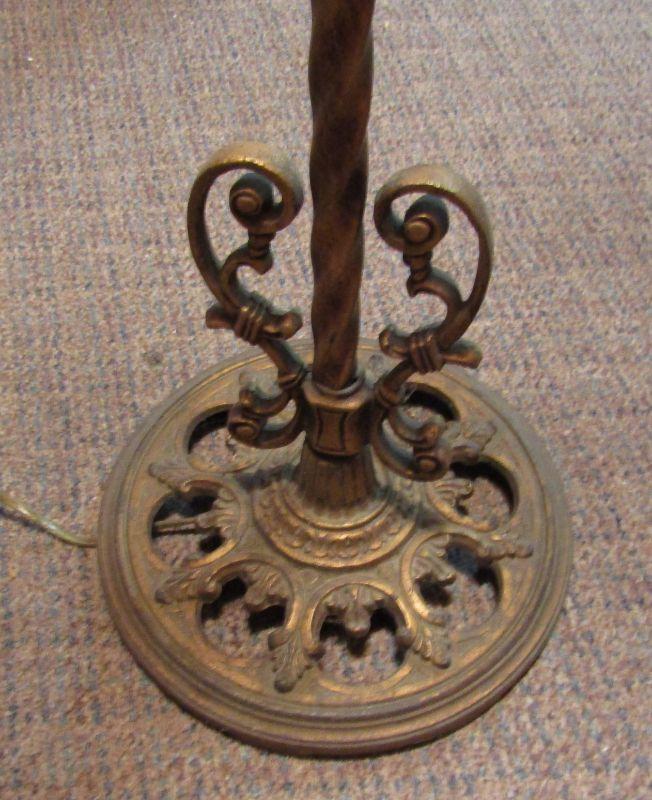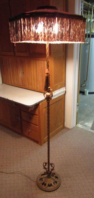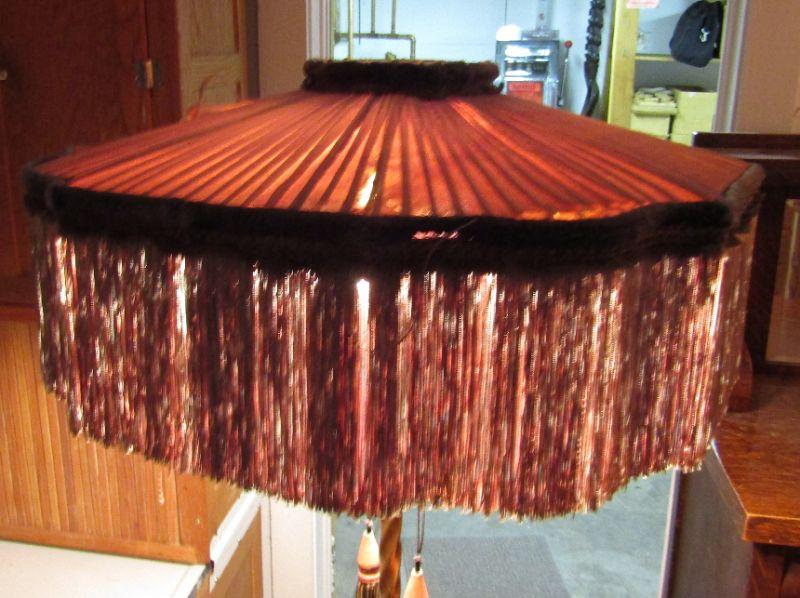 ANTIQUE BRASS BASE FLOOR LAMP WITH ORIGINAL FRINGED LAMP SHADE