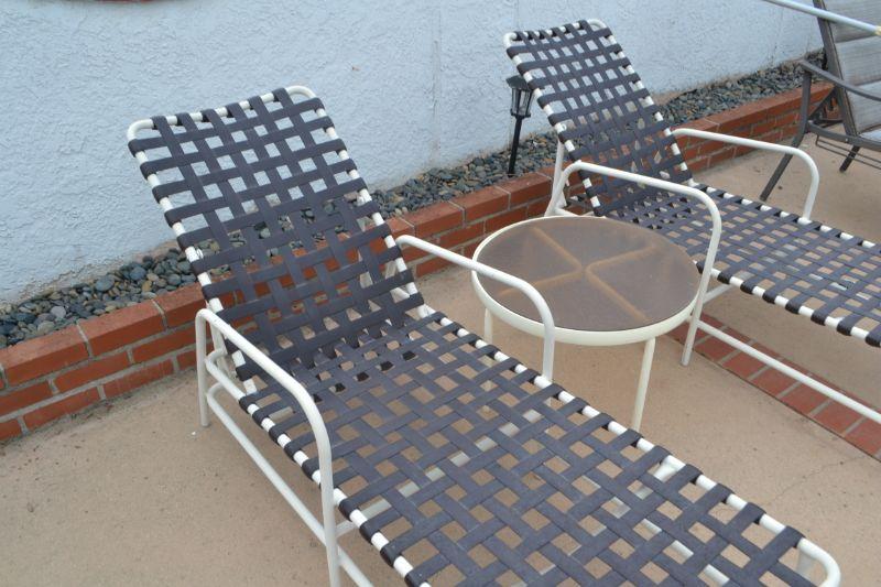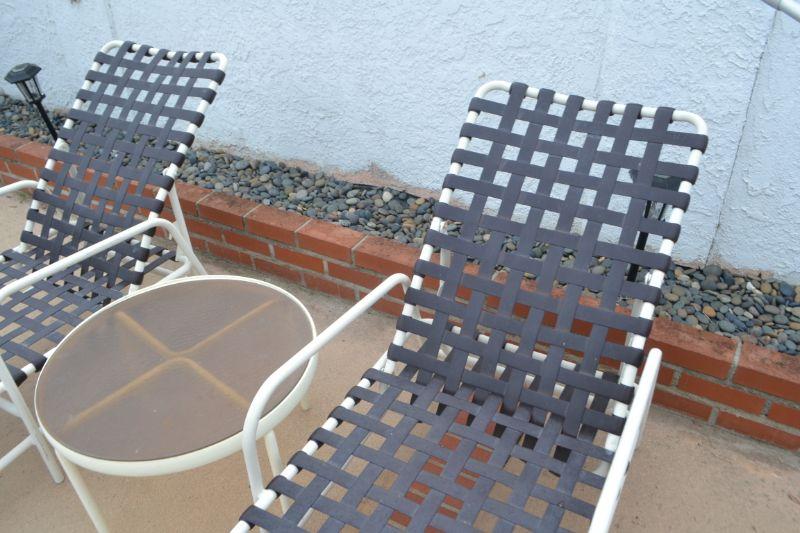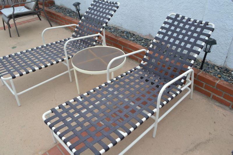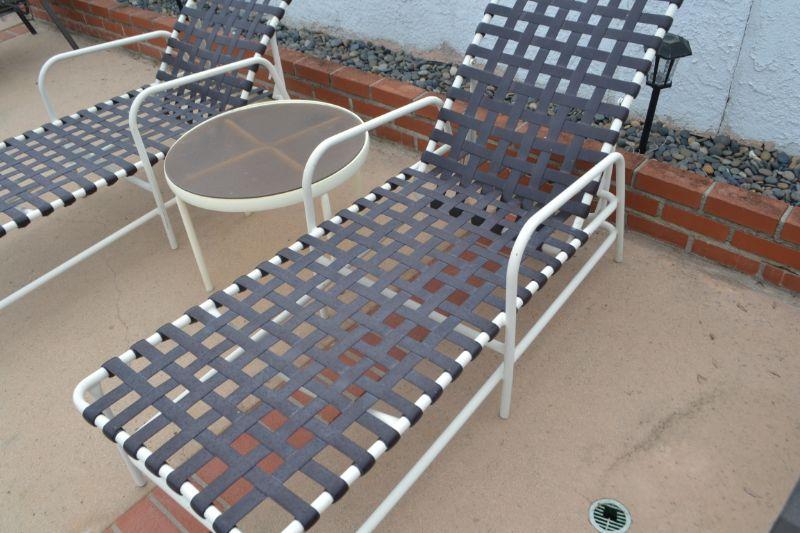 METAL AND STRAP PATIO LOUNGERS AND TABLE