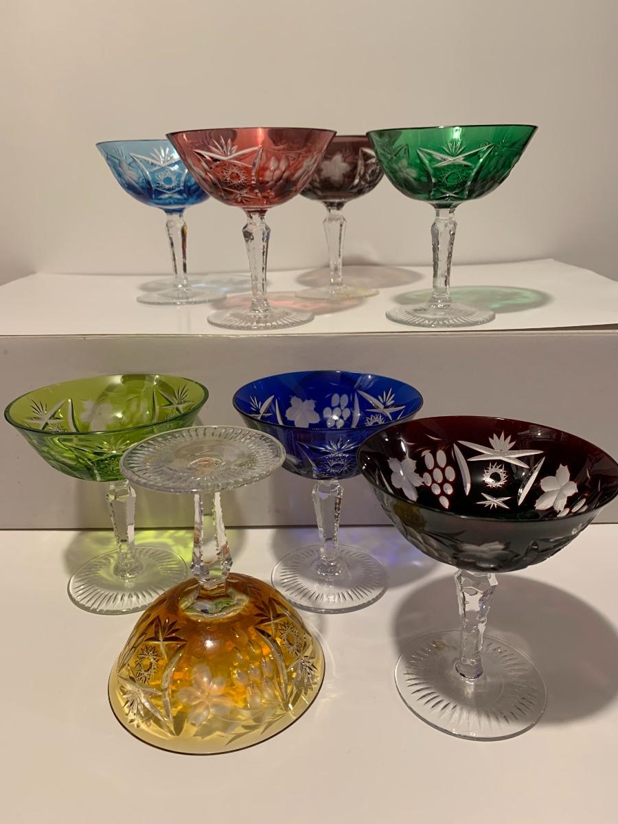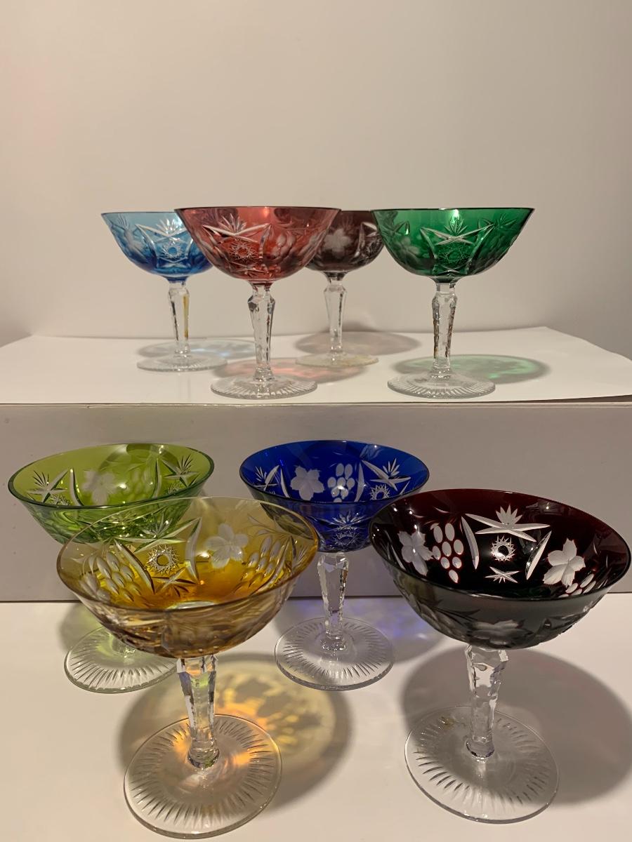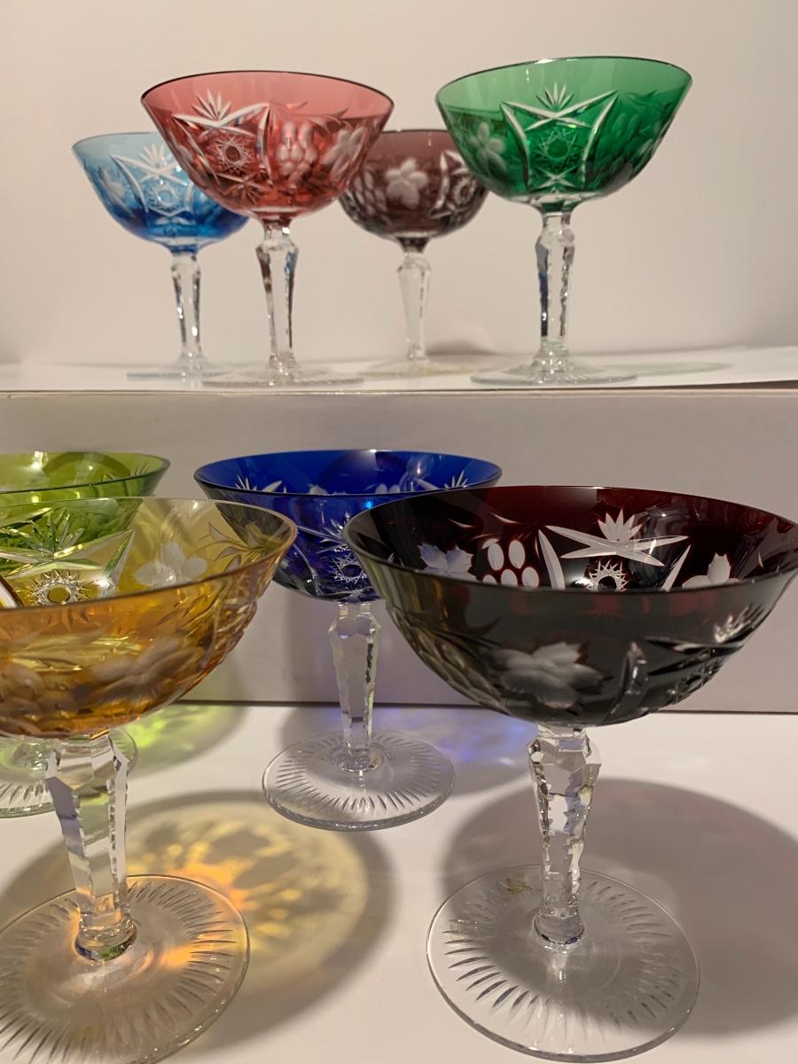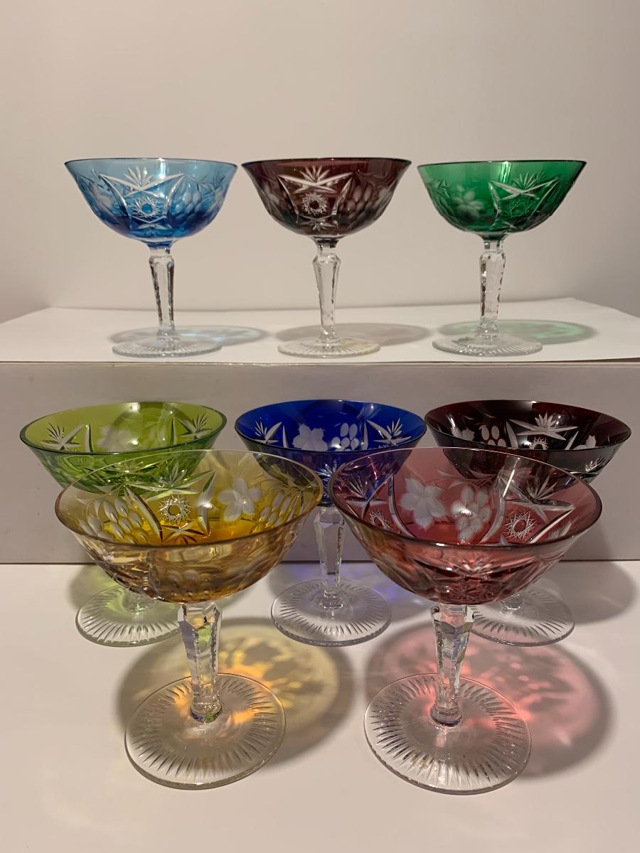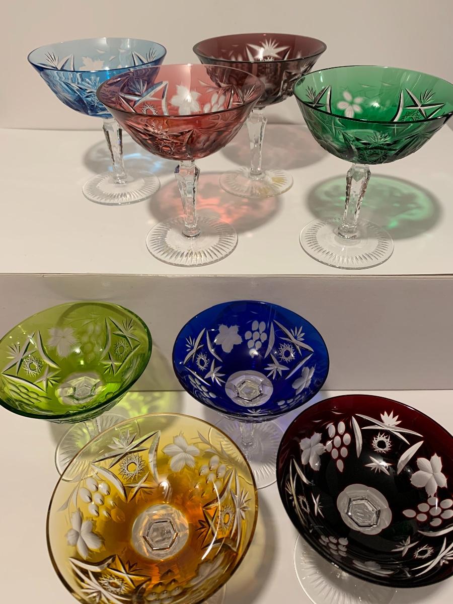 Beautiful set of 8 multicolored cut to clear glassware with notched stems from Germany Just stunning. They have had minimal use if any. The crystal is nice and clear without any residue.