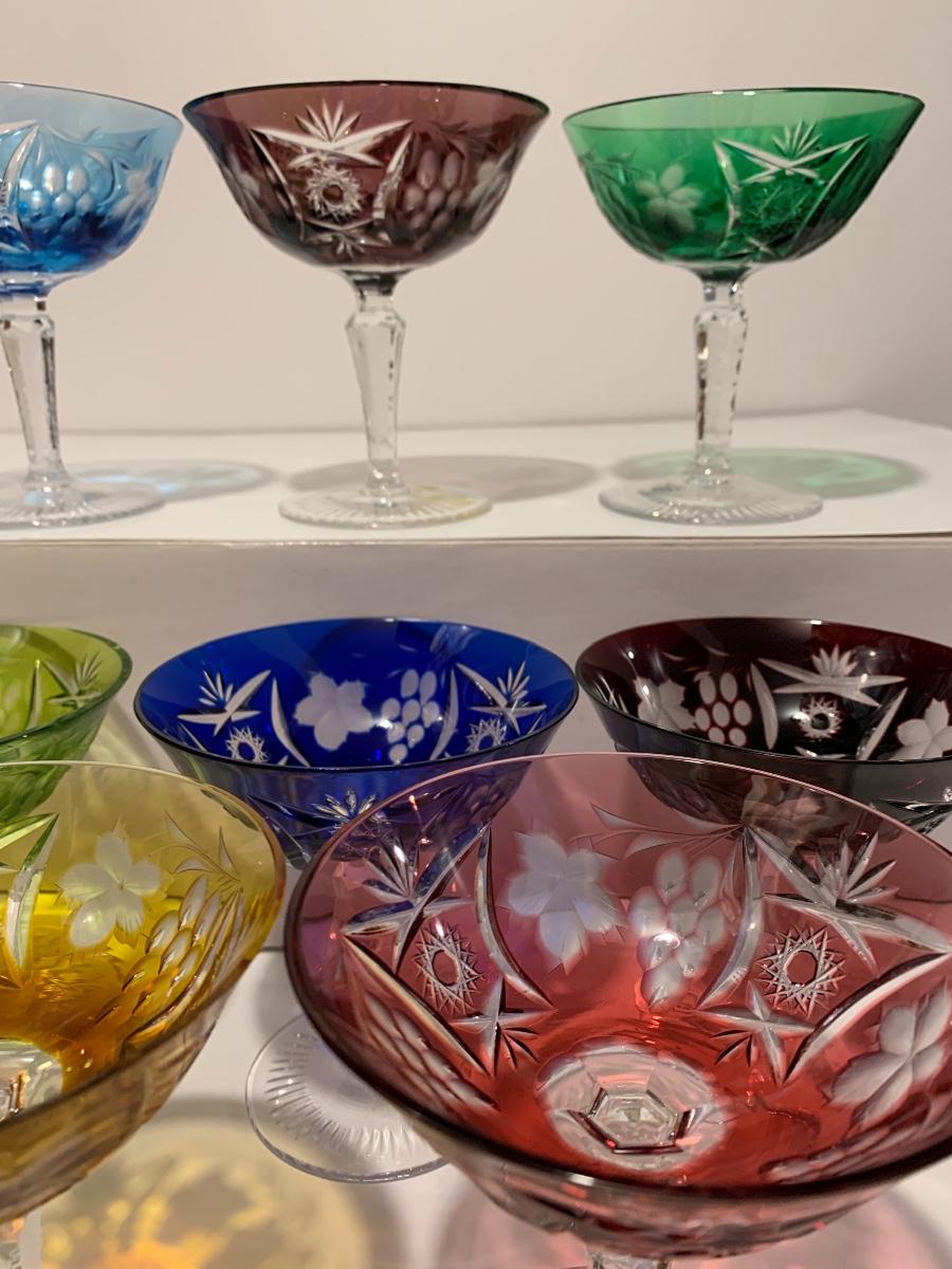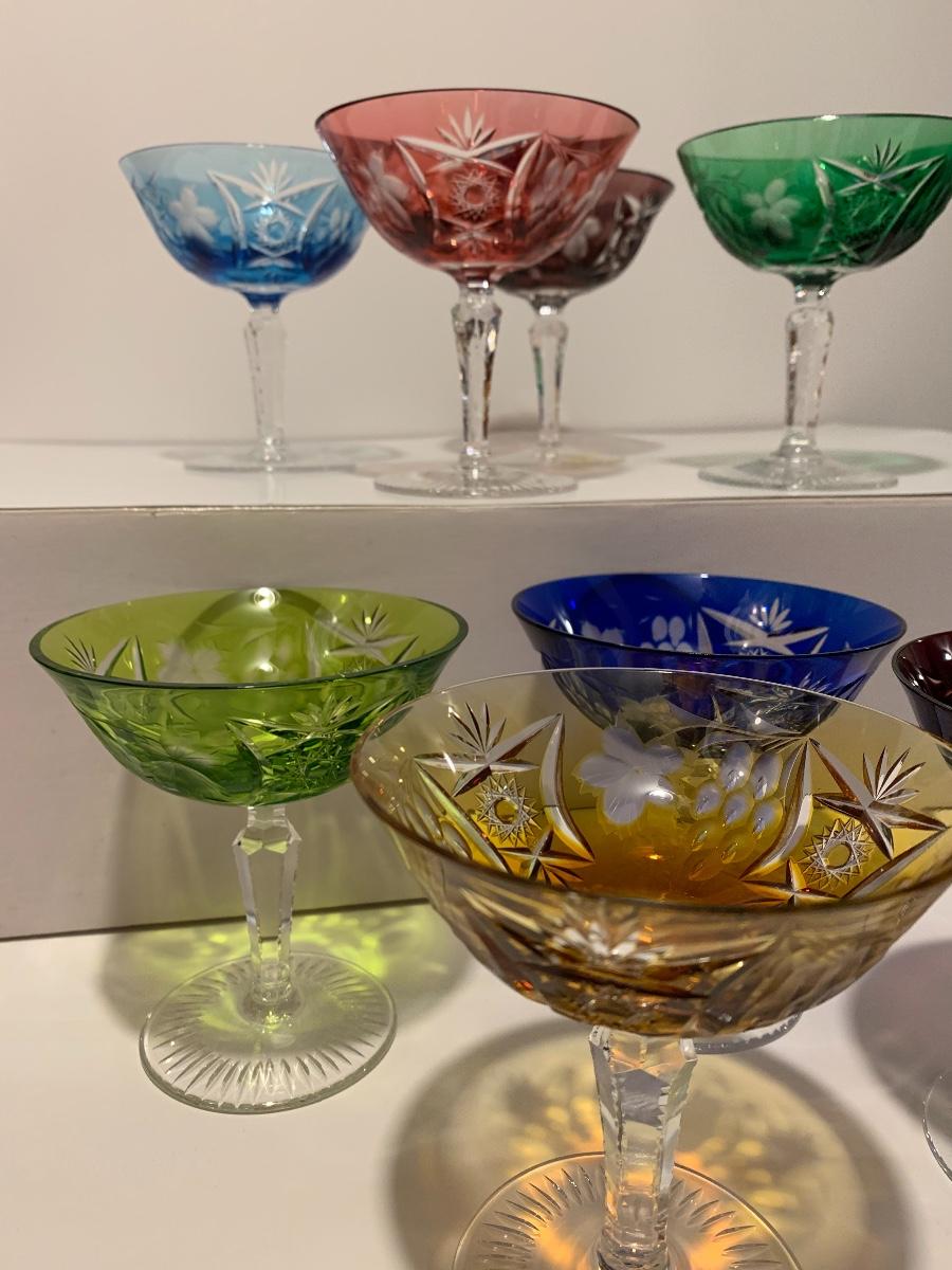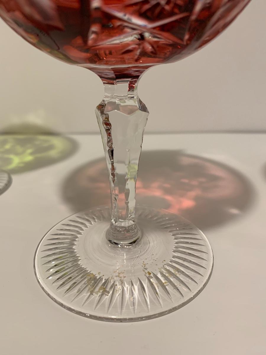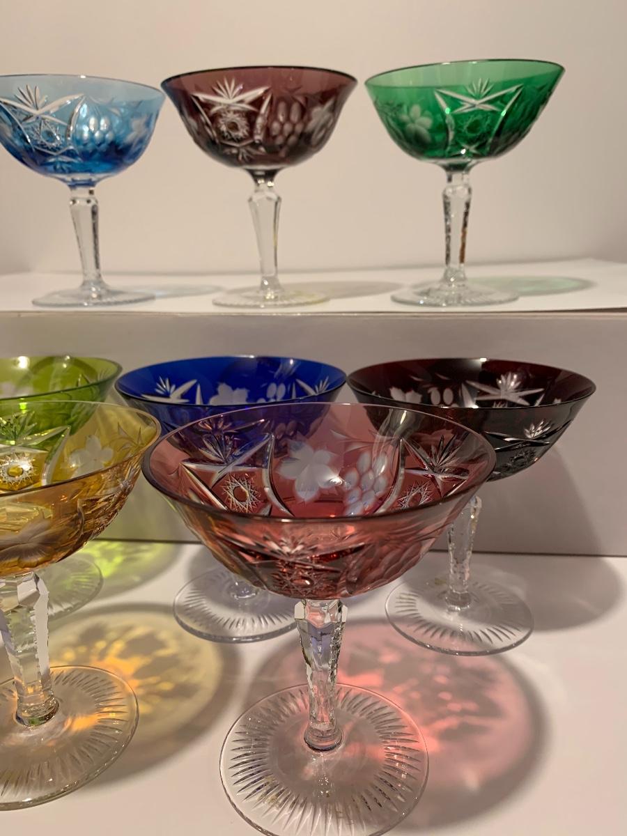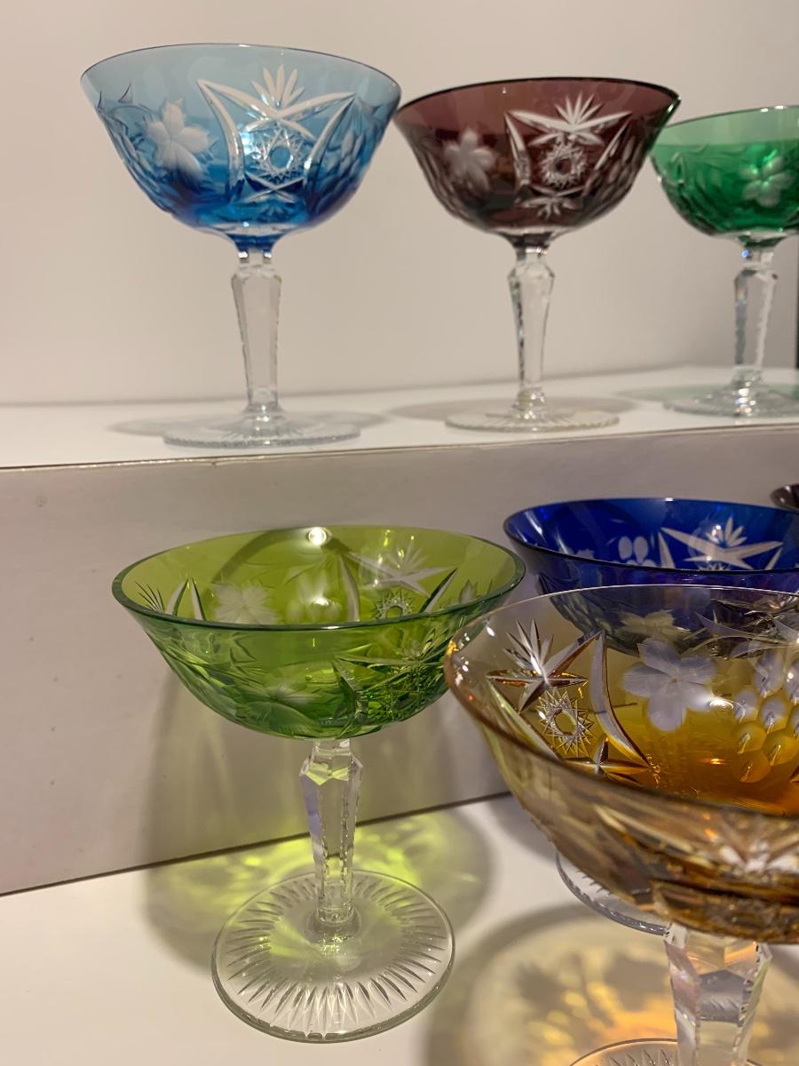 Beautiful set of 8 multicolored cut to clear glassware with notched stems from Germany Just stunning. They have had minimal use if any. The crystal is nice and clear without any residue.