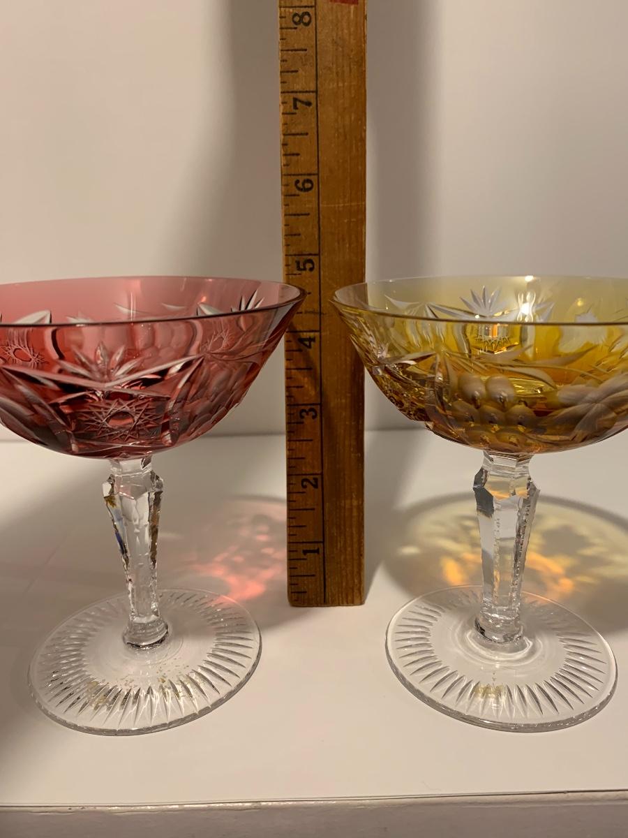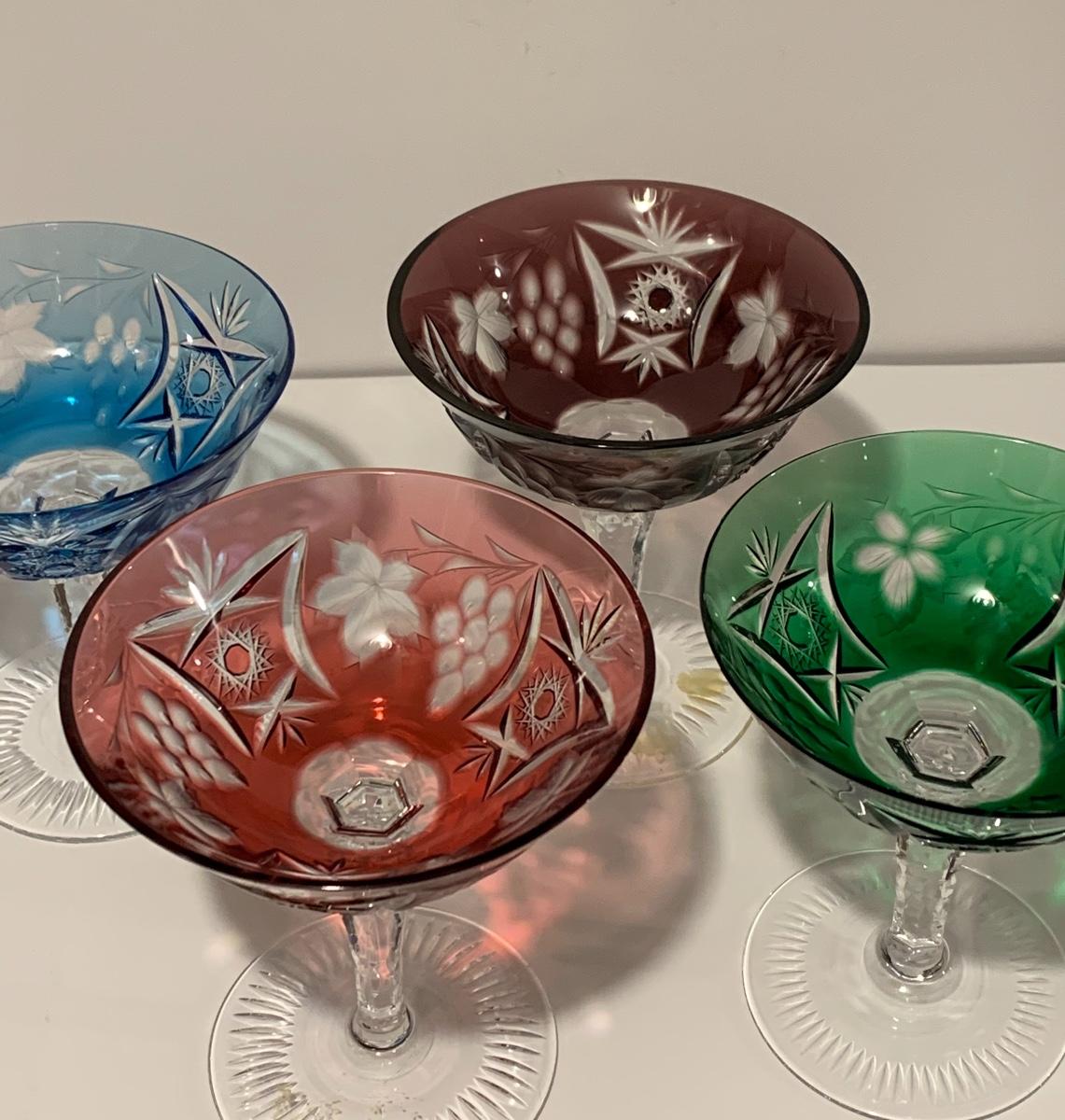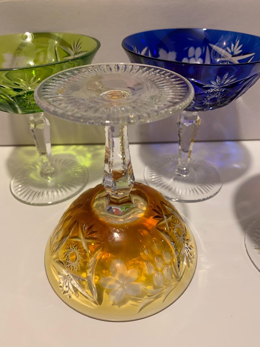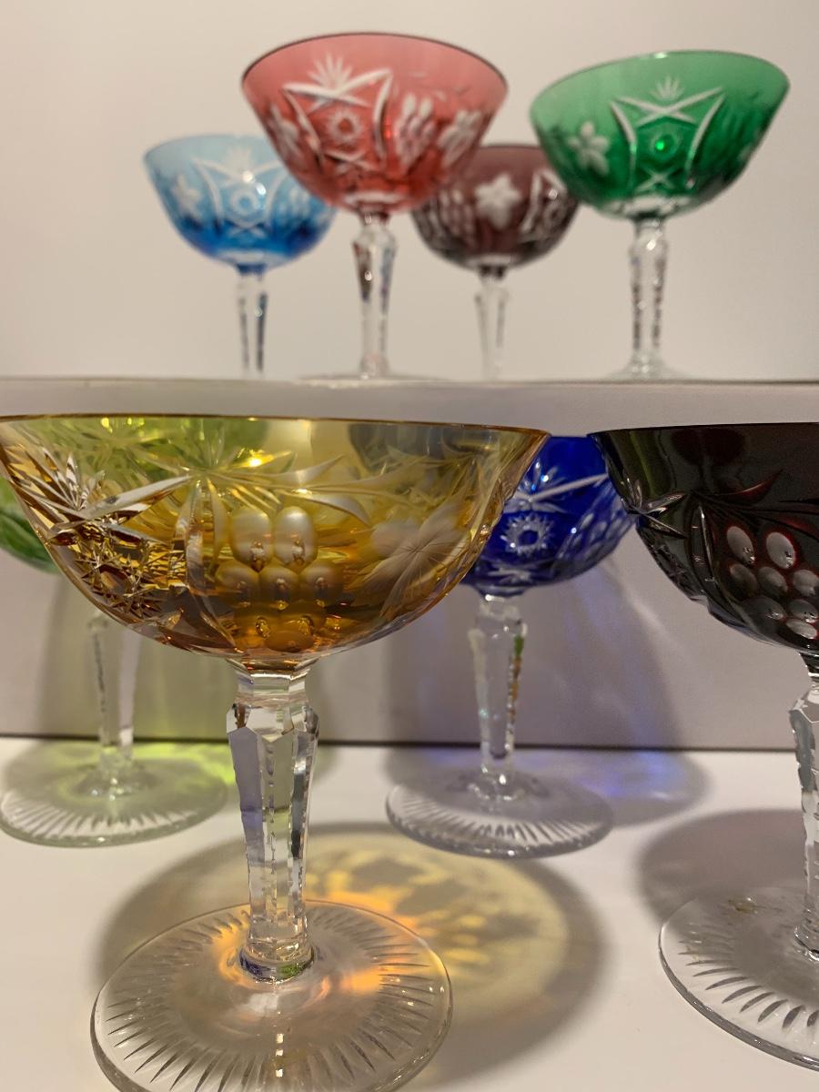 Beautiful set of 8 multicolored cut to clear glassware with notched stems from Germany Just stunning. They have had minimal use if any. The crystal is nice and clear without any residue.