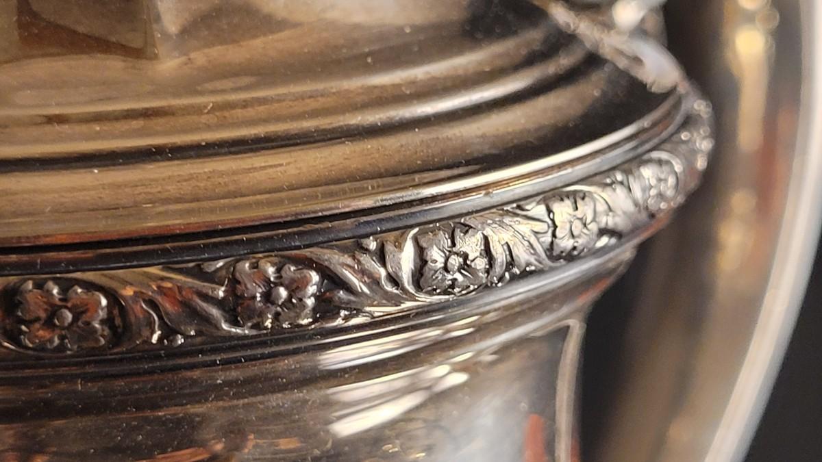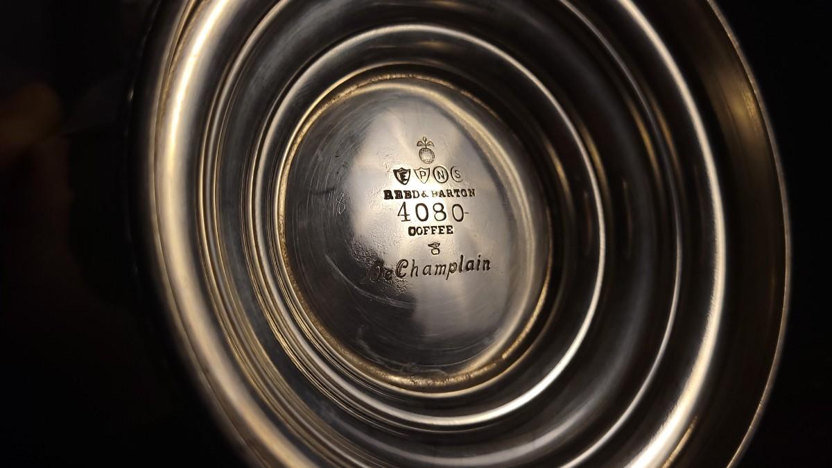 This lot features a beautiful REED & BARTON Silverplated DeChamplain Coffee Pitcher with Lid. To be expected with all REED & BARTON creations, this Coffee Pitcher shows a large amount of fine detail and reflects light brilliantly despite being unpolished. No dents or major defects observed during inspection.