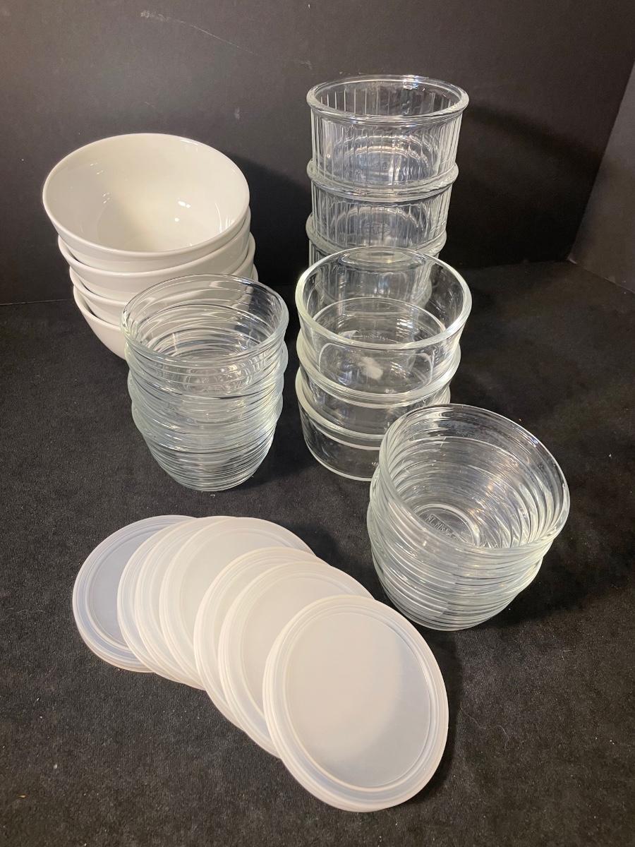 Includes set of 4 matching ramekins, set of 4 white small bowls, 7 small bowls with lids and 3 glass ramekins.