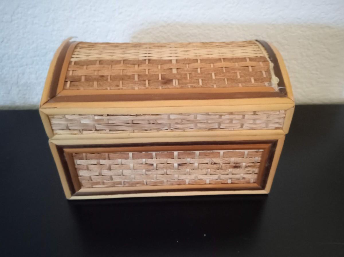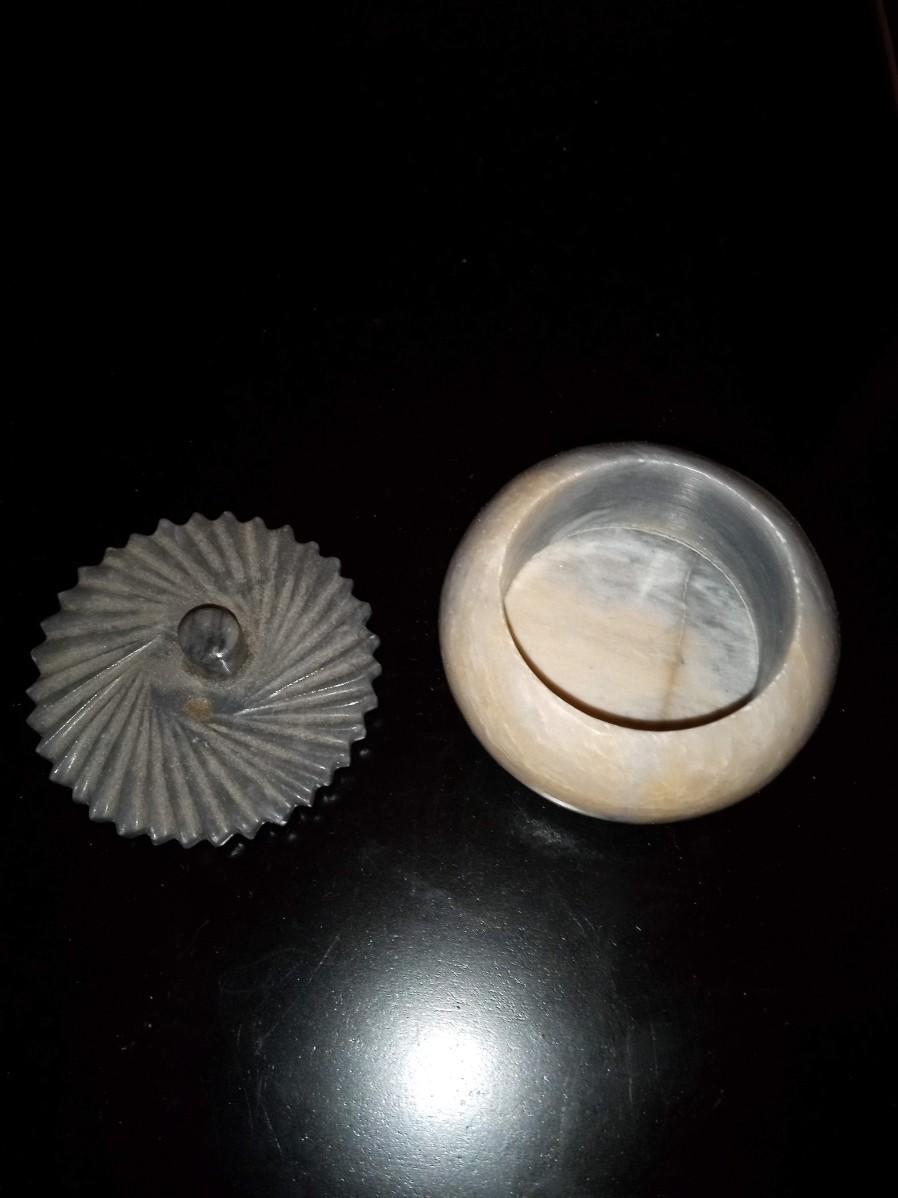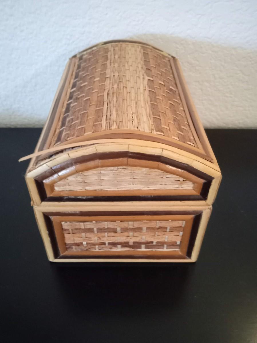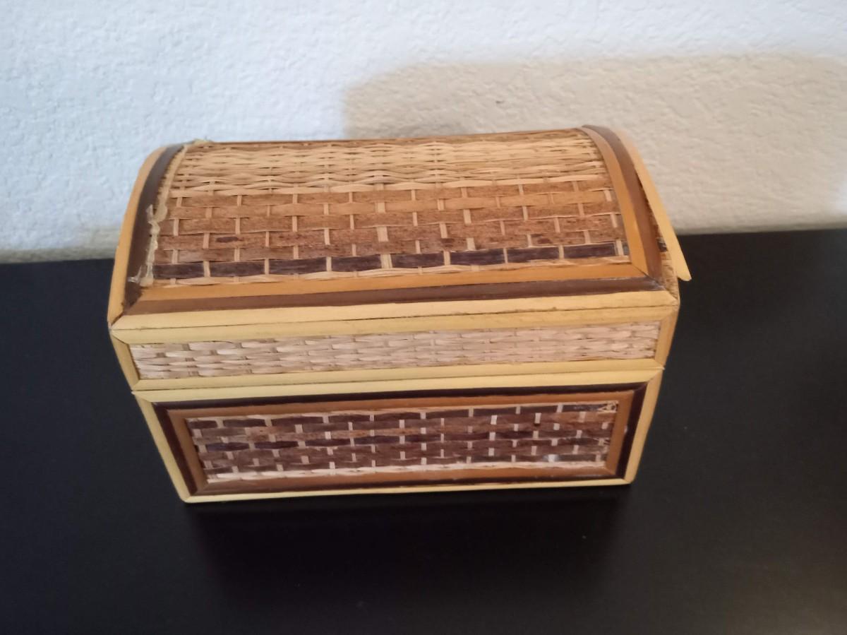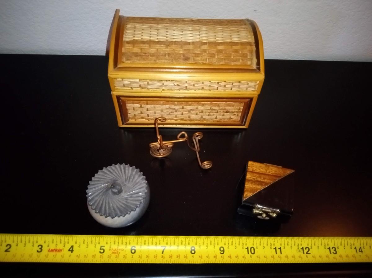 ROUND MARBLE TRINKET BOX, HINGED SMALL WOODEN BOX, HINGED STRAW LIKE COVERED BOX AND A COPPER TRIKE