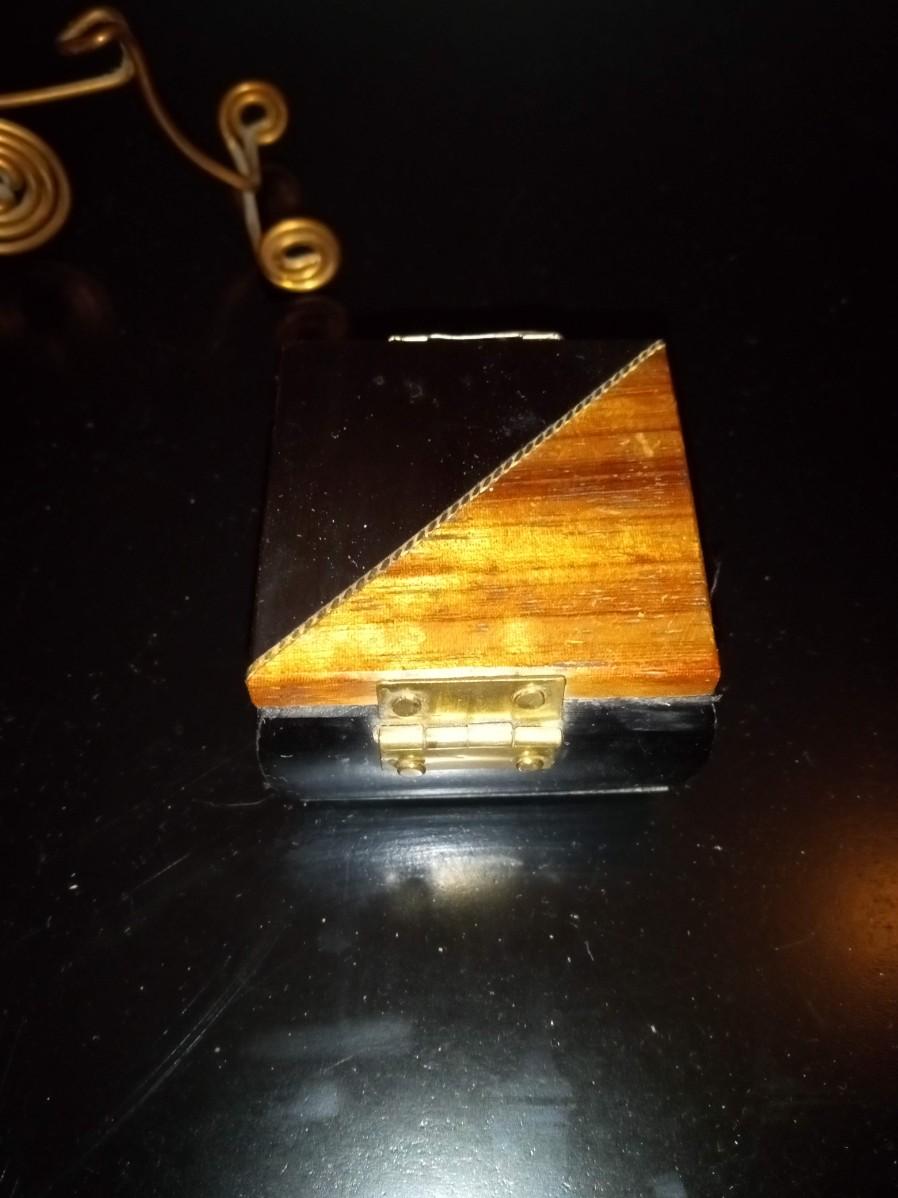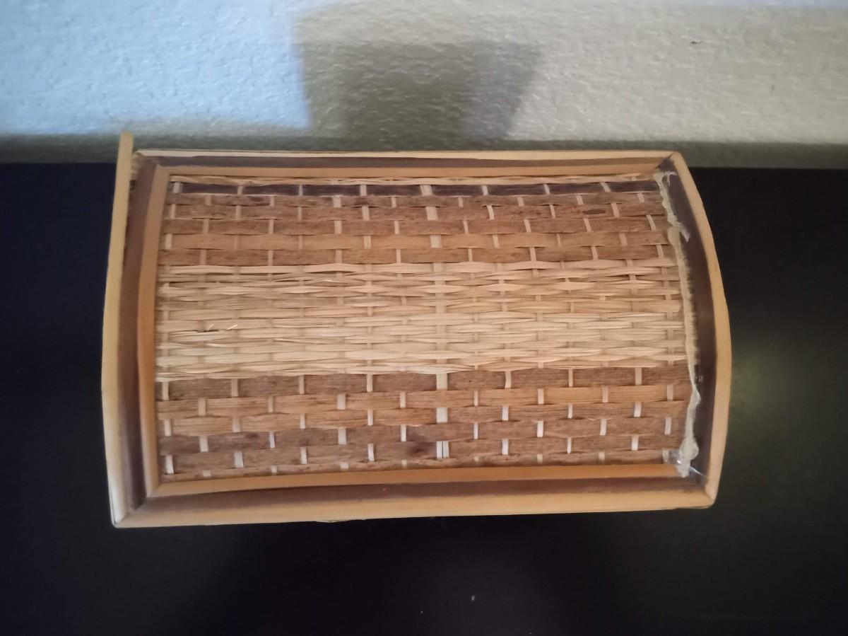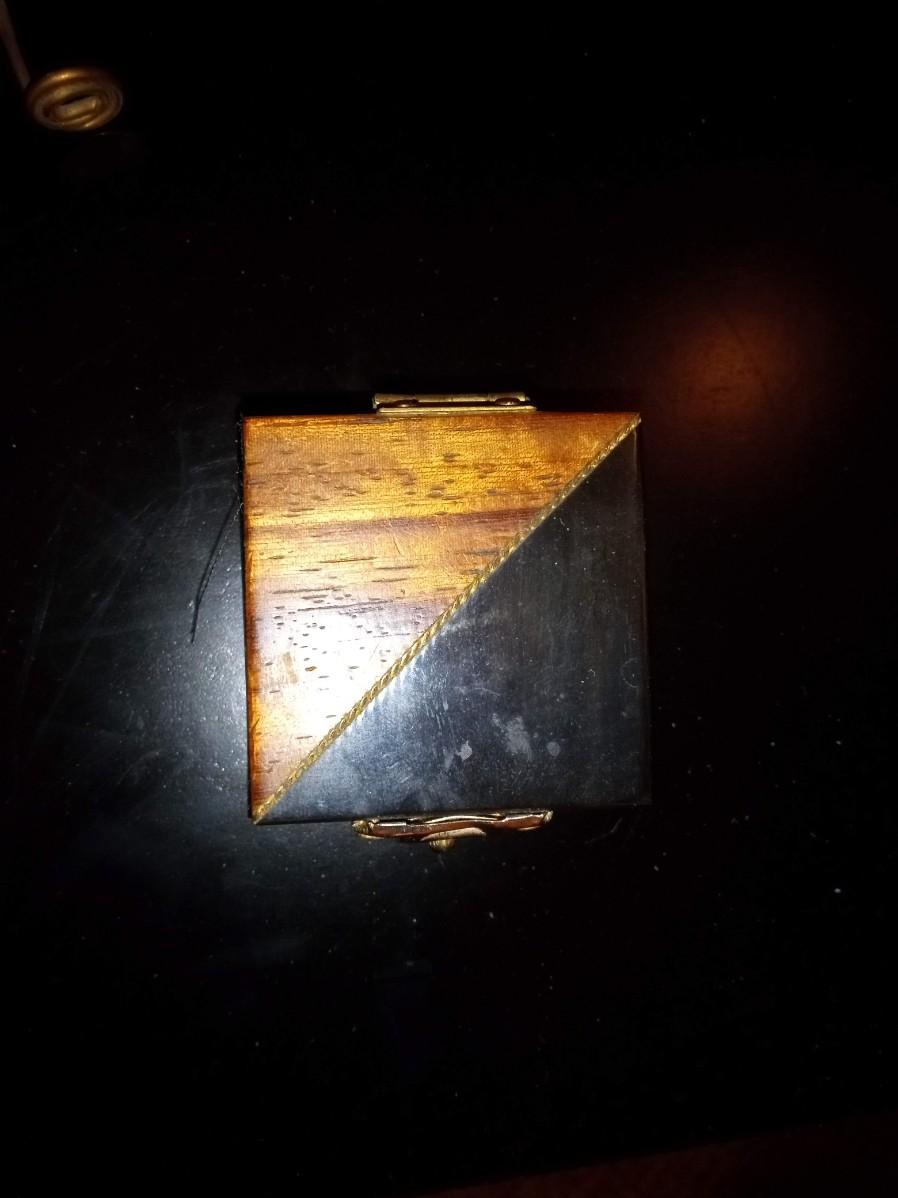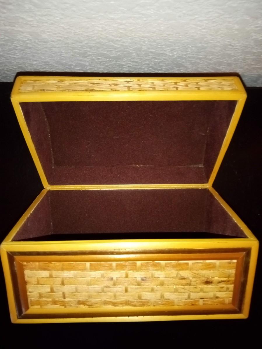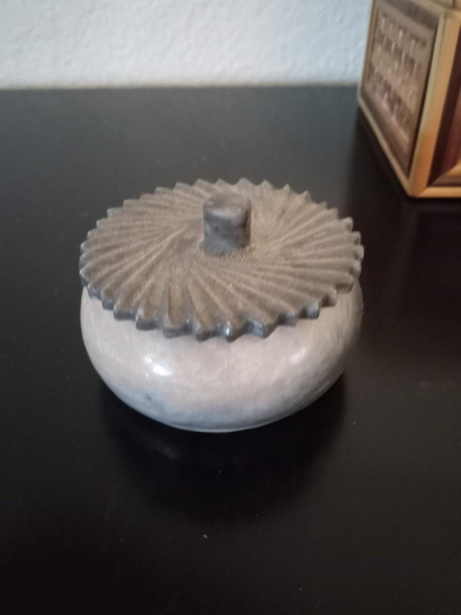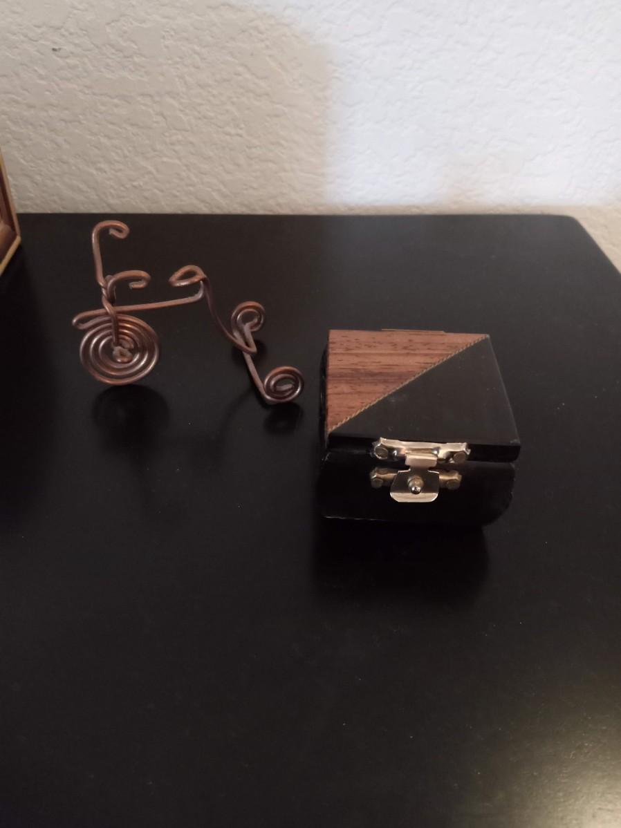 ROUND MARBLE TRINKET BOX, HINGED SMALL WOODEN BOX, HINGED STRAW LIKE COVERED BOX AND A COPPER TRIKE