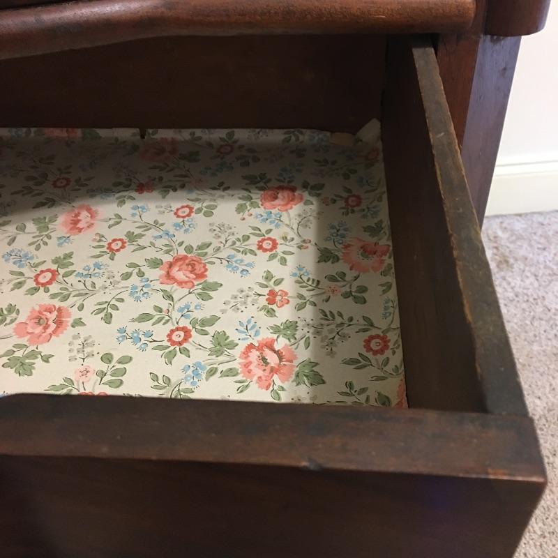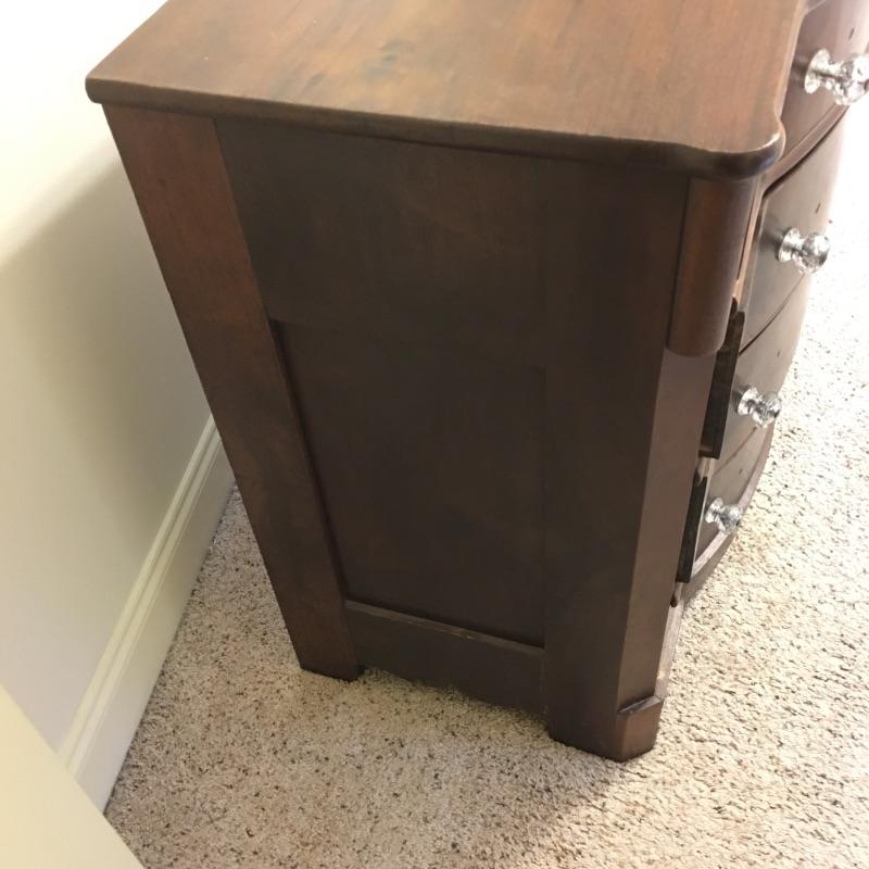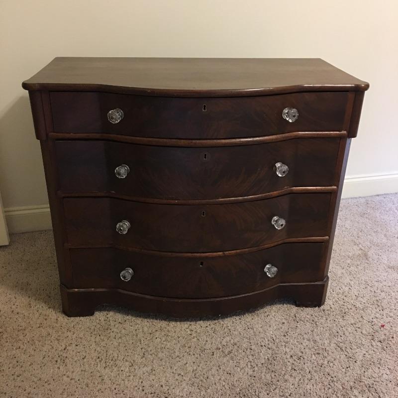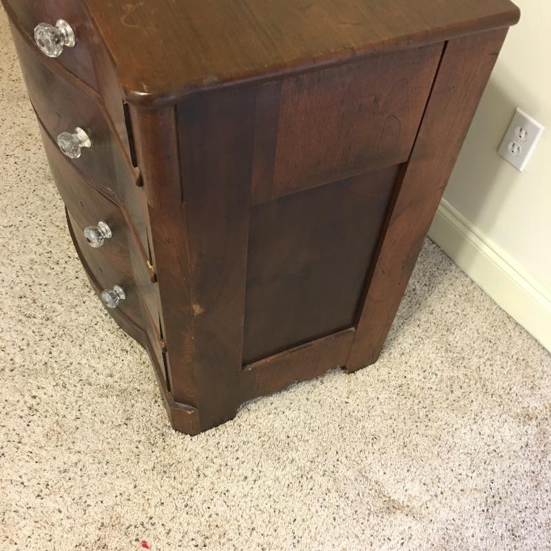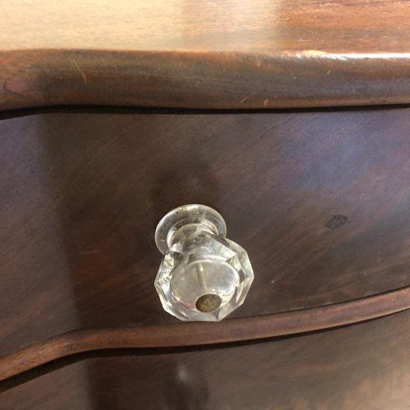 Antique chest of drawers has four dovetailed drawers and glass knobs. Chest is in good shape with no key and the key latch missing on bottom drawer, also top is loose, see pictures. A lovely chest with a few blemishes that just add to its character. Color appears slightly lighter than the first picture. Chest measures 21” x 40” x 33”.
