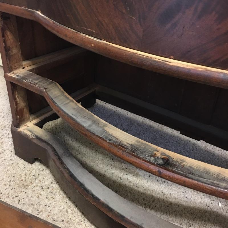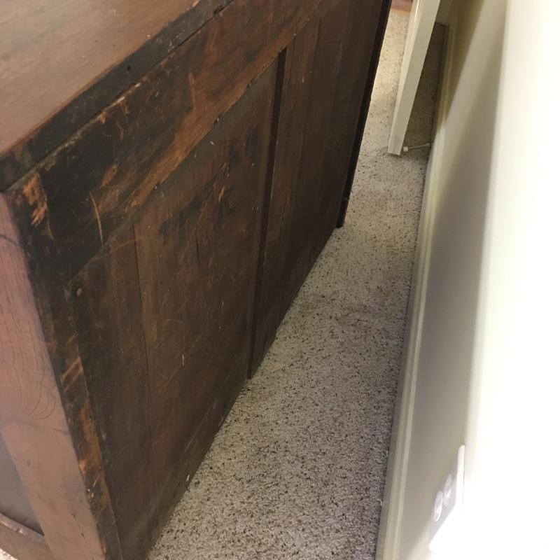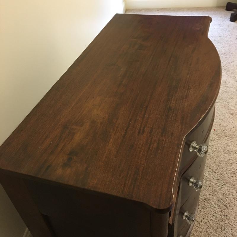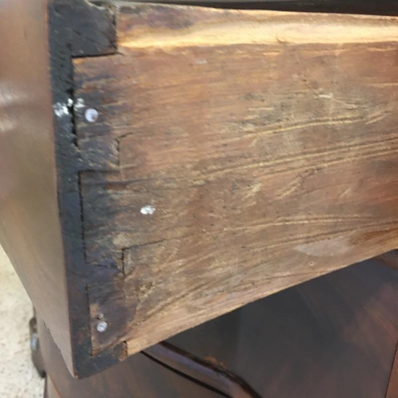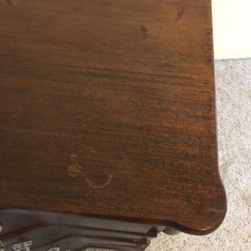 Antique chest of drawers has four dovetailed drawers and glass knobs. Chest is in good shape with no key and the key latch missing on bottom drawer, also top is loose, see pictures. A lovely chest with a few blemishes that just add to its character. Color appears slightly lighter than the first picture. Chest measures 21” x 40” x 33”.