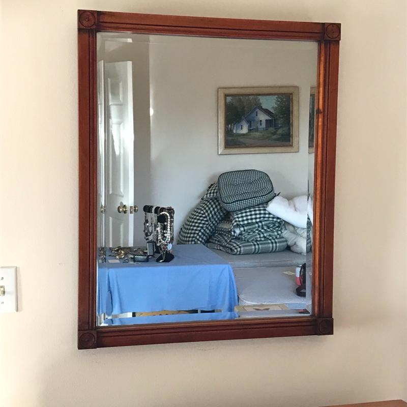 This beautiful antique mirror is in great condition and matches the dresser in lot 114. 33”h x 27”w.