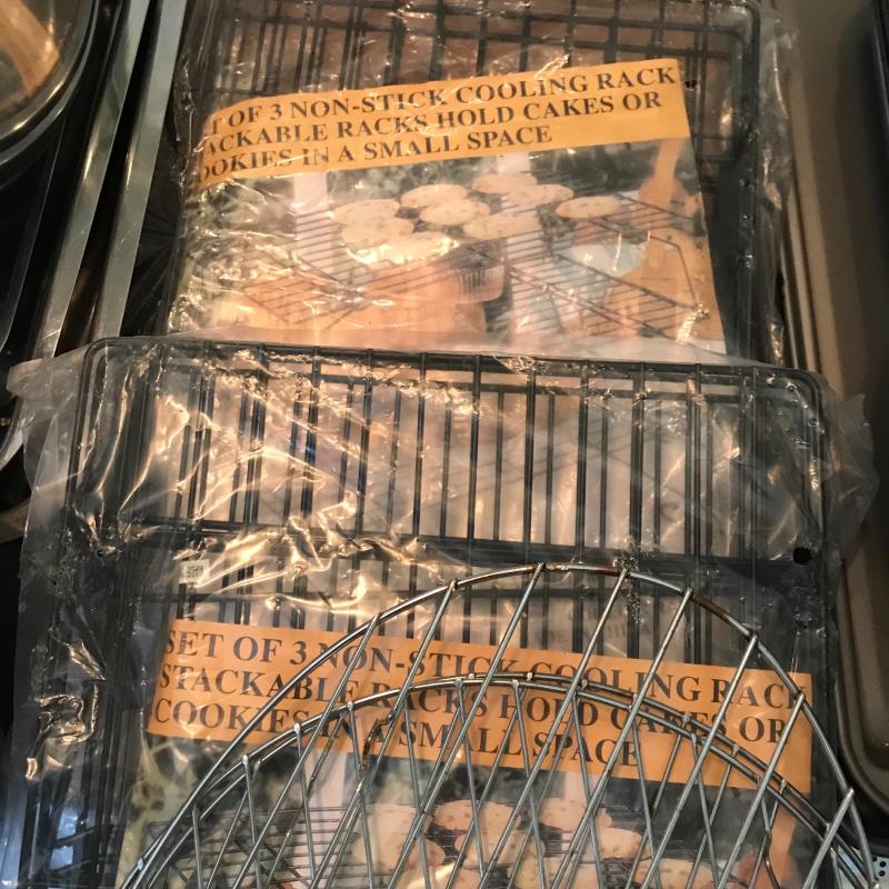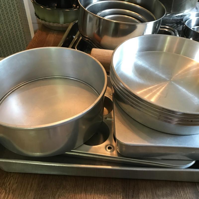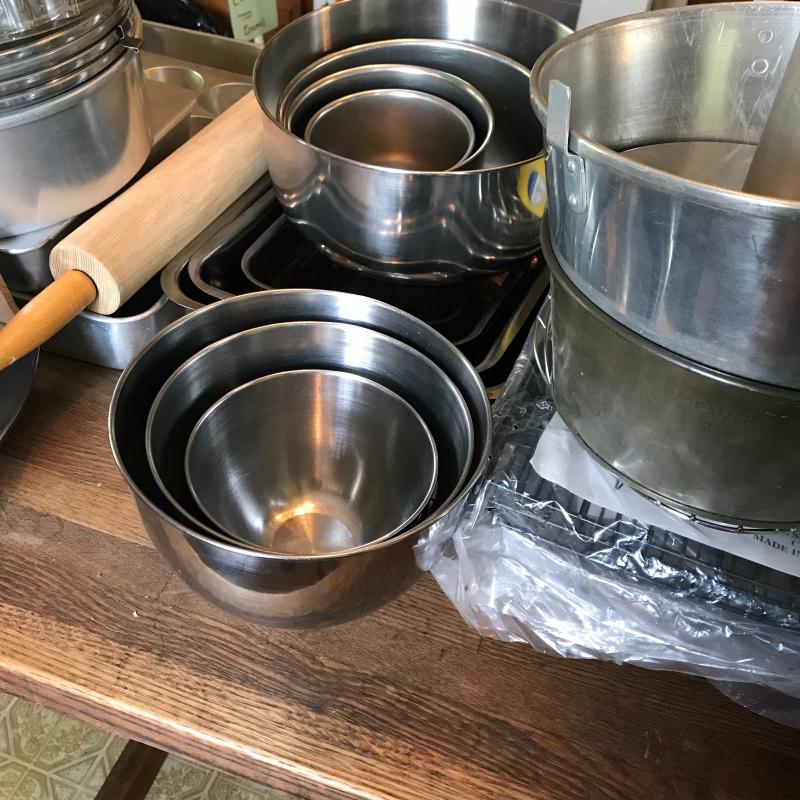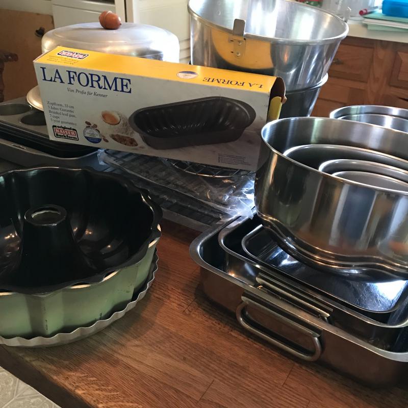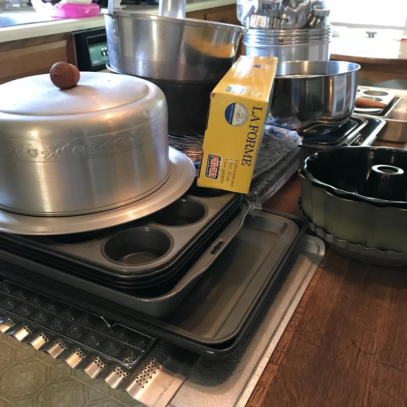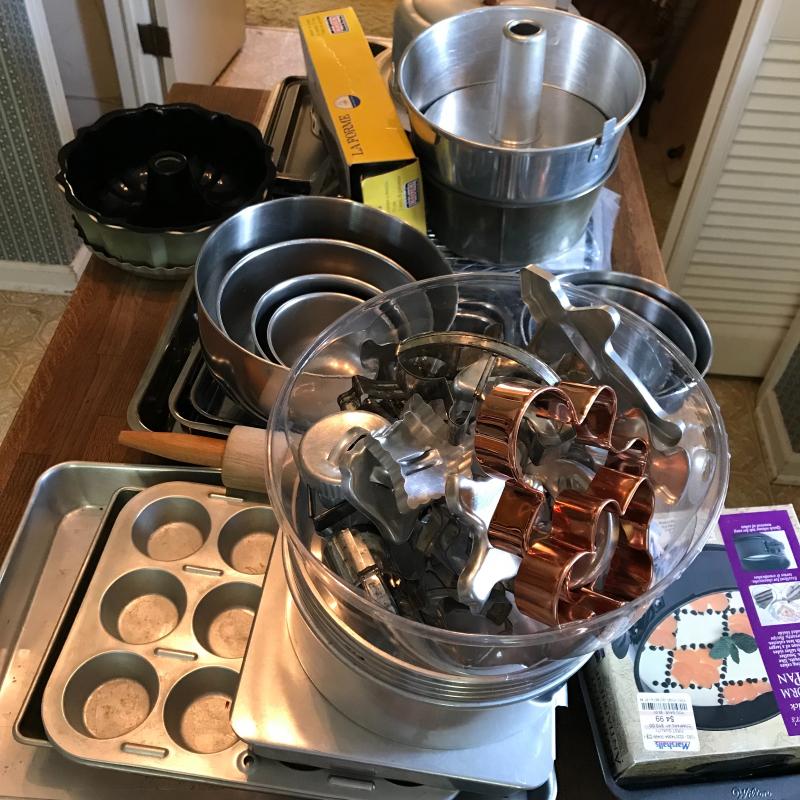 Huge lot of baking necessities including cookie cutters for most seasons, 2 sets of nesting mixing bowls, 2 bundt pans, aluminum cake and muffin pans, multiple drying racks, a cake plate and more! See photos, local pick up only.