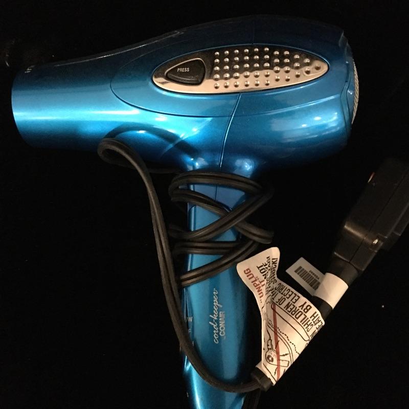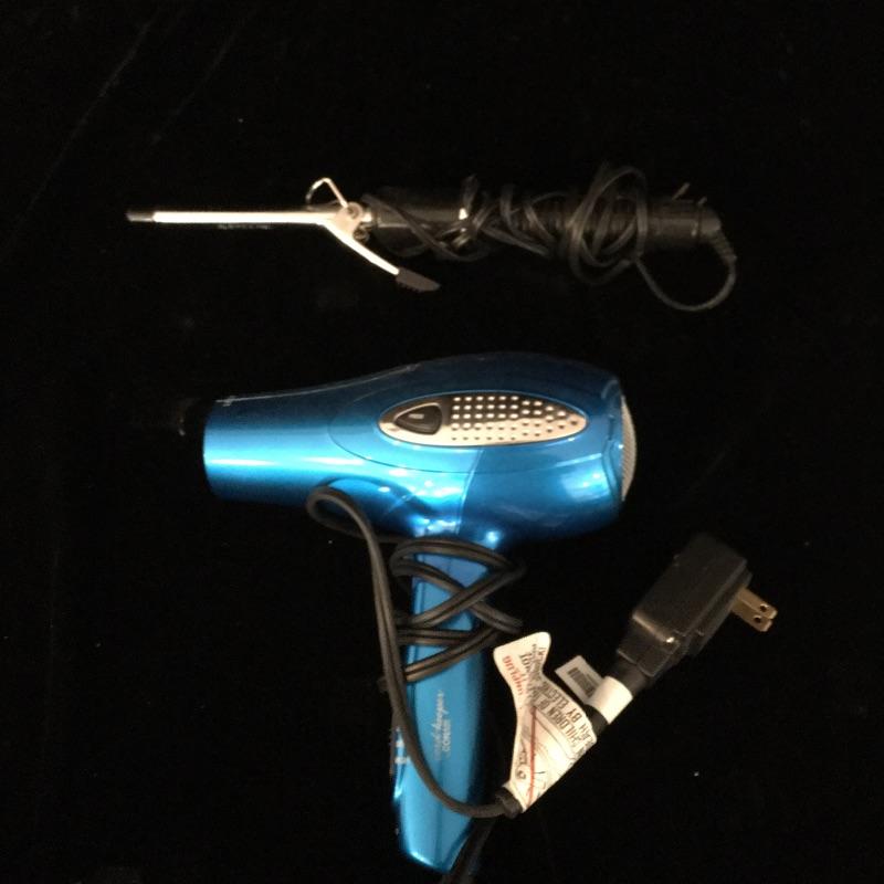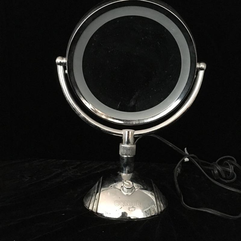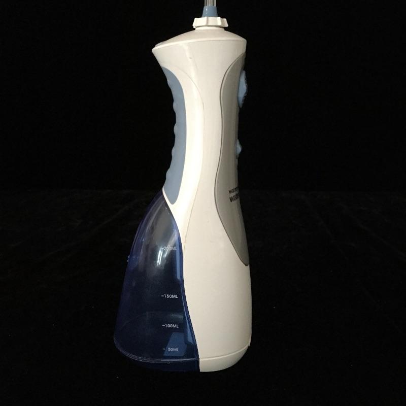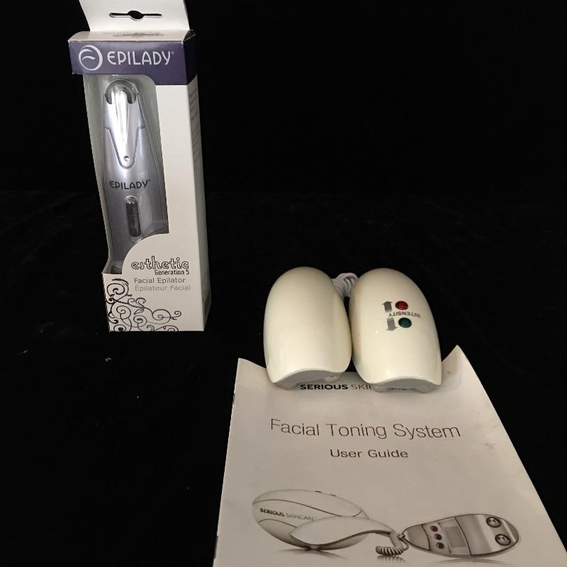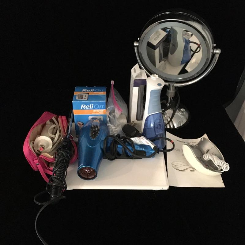 Bathroom essentials include a digital scale, Conair lighted makeup mirror, Epilady, hair dryer, curler, facial toner that could not be tested as battery is dead and a cordless Waterpik waterflosser. Keep yourself groomed with this array of products. Lighted mirror measures 15”tall x 11” wide.