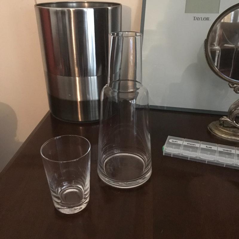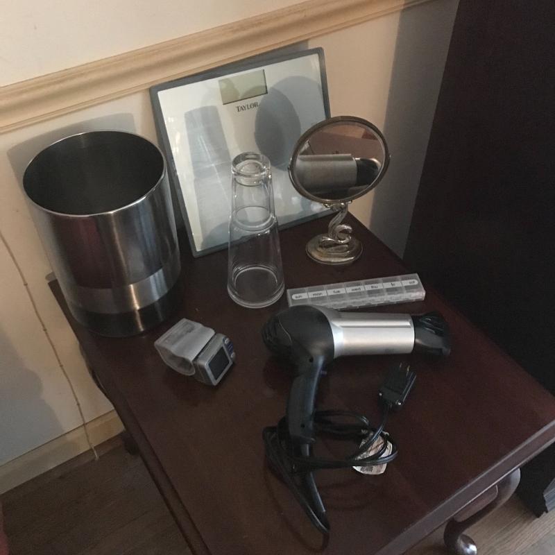 Metal trash can, Taylor scale, hairdryer, dresser mirror, bedside water glass and blood pressure cuff. This lot is available for local pick up in Flat Rock, NC.