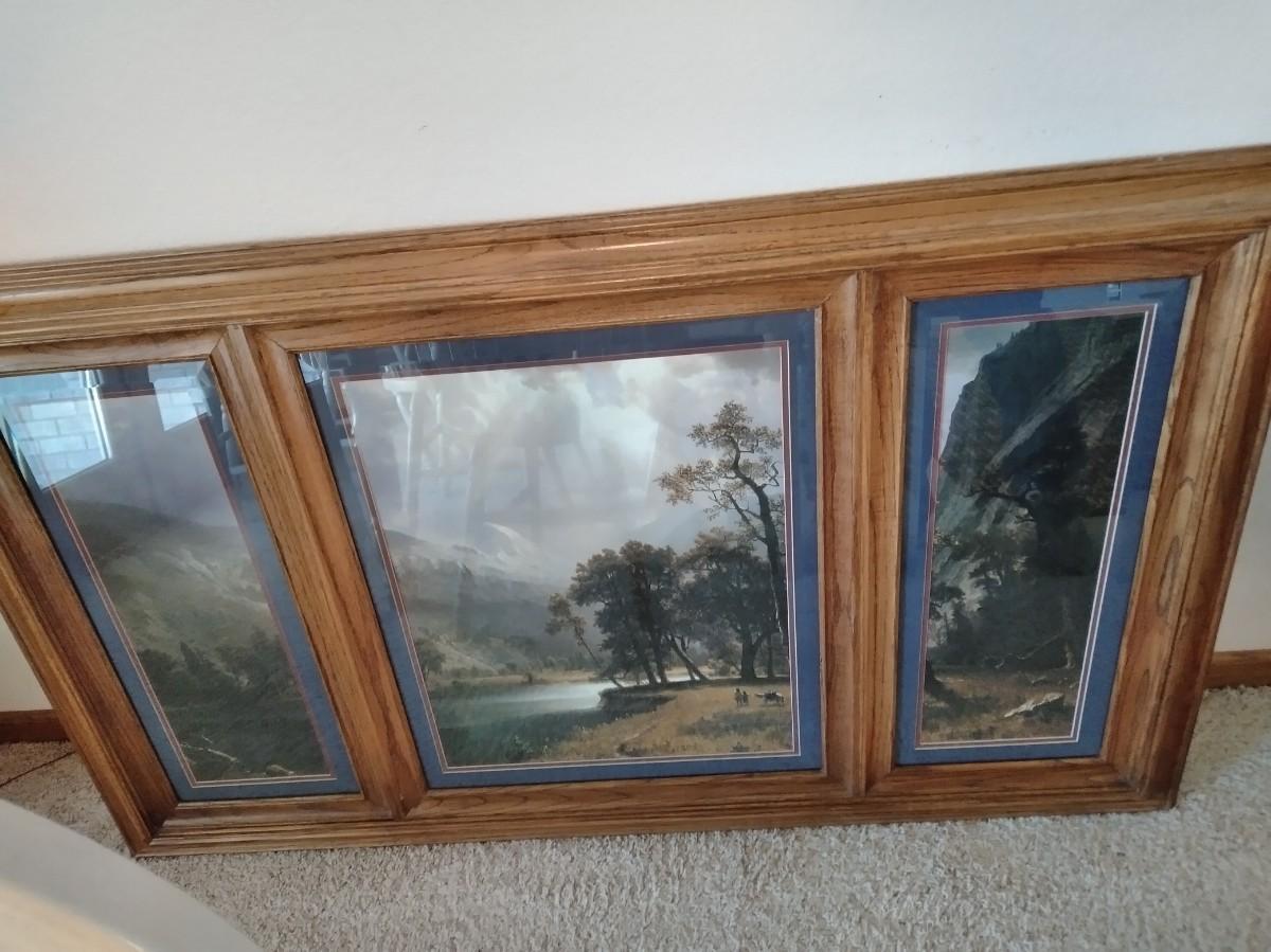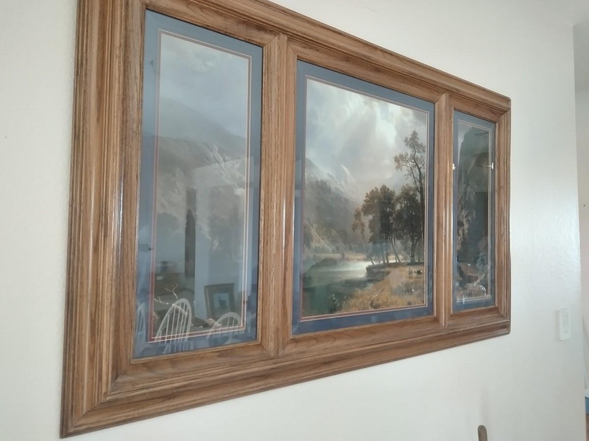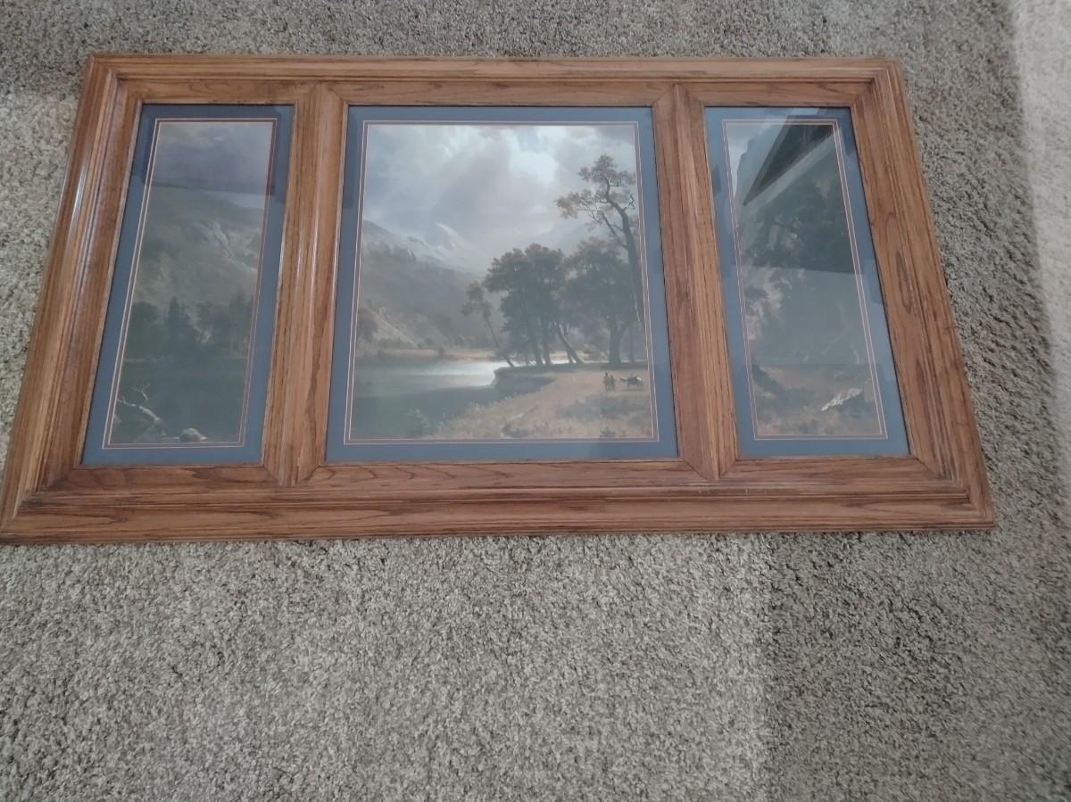 ONE PIECE, THREE FRAMED SCENE ART WORK NATURE, HORSE AND COUPLE ON THE RIVER BANK
