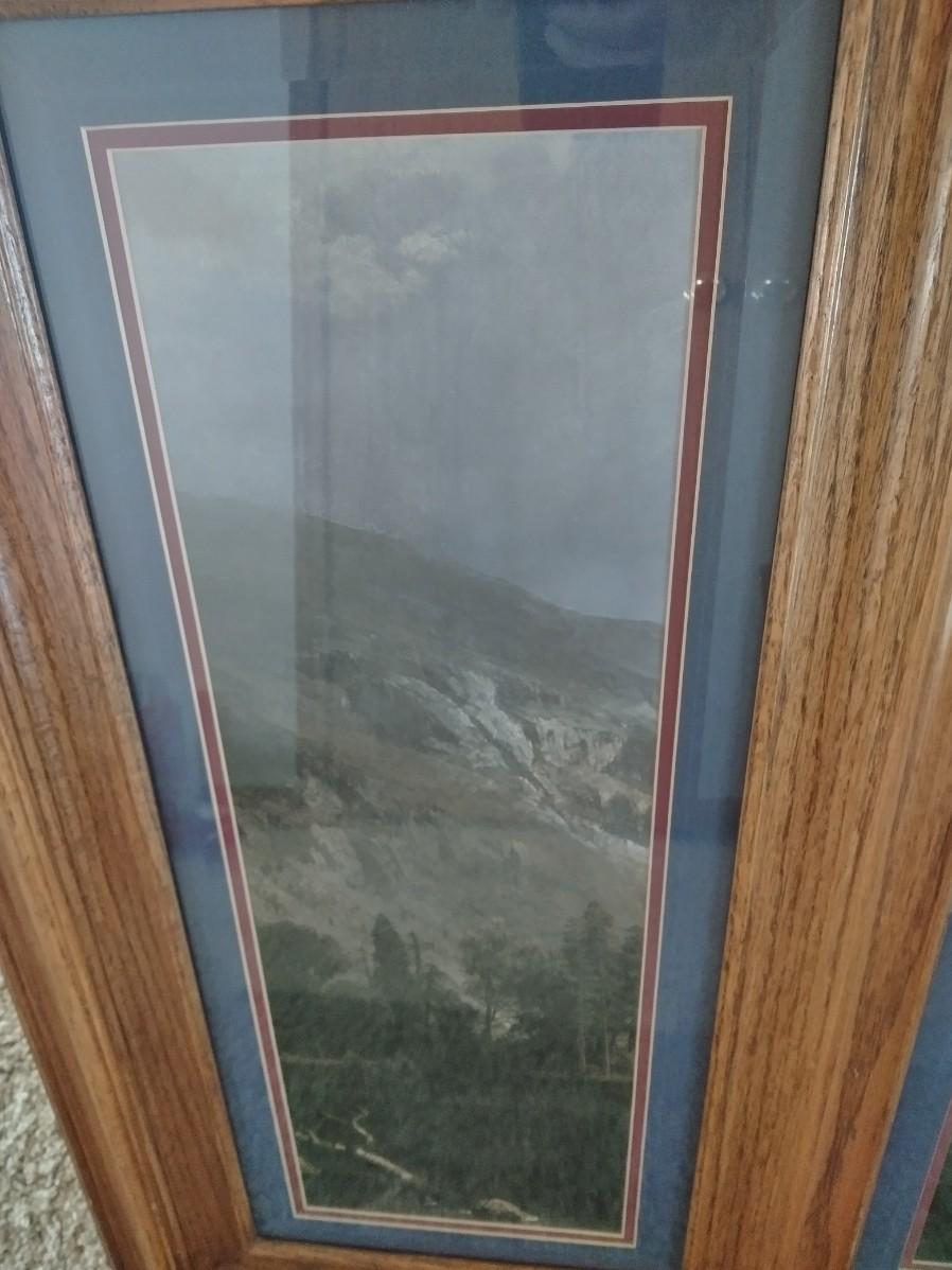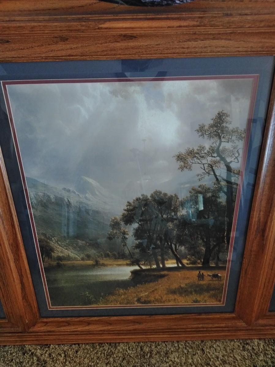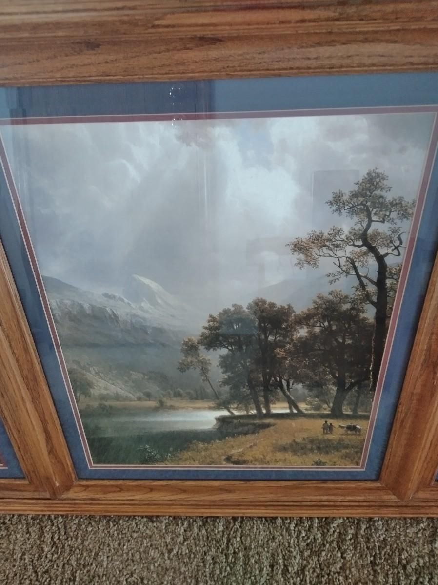 ONE PIECE, THREE FRAMED SCENE ART WORK NATURE, HORSE AND COUPLE ON THE RIVER BANK
