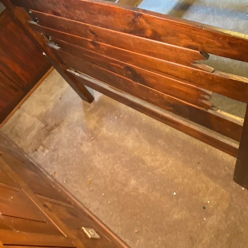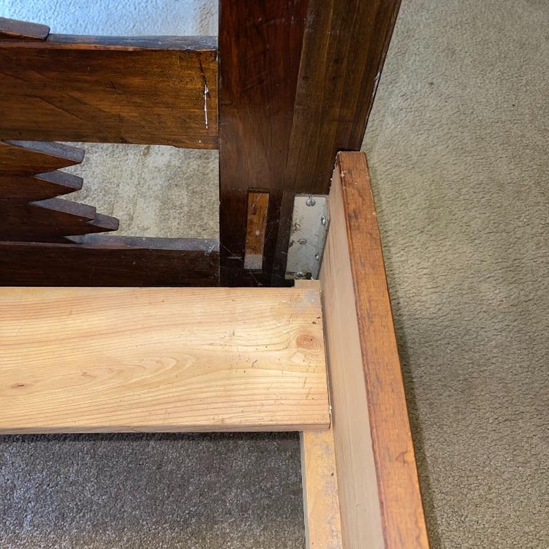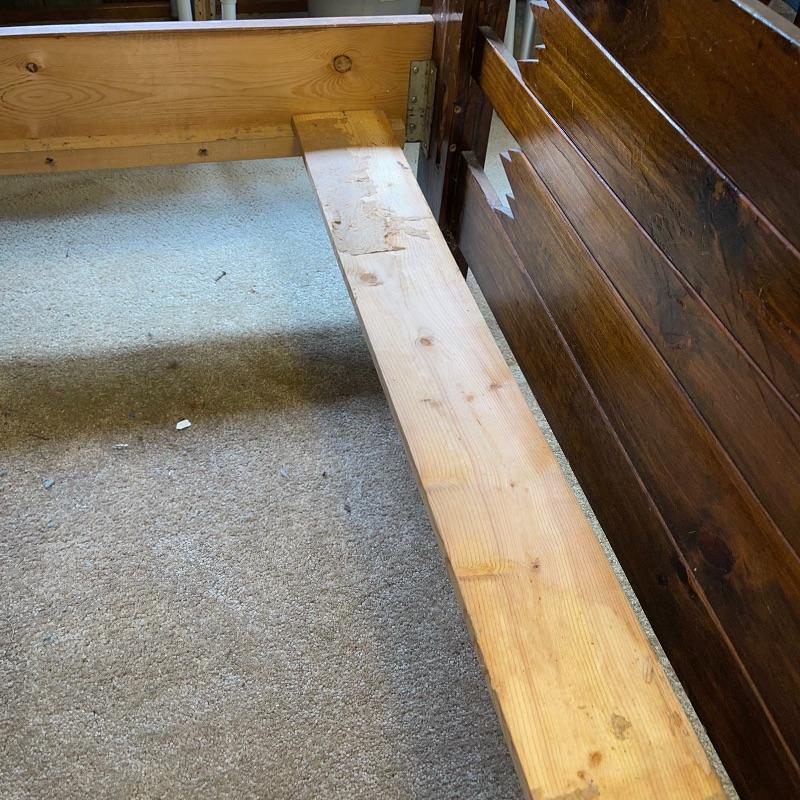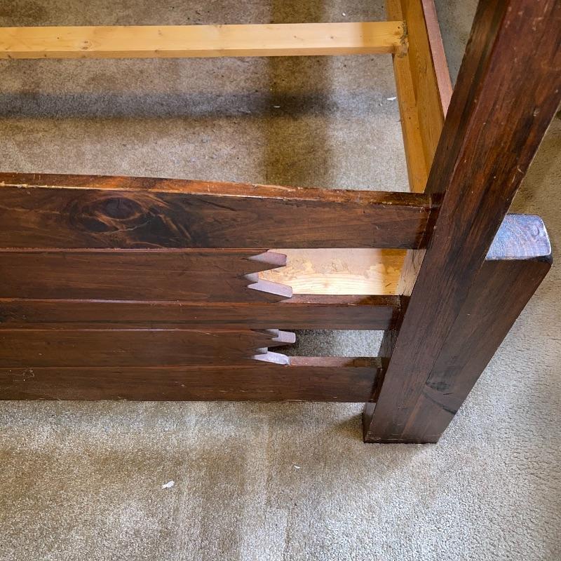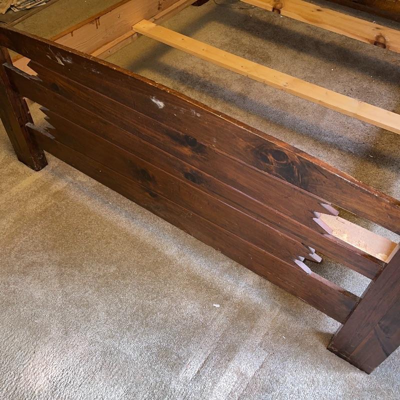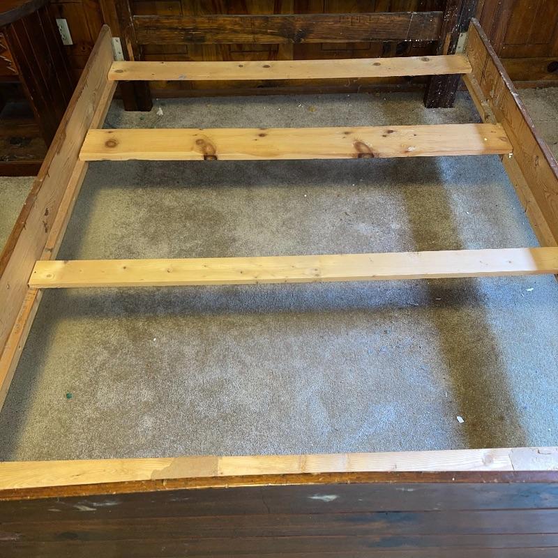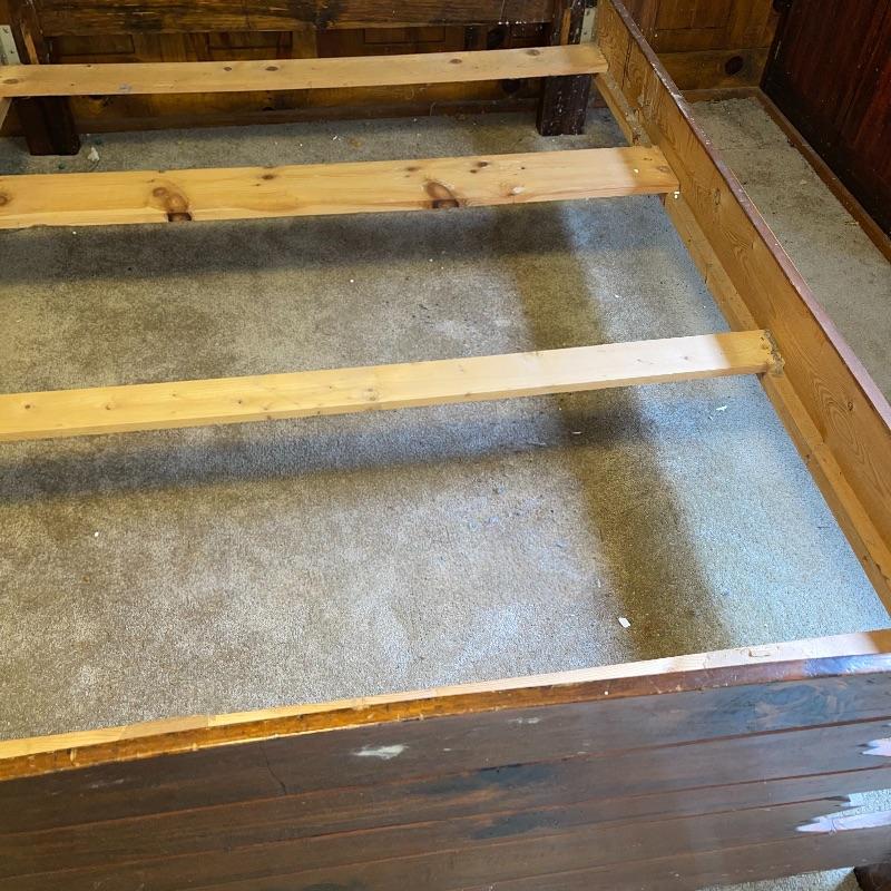Local pickup only. The bedframe can be taken apart by unscrewing corner brackets, there will be three pieces; the headboard, baseboard, and remaining frame due to the slats being nailed in, see photos.