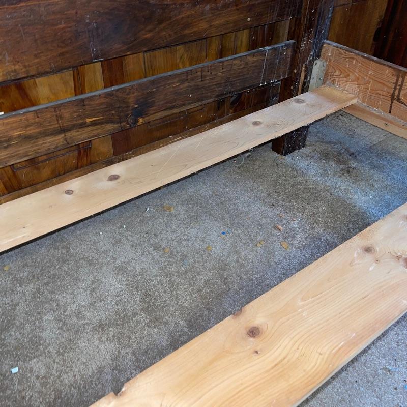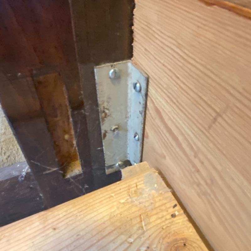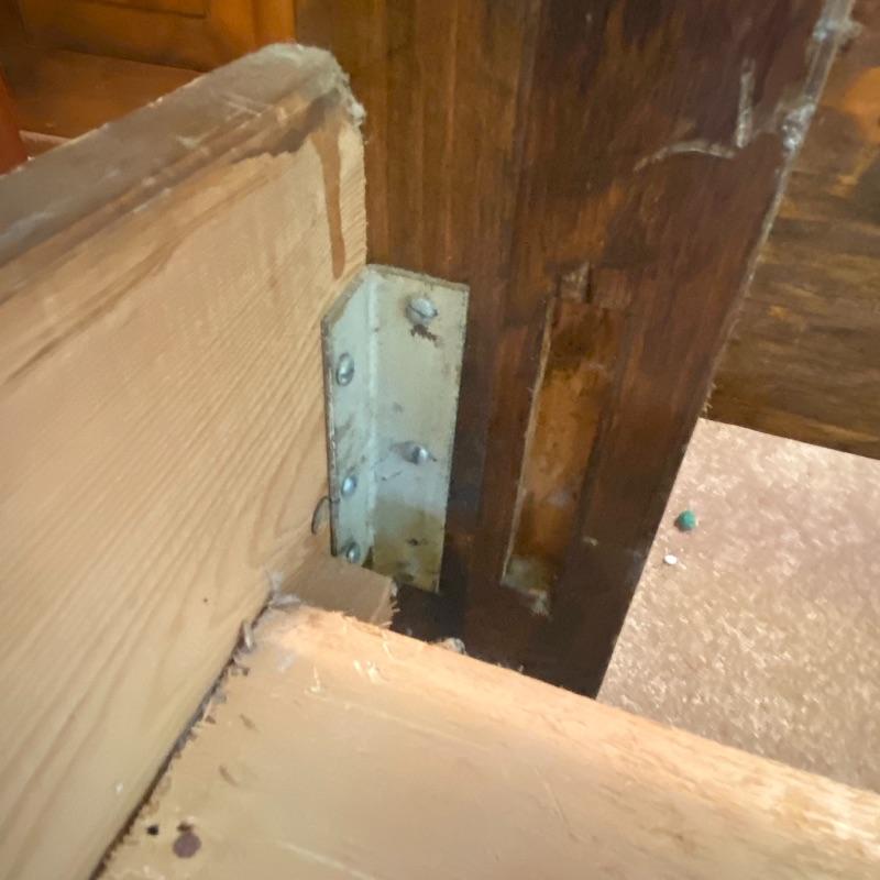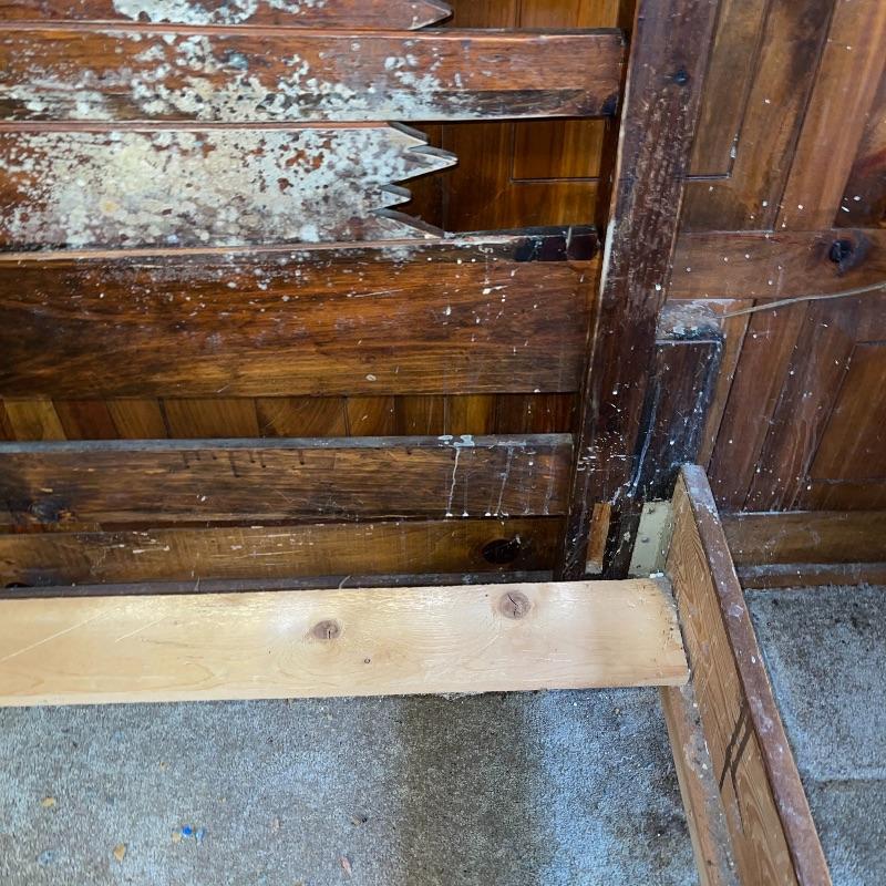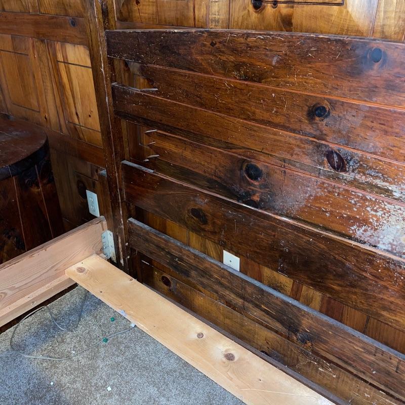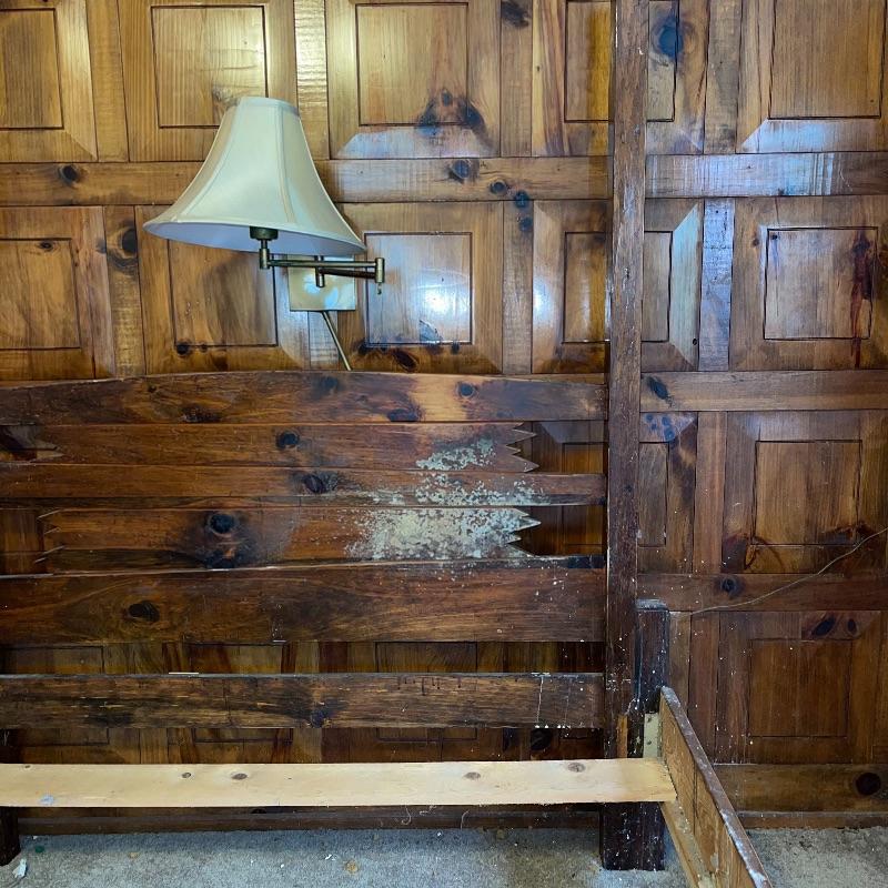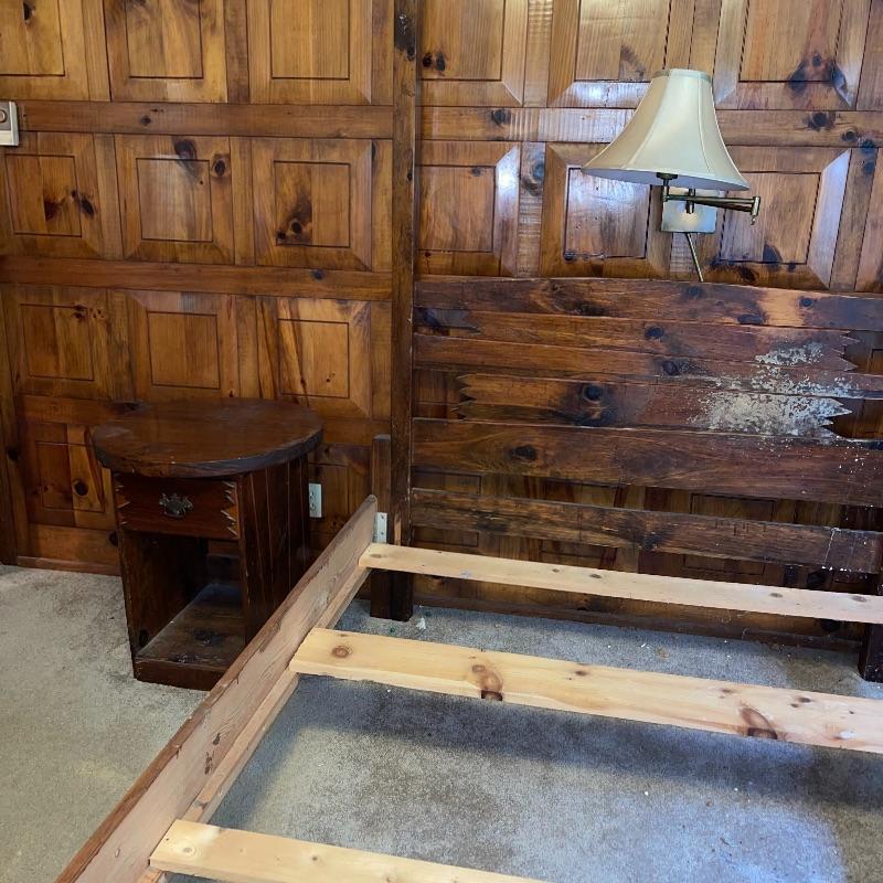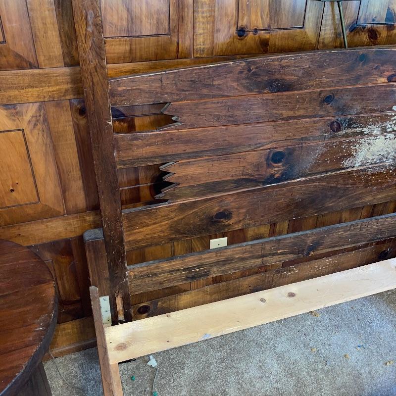 Local pickup only. The bedframe can be taken apart by unscrewing corner brackets, there will be three pieces; the headboard, baseboard, and remaining frame due to the slats being nailed in, see photos.