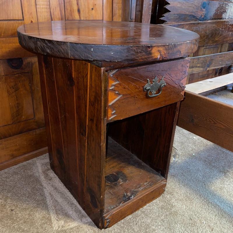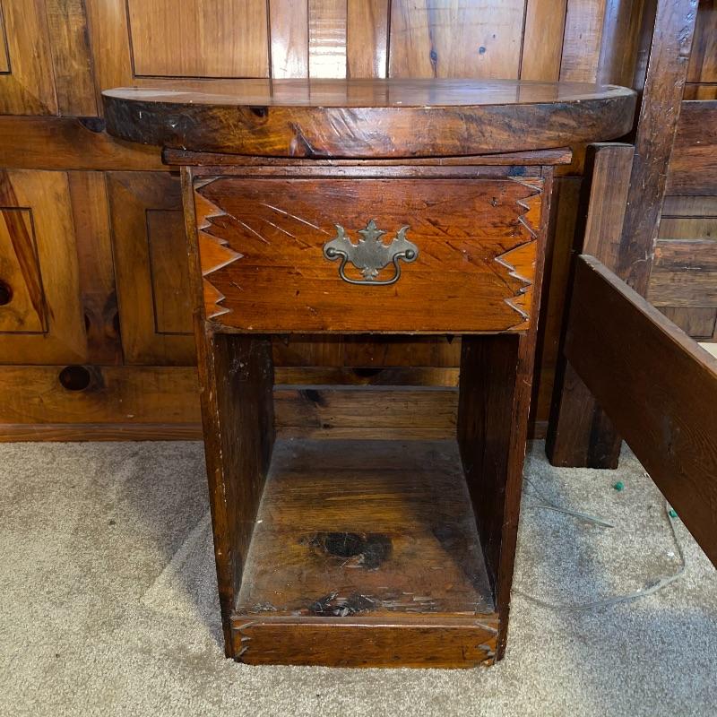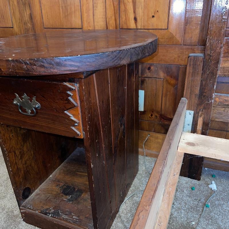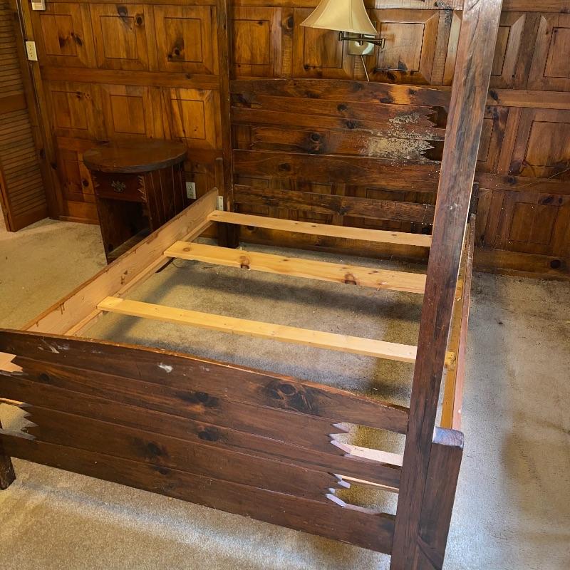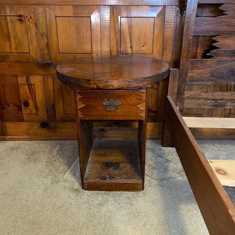 This queen sized hand built bed frame is 7ft 2.75 inches from headboard to baseboard, 5ft 1.75 inches from side to side, and the four posts are 6ft tall. The height from the floor to the support slats is 11.5 inches. It needs to be cleaned and possibly painted/stained. The matching side table is 26.5 inches high and the diameter is 23.5 inches. It has a single drawer and empty storage space below. These items also matching the vanity and bench in lot 112, so if there is interest in a full matching furniture set, please reference both lots.