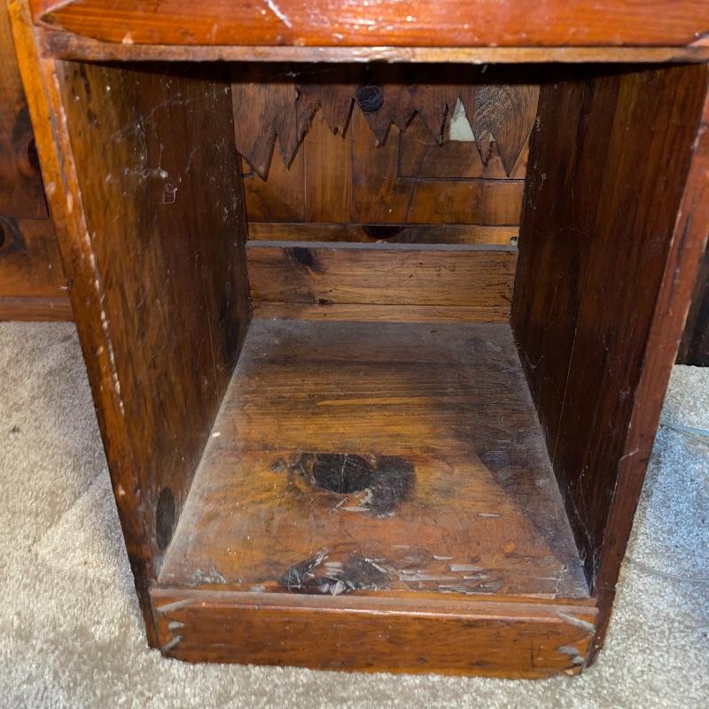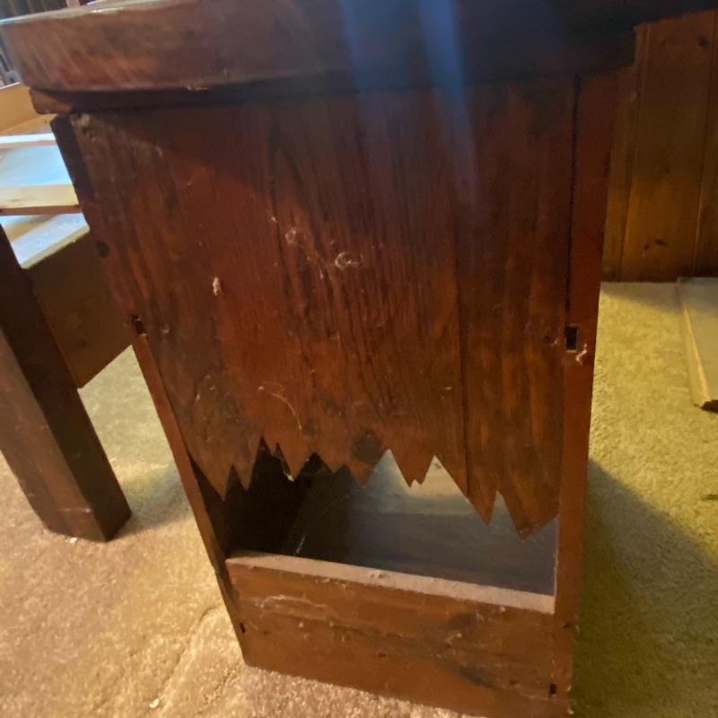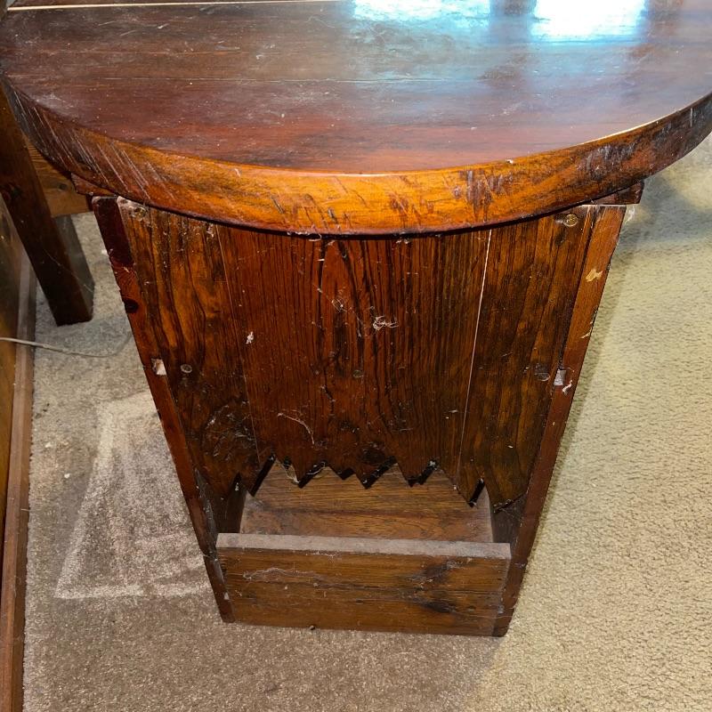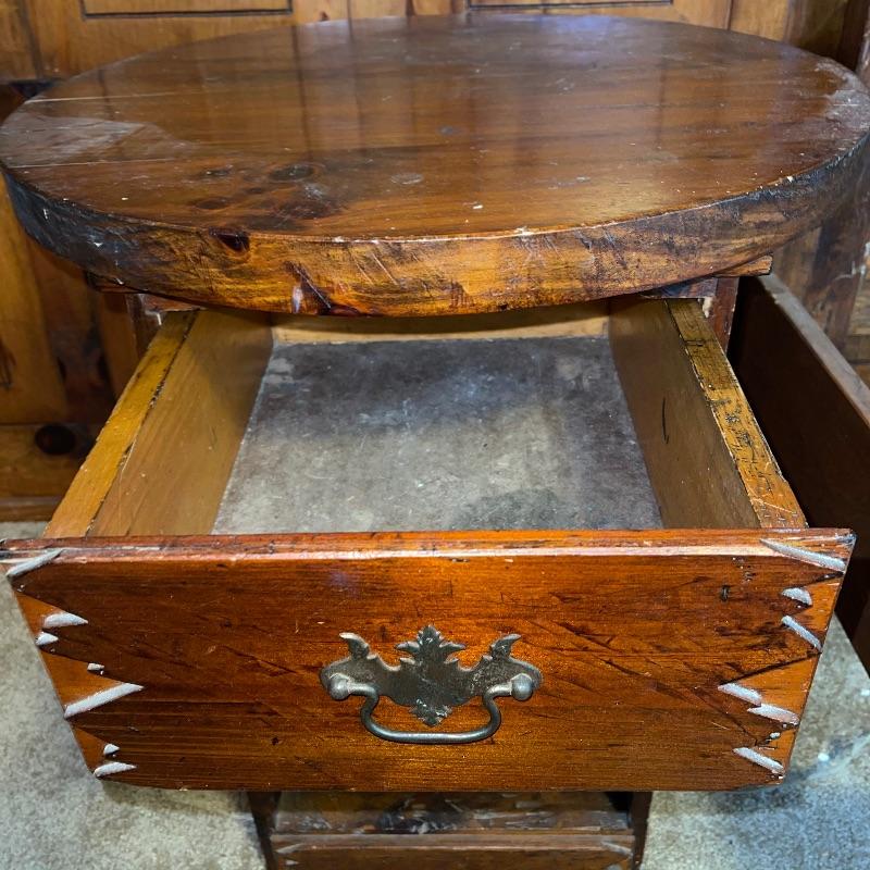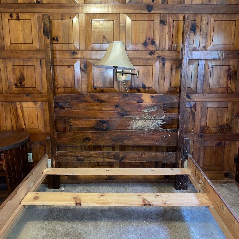 This queen sized hand built bed frame is 7ft 2.75 inches from headboard to baseboard, 5ft 1.75 inches from side to side, and the four posts are 6ft tall. The height from the floor to the support slats is 11.5 inches. It needs to be cleaned and possibly painted/stained. The matching side table is 26.5 inches high and the diameter is 23.5 inches. It has a single drawer and empty storage space below. These items also matching the vanity and bench in lot 112, so if there is interest in a full matching furniture set, please reference both lots.
