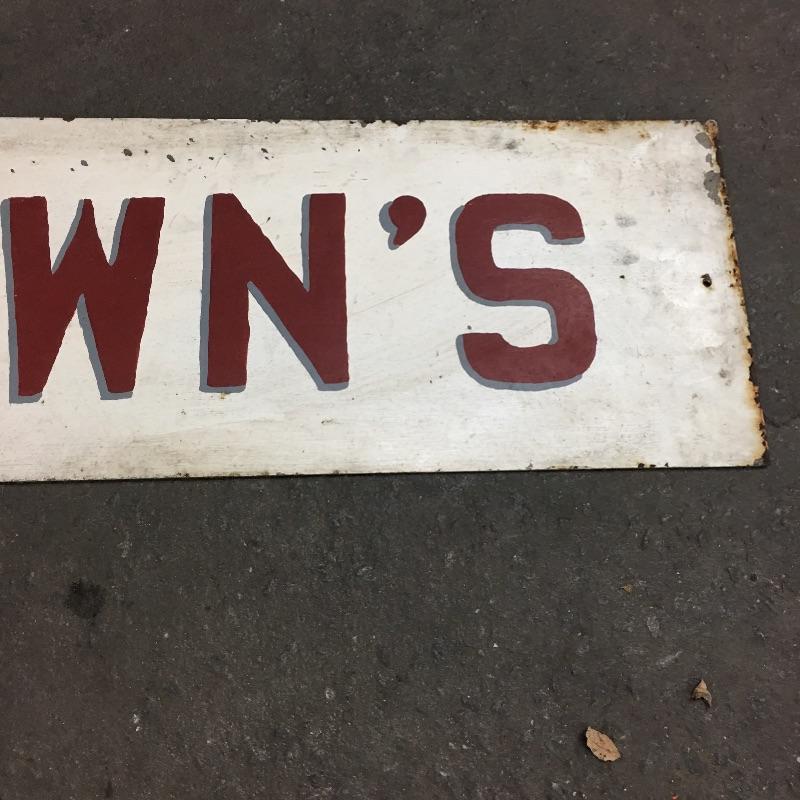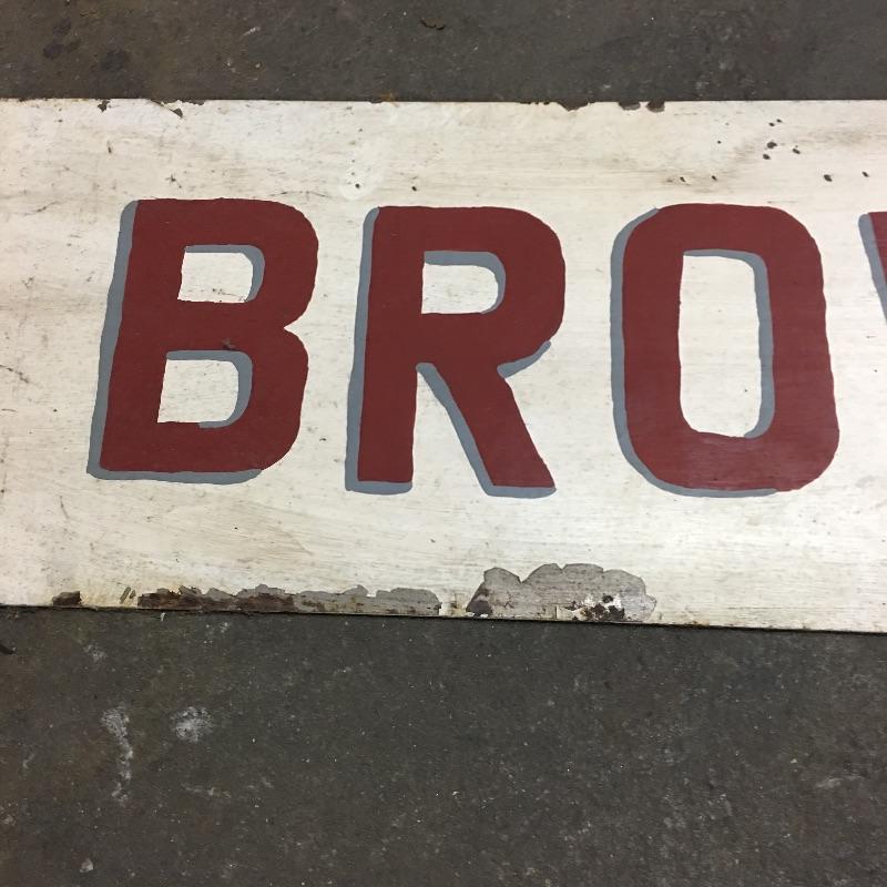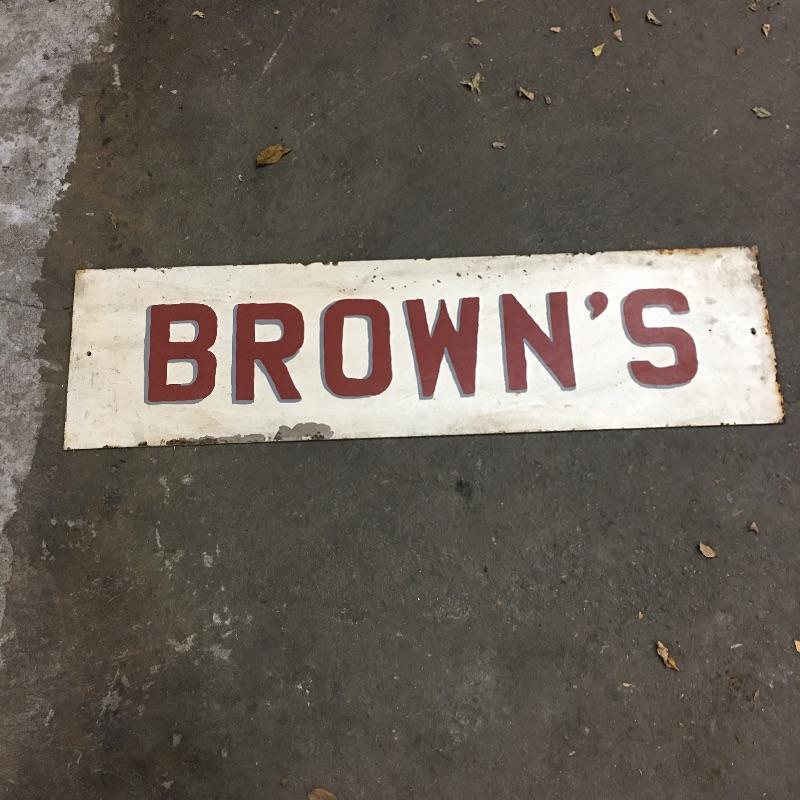 Vintage steel sign with the word Browns painted on. Sign is made of heavy steel and weighs more than you would think. Sign has some scratches and paint chips, see pictures. Sign measures 11” x 40”.
