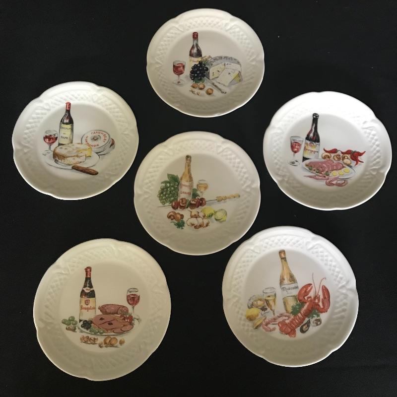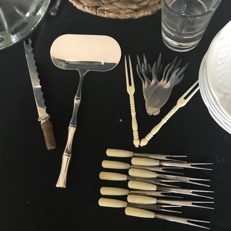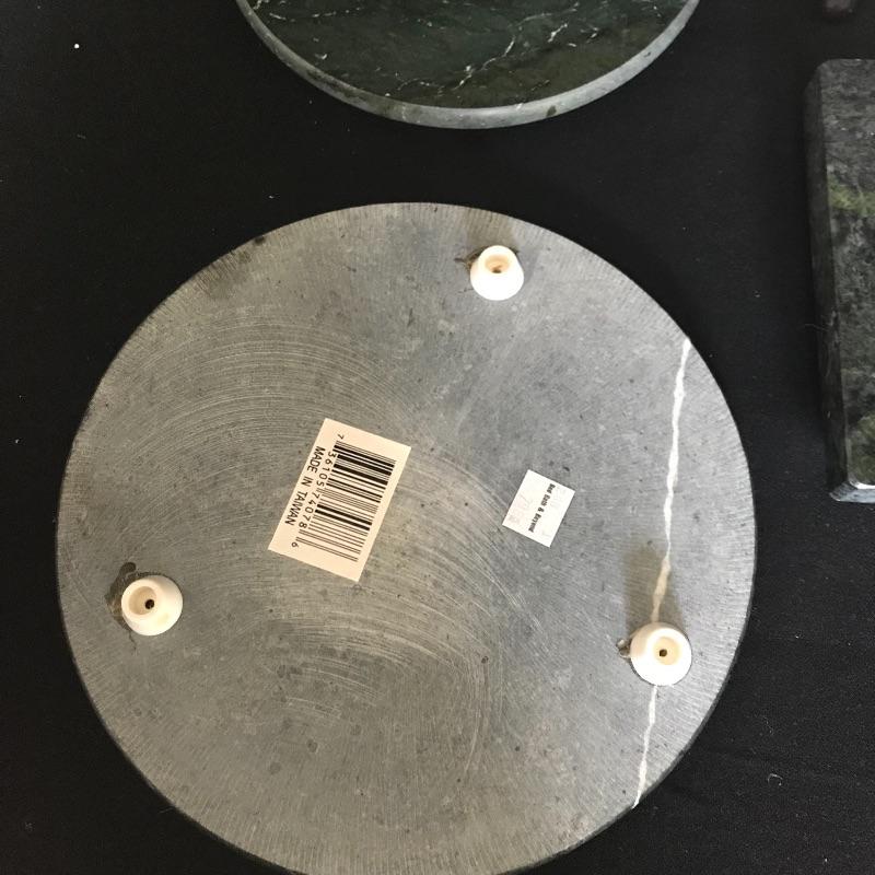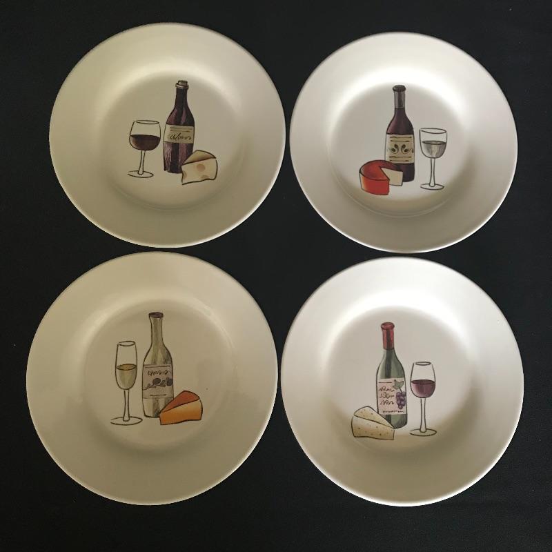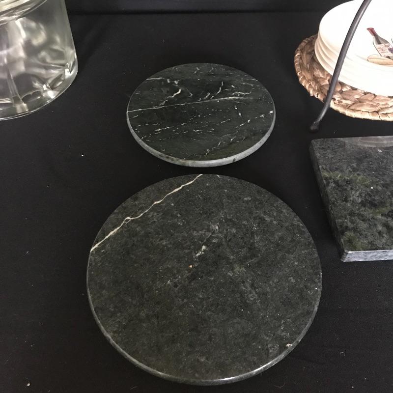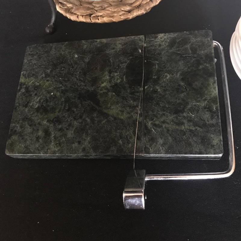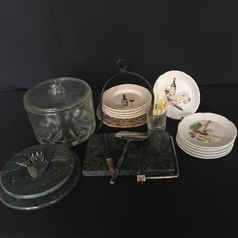 Calling all Cheese lovers! Two sets of wine pairing plates, the smaller six set plates have about 5.75” diameter. Three green marble pieces, two trivets and one fancy cheese slicer. Lot also includes small party forks, a cheese preserver and a metal and woven plate display. Shipping available.