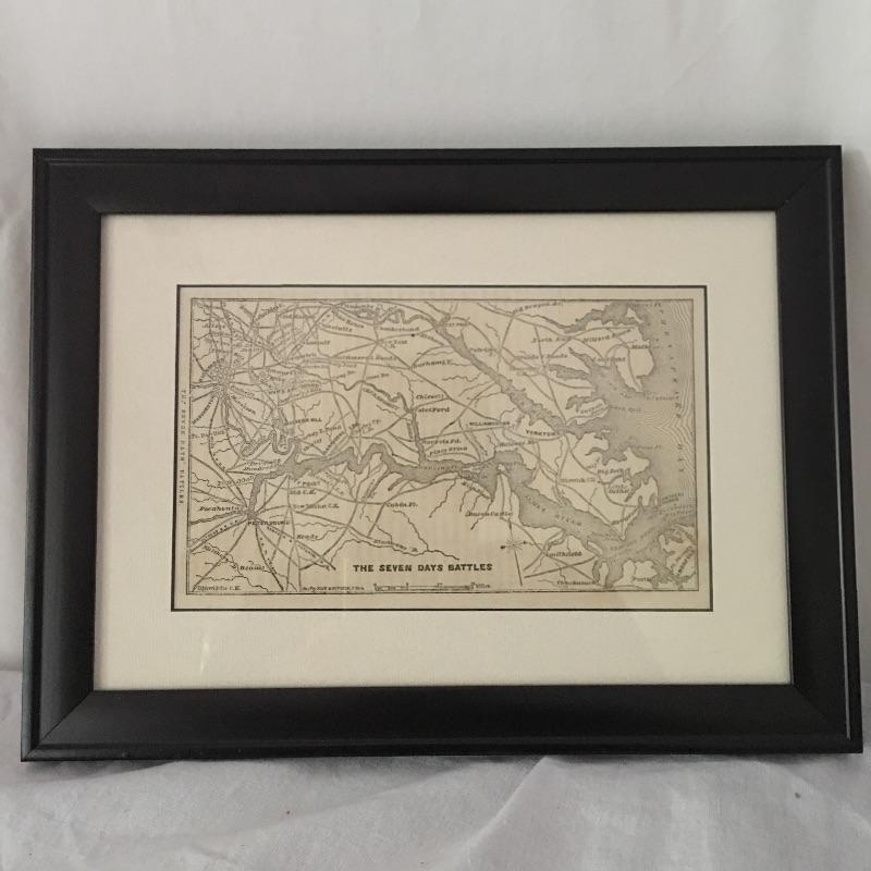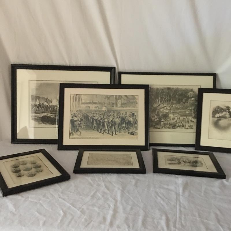 Seven pieces of framed and matted Civil War artwork. Step back in time with this assortment of historical artwork that depicts battle scenes and evokes great emotion. Some of the pieces are titled. All pieces are in similar black frames. Largest frame measures 16.5” x 21.5”.